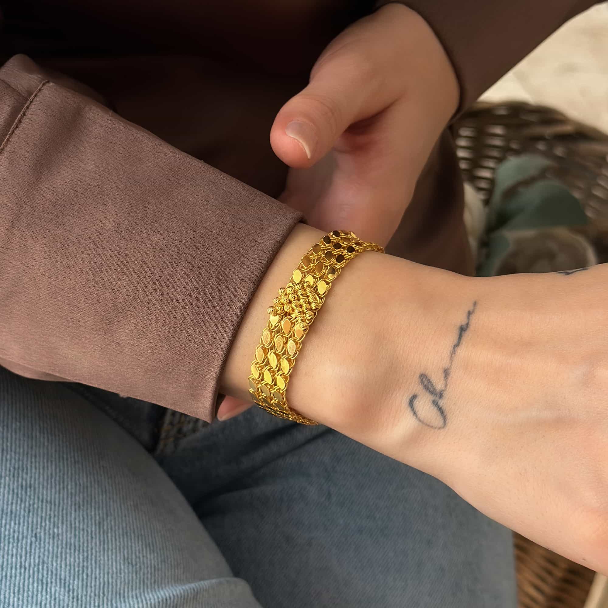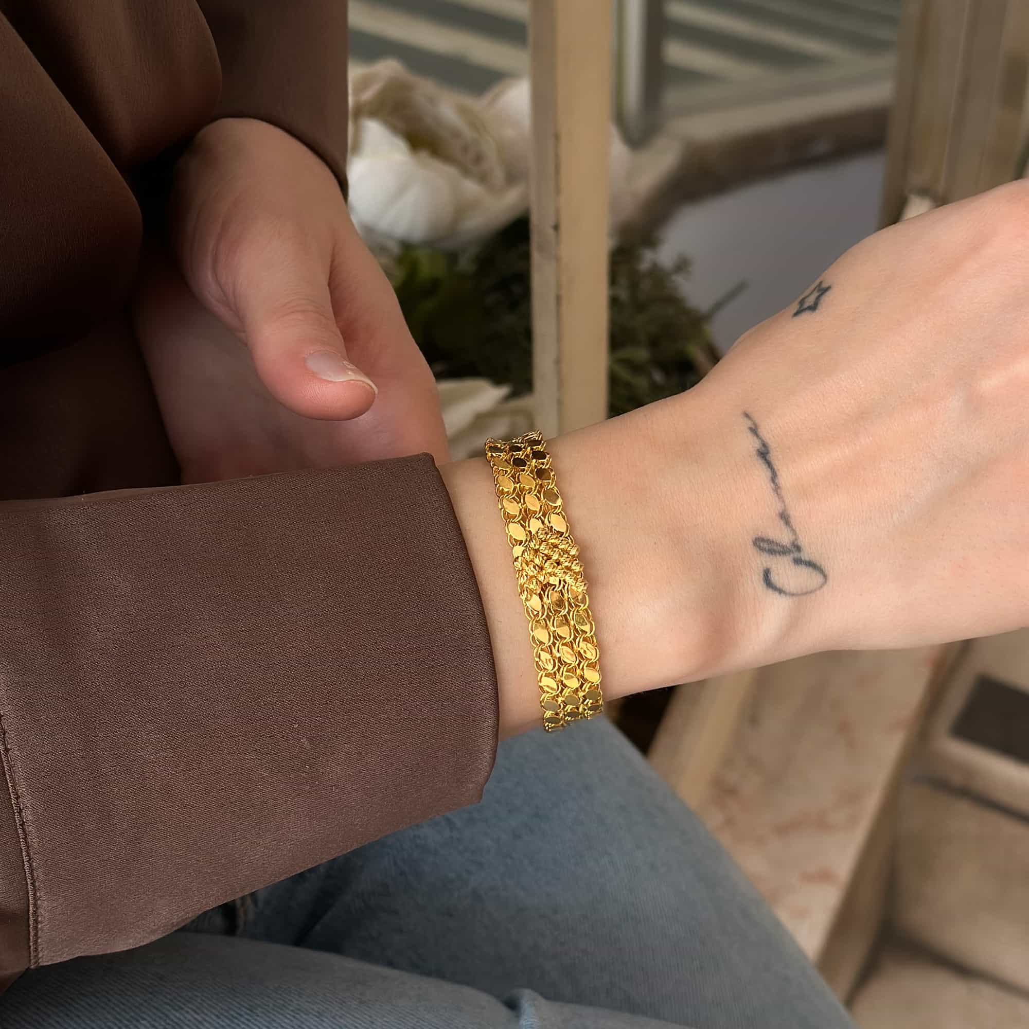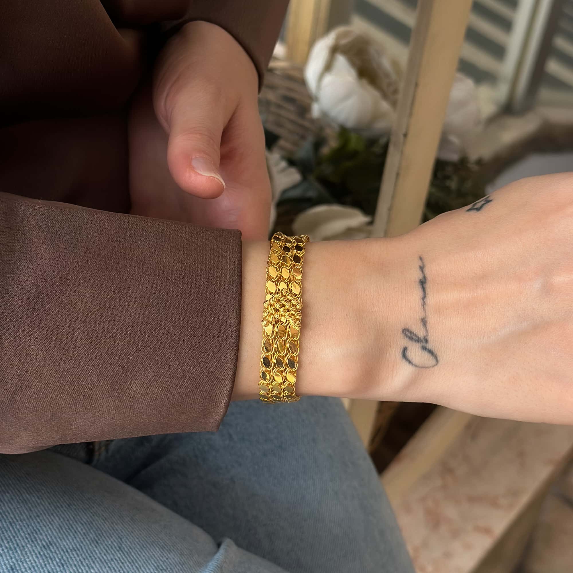 indirim 70.509 TL14 Ayar Şık 3 Sıra Arpa Pullu Dorika Altın Bileklik, modern dorika ışıltısını üç sıra arpa pullu detaylarla birleştirerek zarafeti bileğinize taşır. Işığı her hareketinizde yakalayan bu şık tasarım, günlük stile rafine bir dokunuş katar. Hem özel günlerde hem de günlük kullanımda göz alıcı bir şıklık sunan kalıcı ve zamansız bir altın bilekliktir.