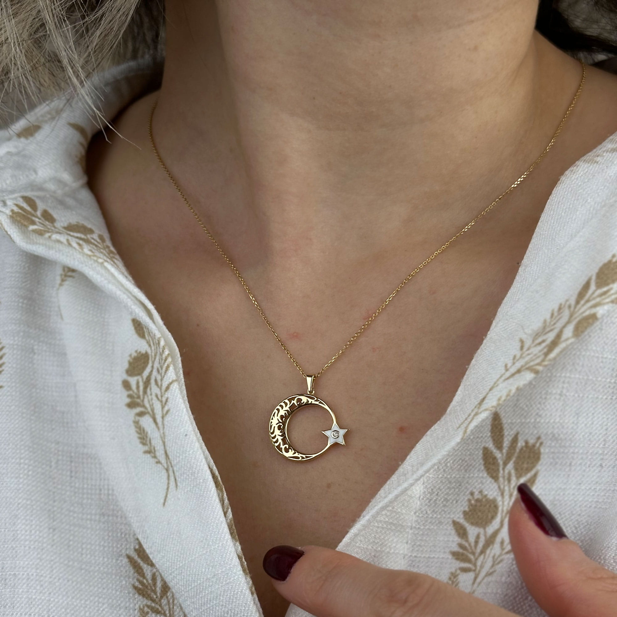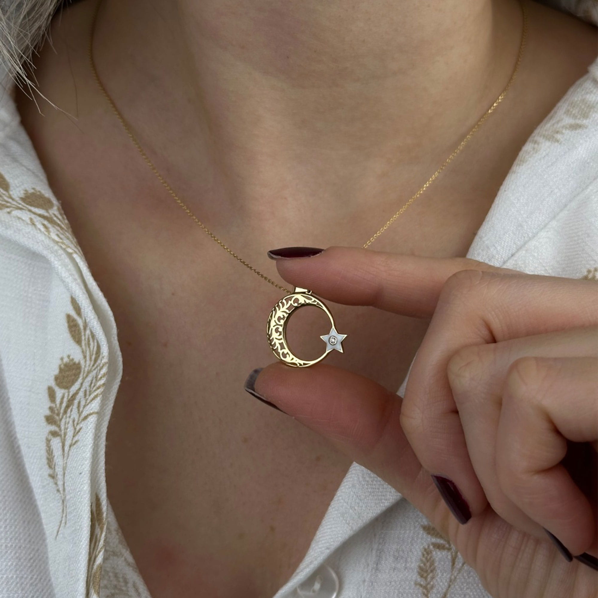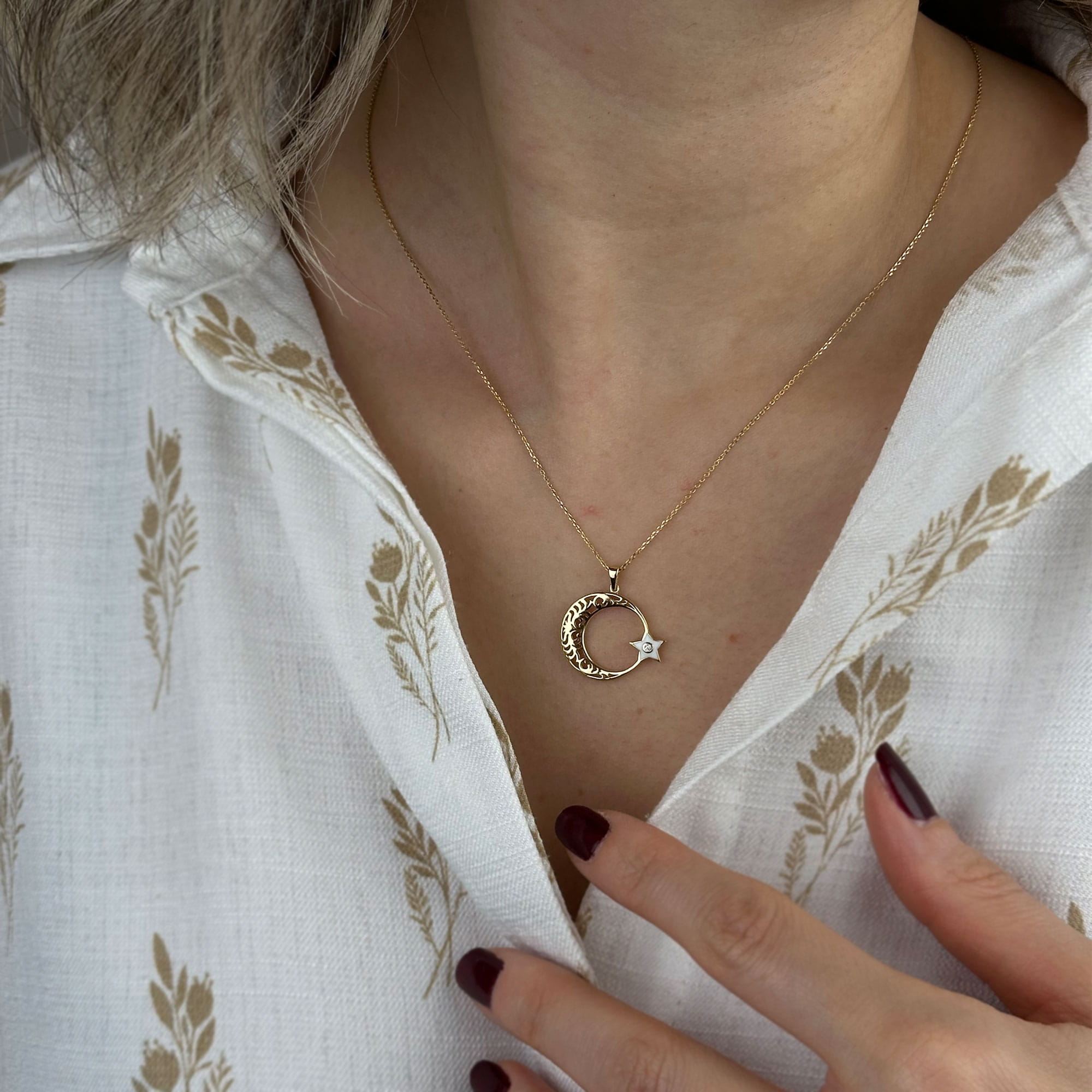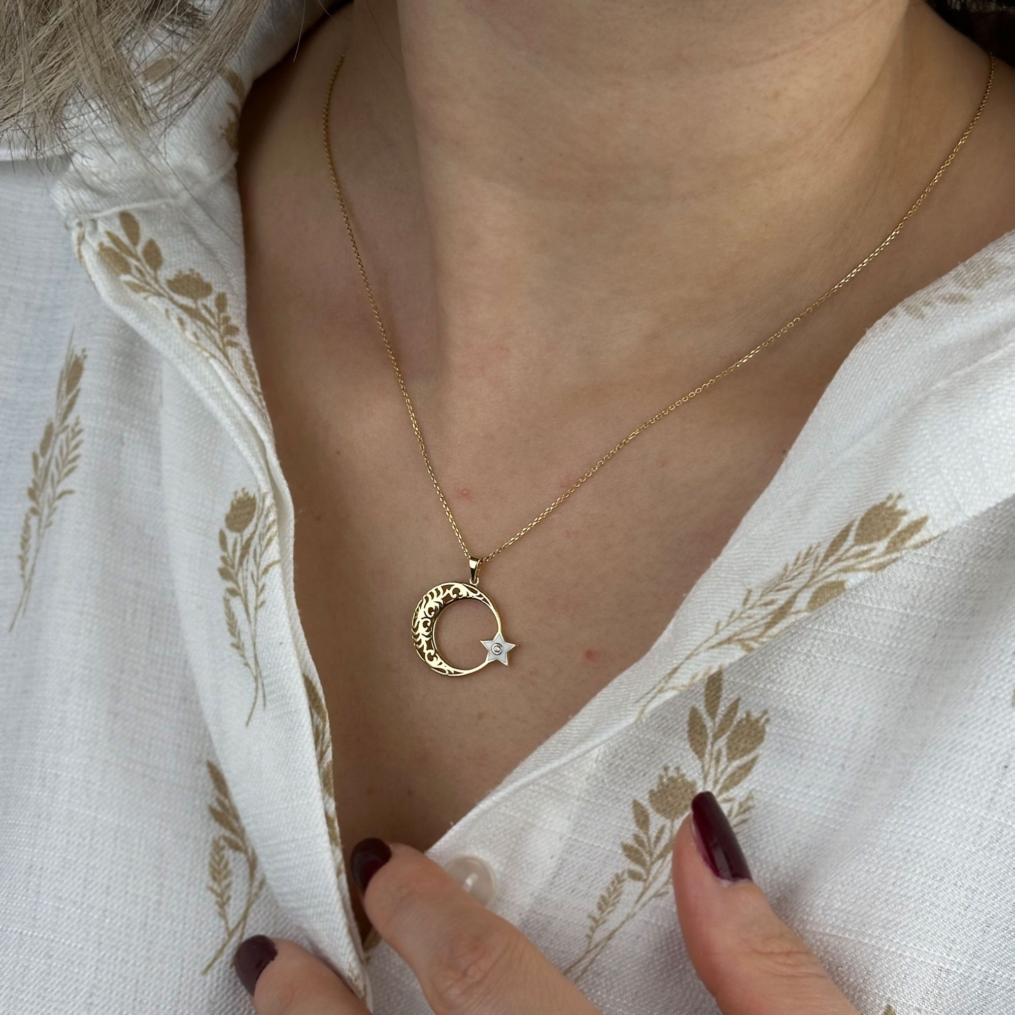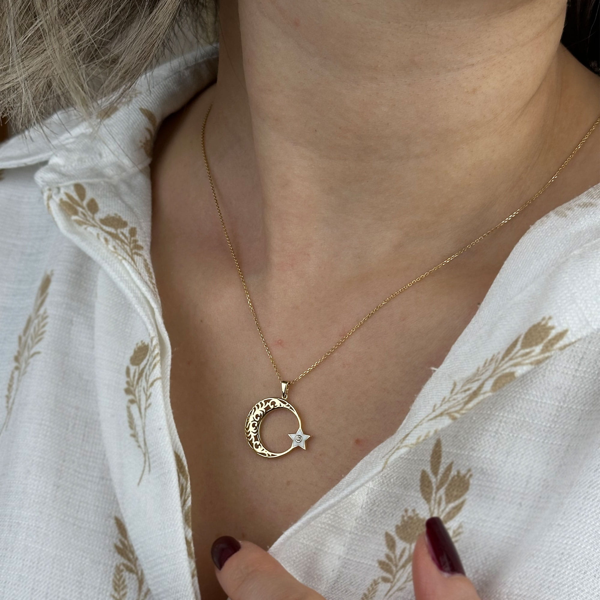 Ay ve yıldız figürü, aidiyet ve umudu simgeler; bu kolye anlamı zarif bir ışıltıyla taşır.