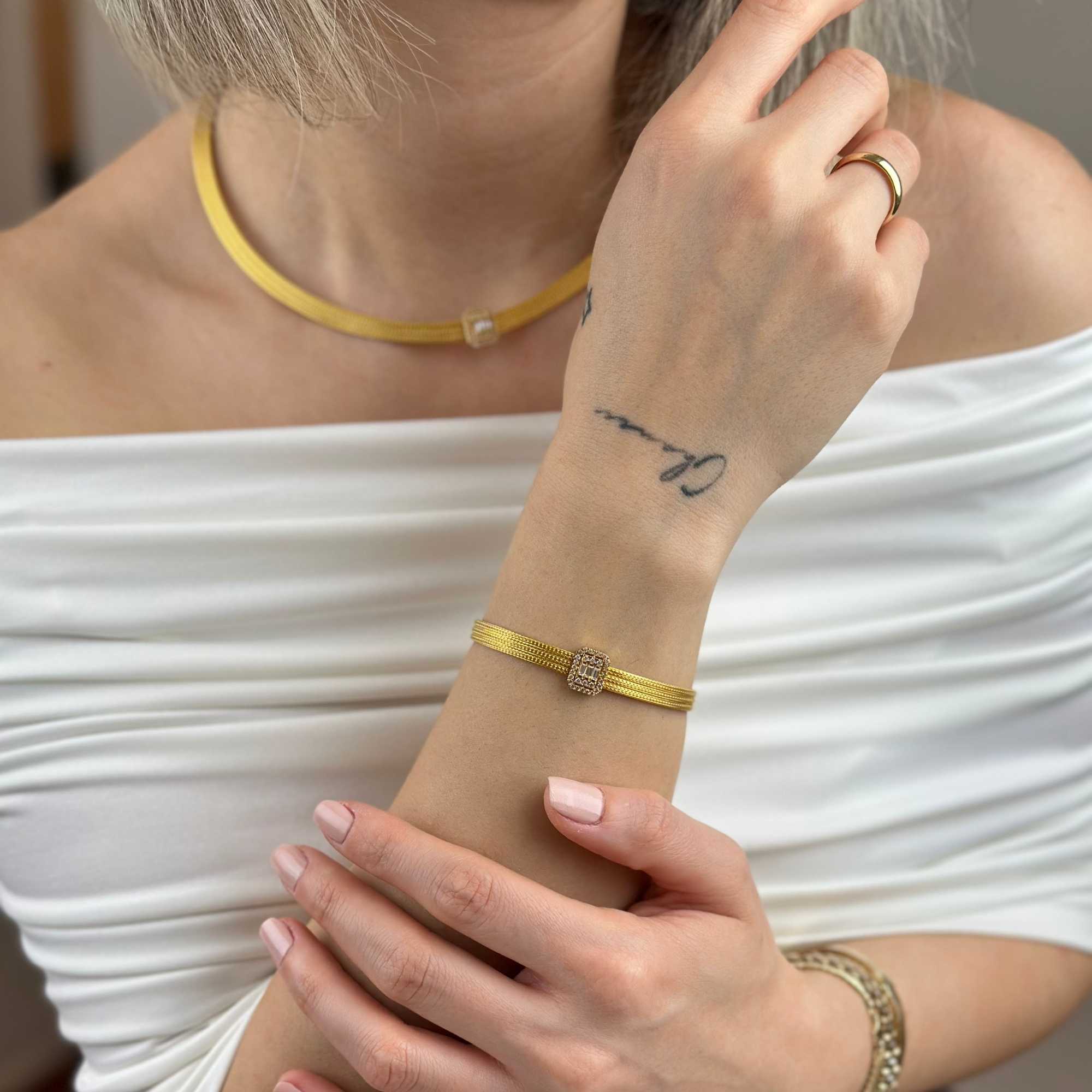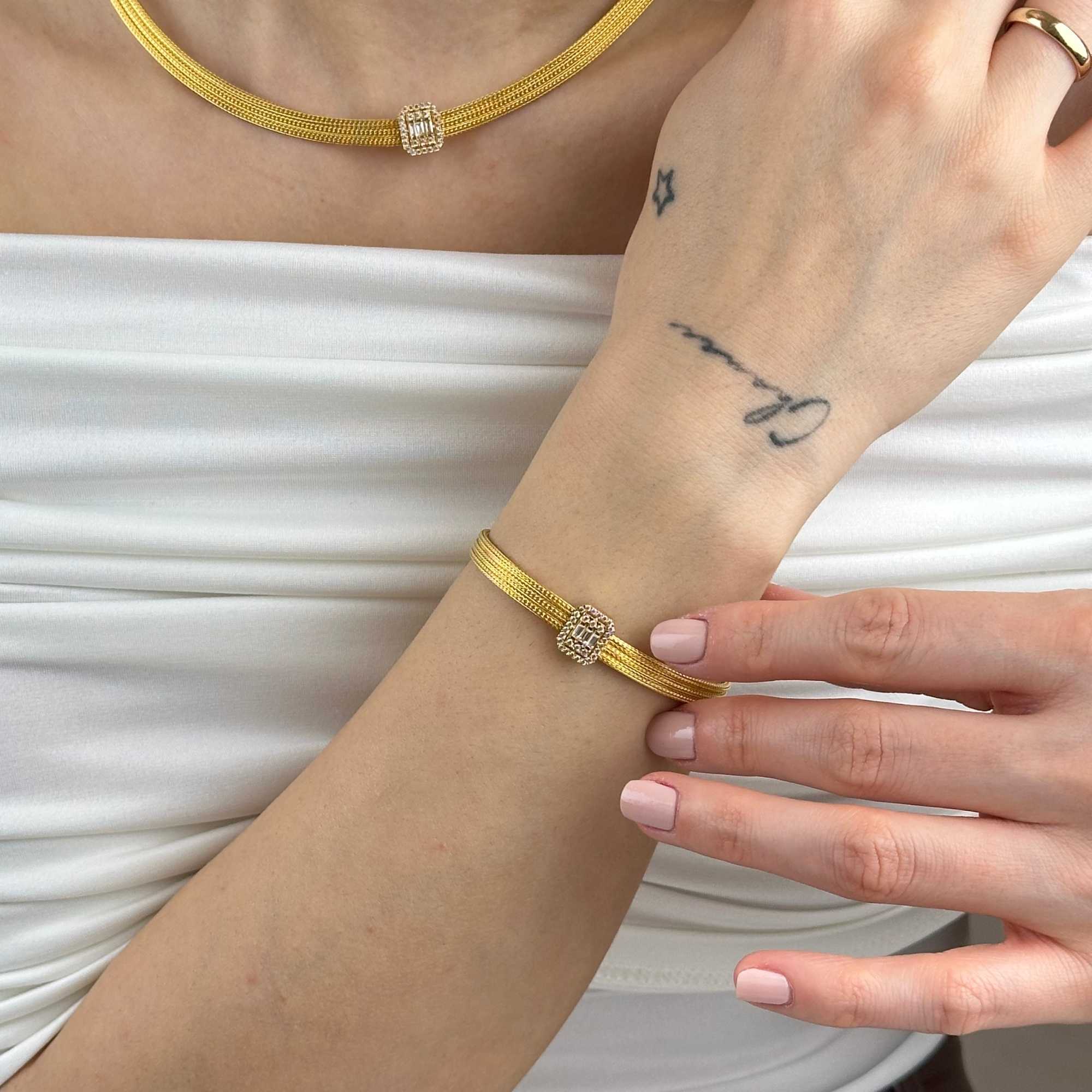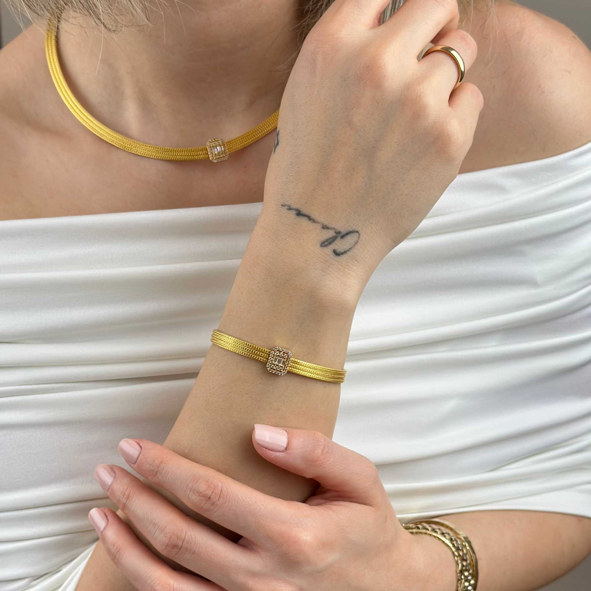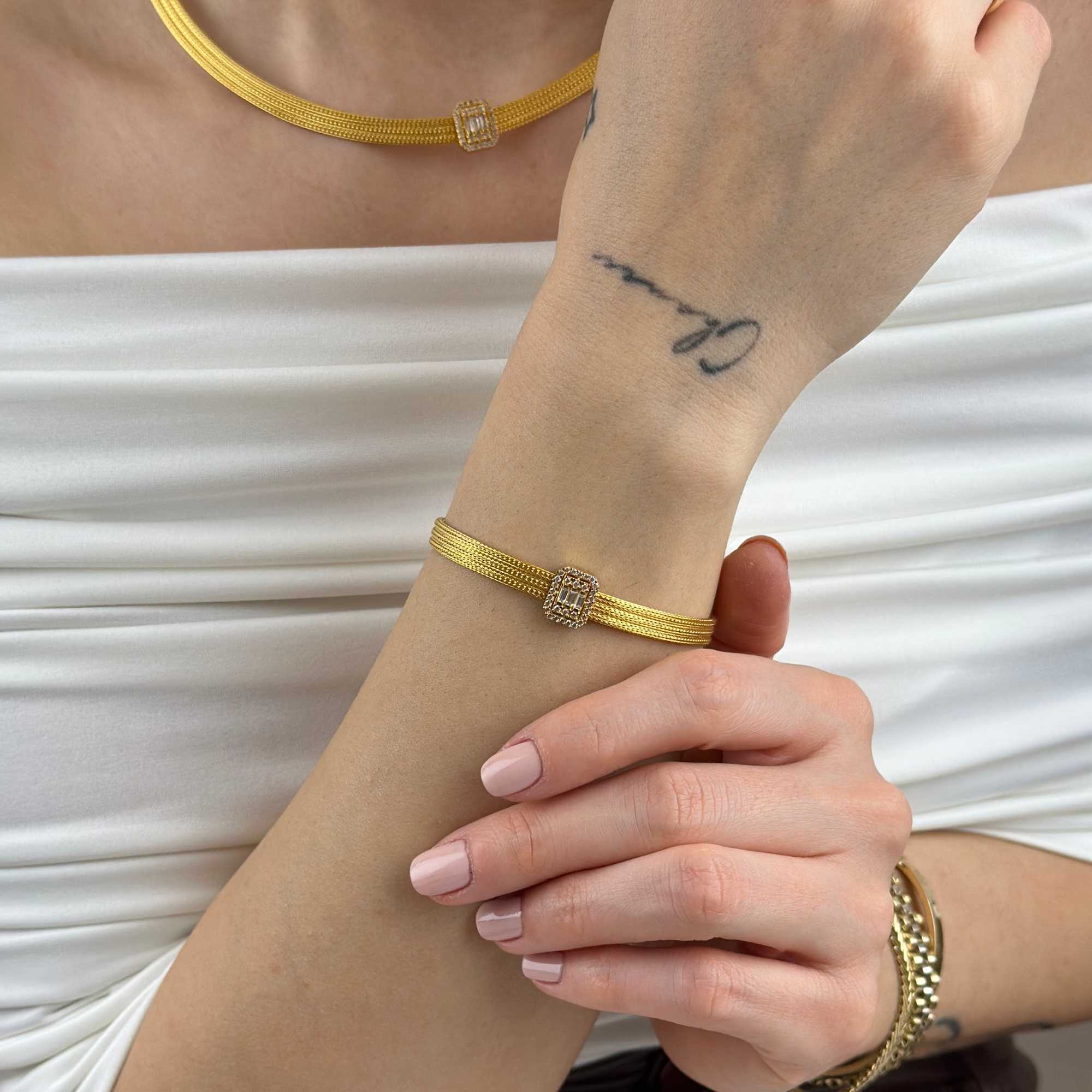 Yaklaşık 8,62 gram ağırlığıyla dengeli ve konforlu bir kullanım sunan bu bileklik, sarı altının sıcak tonu ile baget taşların net ışıltısını bir araya getirir. El işçiliği detayları, tasarıma zamansız ve koleksiyon değeri taşıyan bir karakter kazandırır.