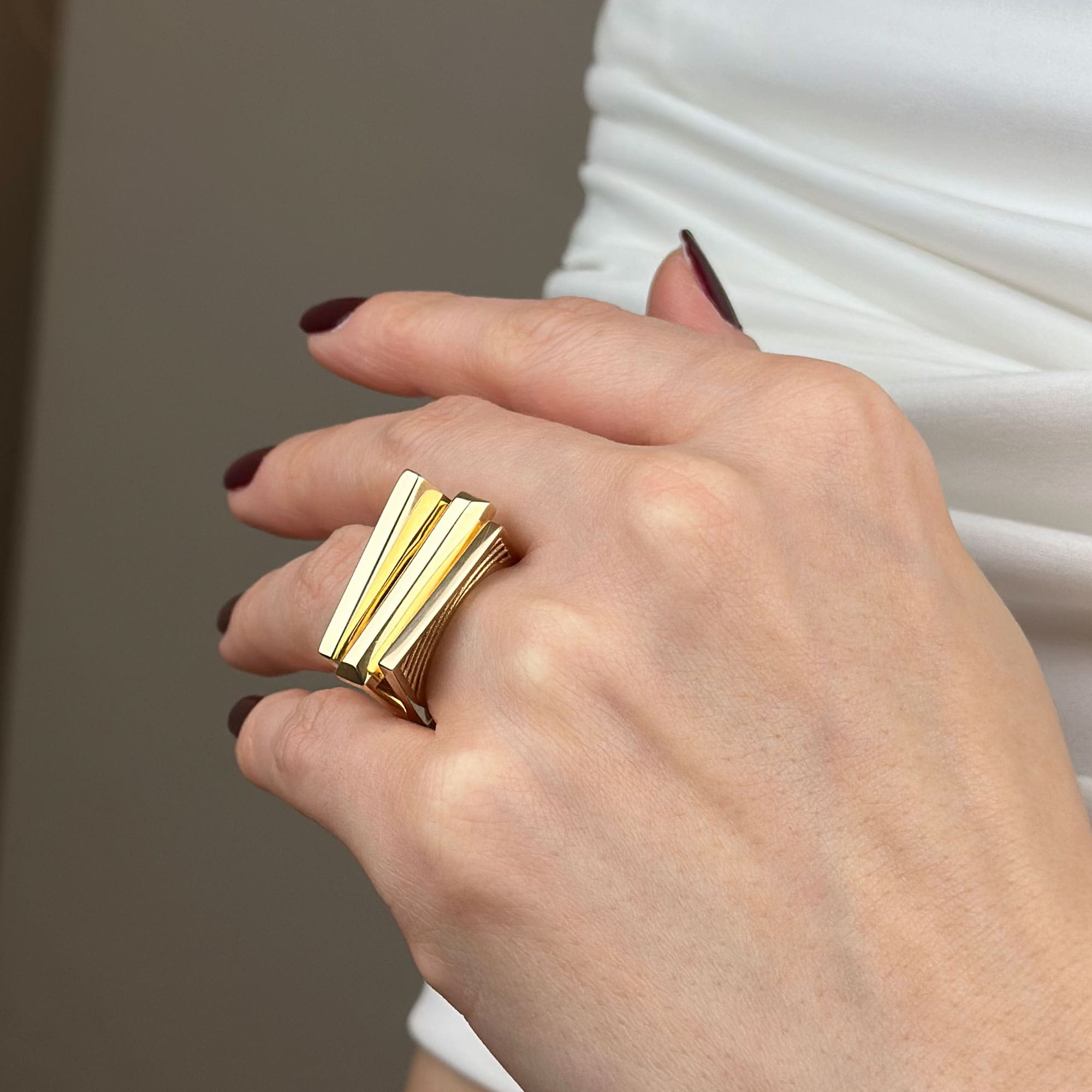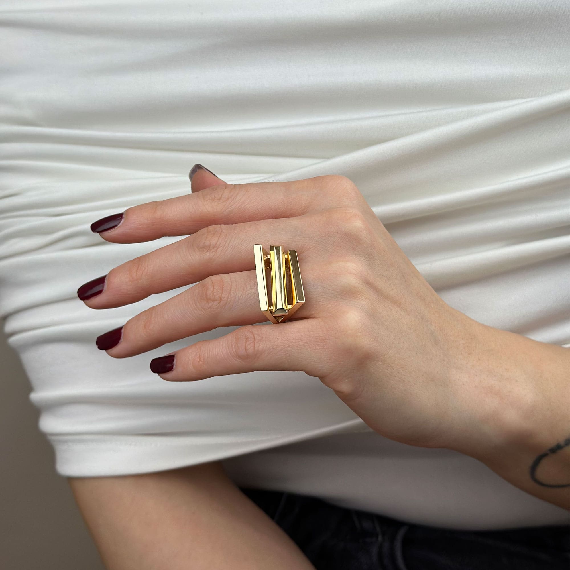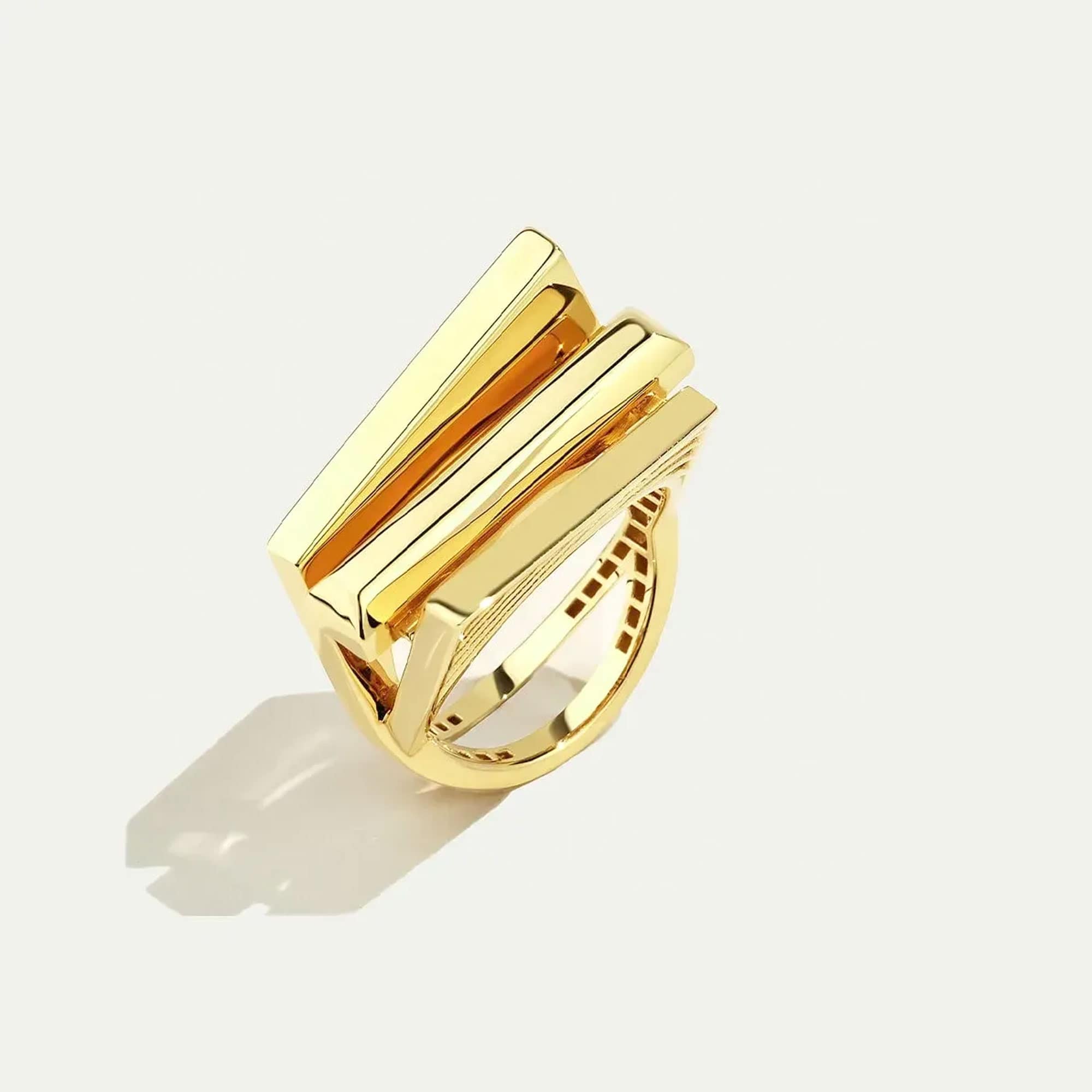 Düzgün hatları ve sütunlu formuyla bu baget yüzük, modern mimariden ilham alan güçlü bir duruş sergiler.