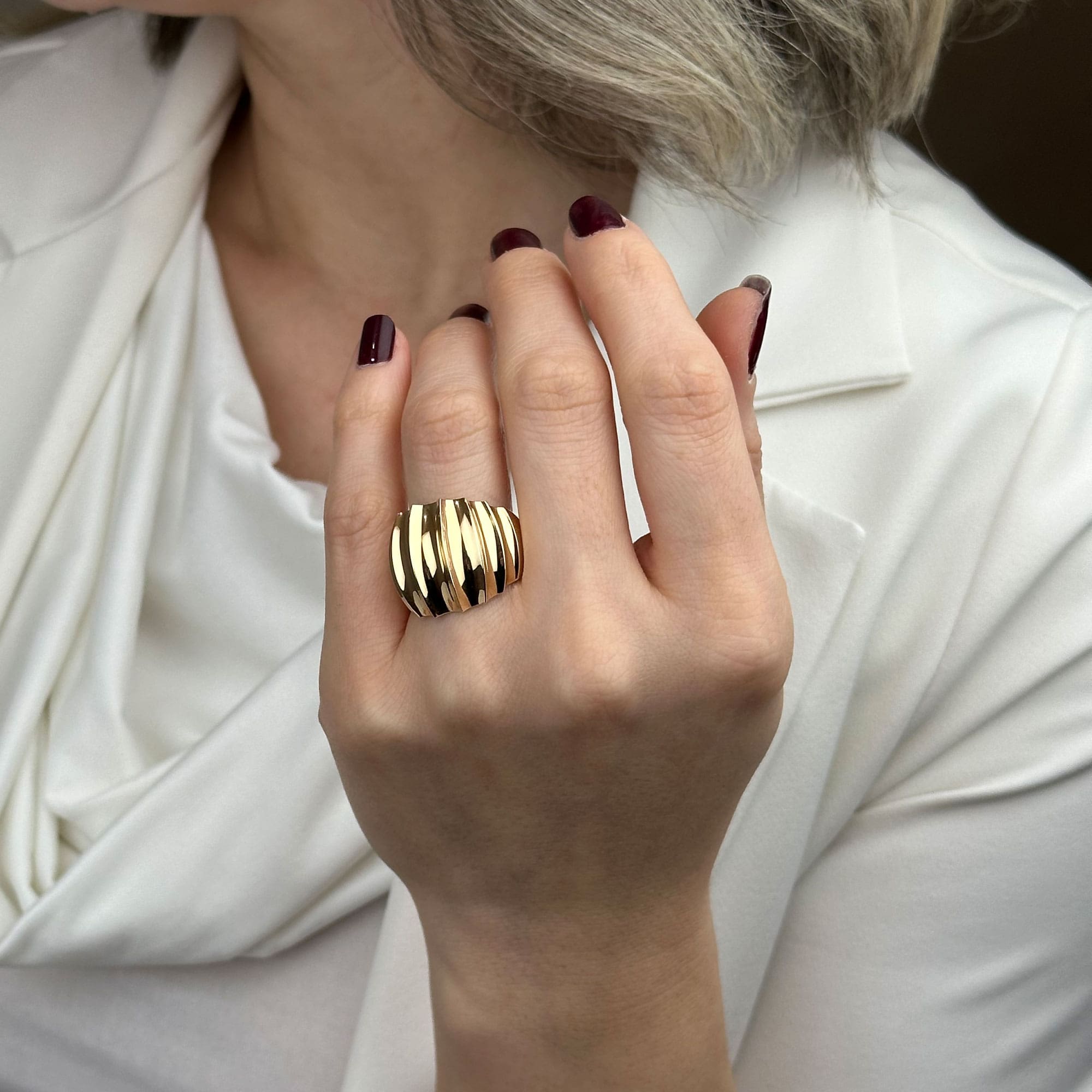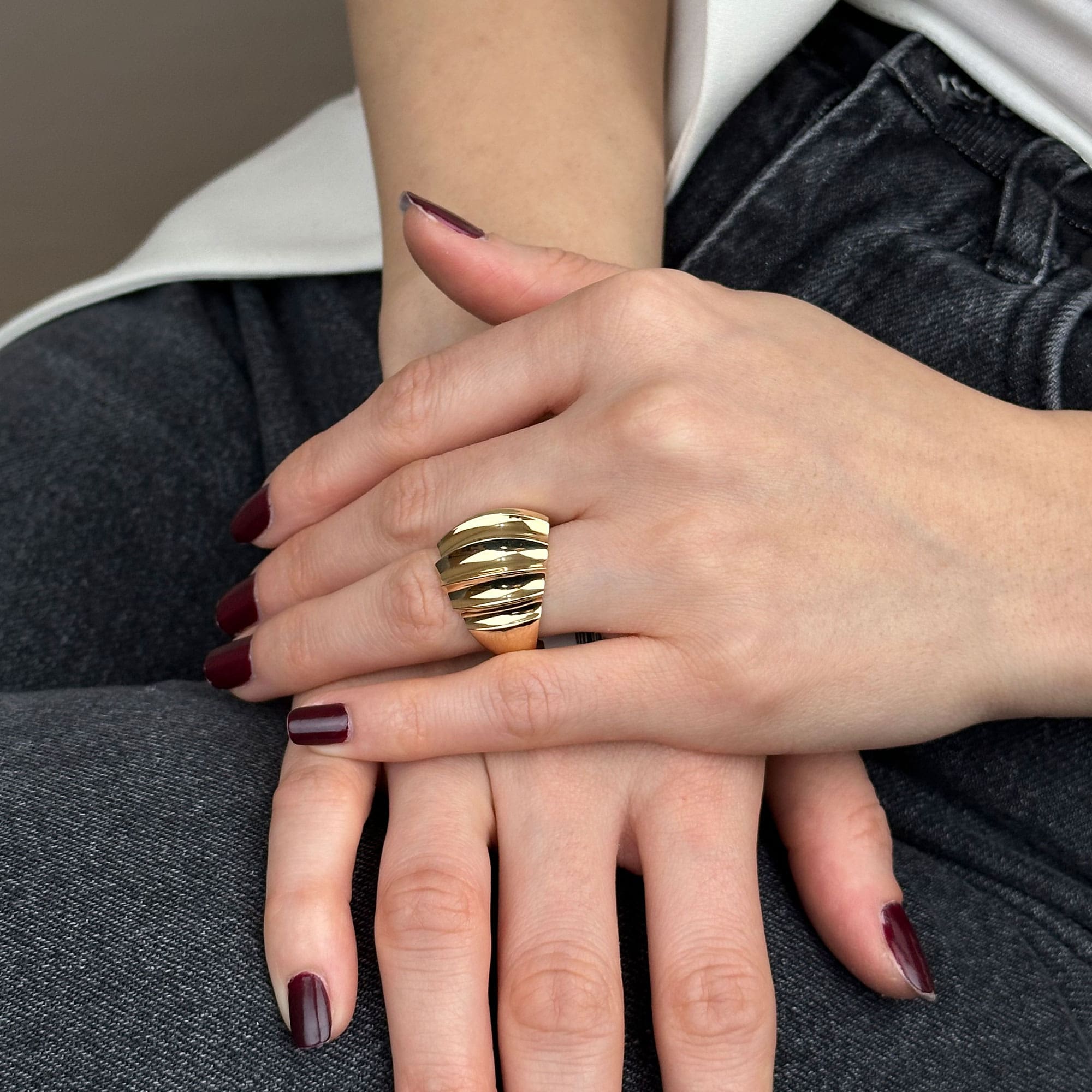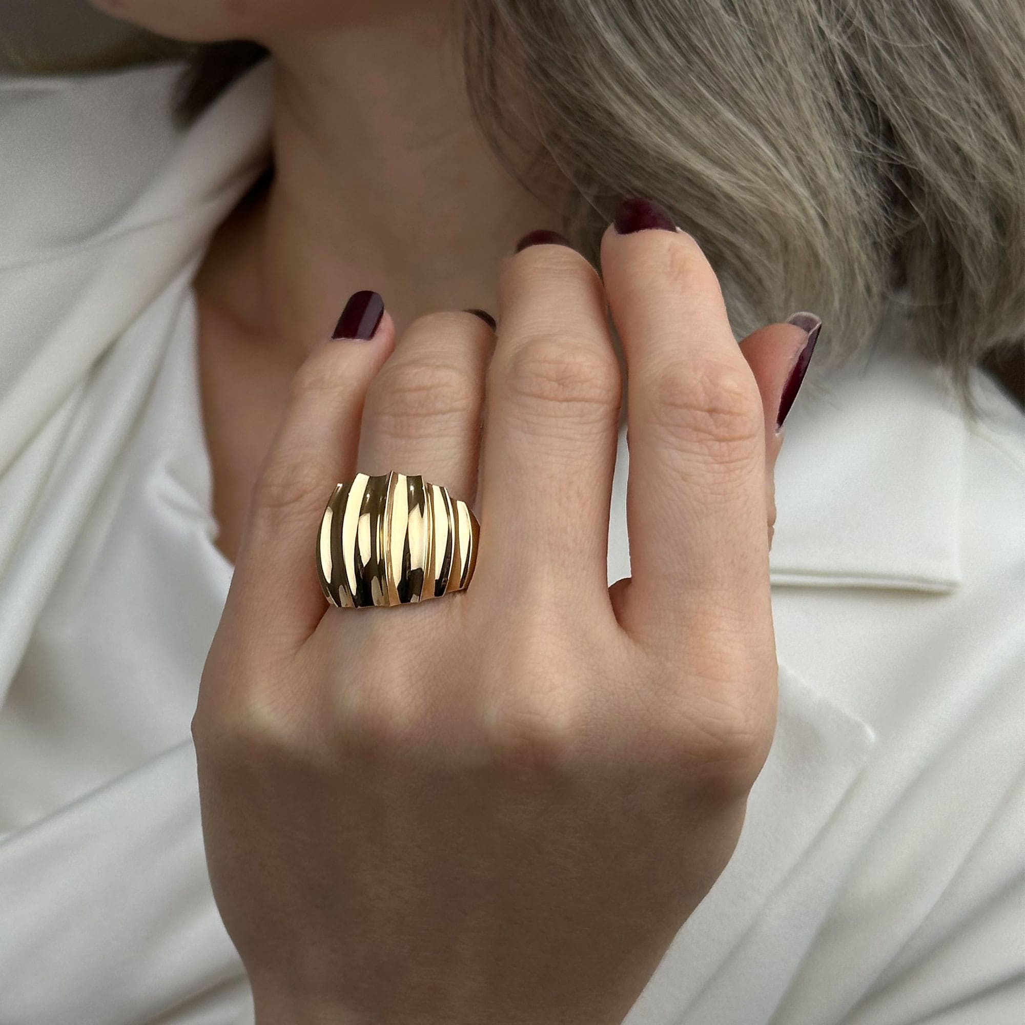 Bombeli formun yumuşak hatları ve regold maya tasarımın modern çizgisi, bu yüzüğü sade ama güçlü bir stile dönüştürür.