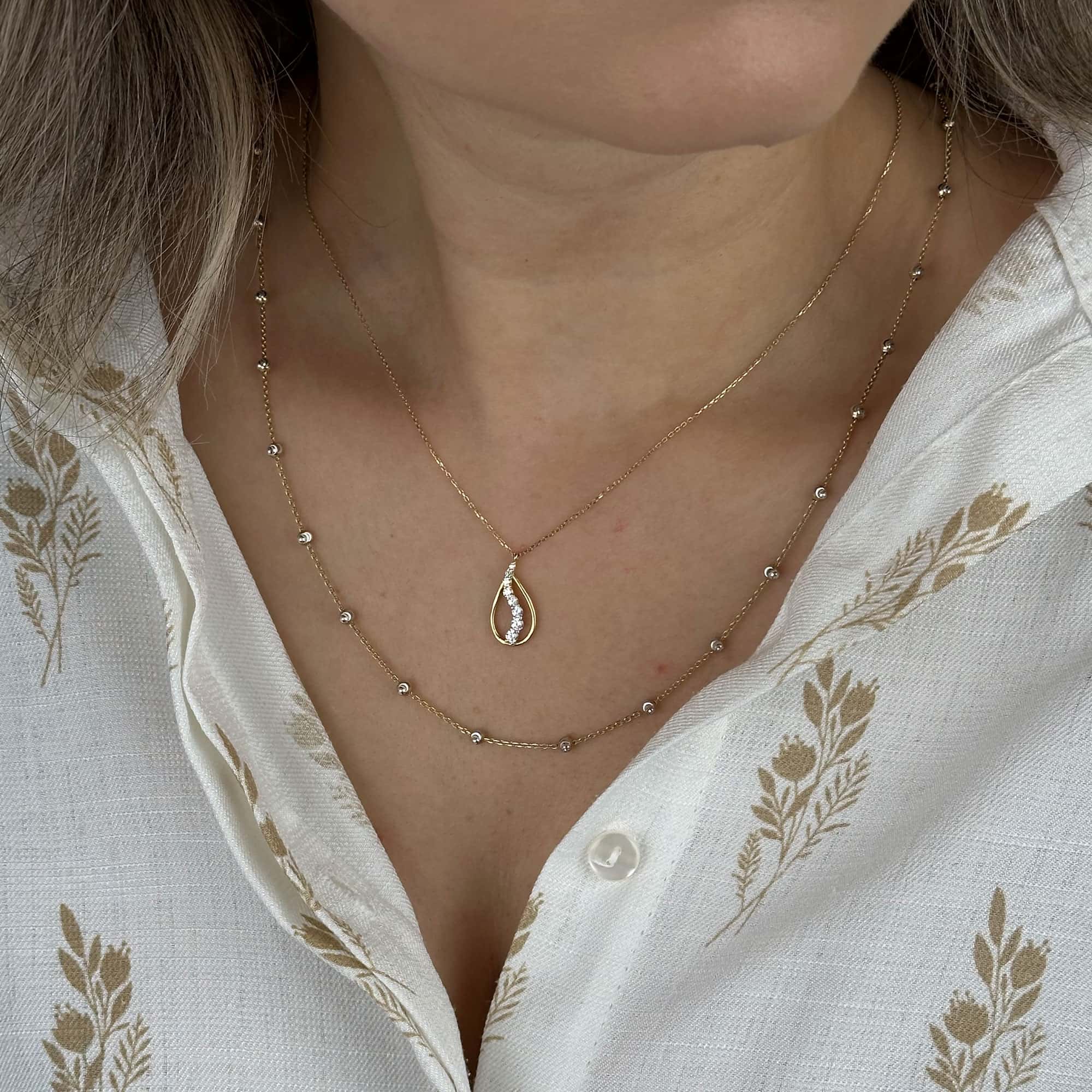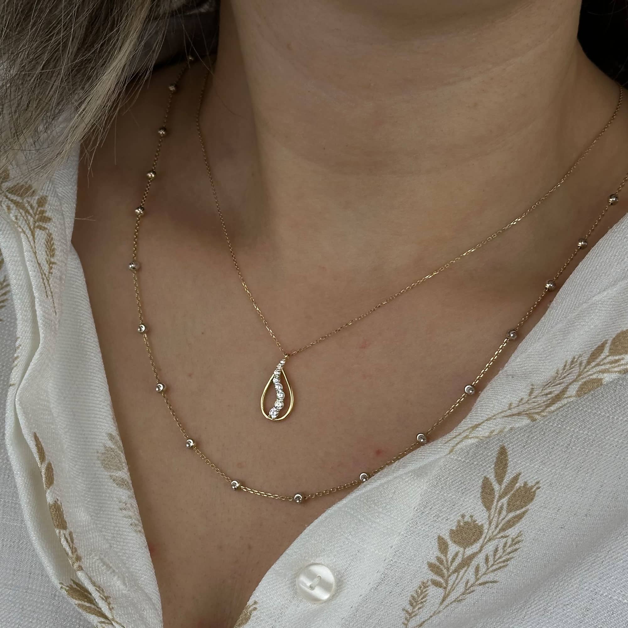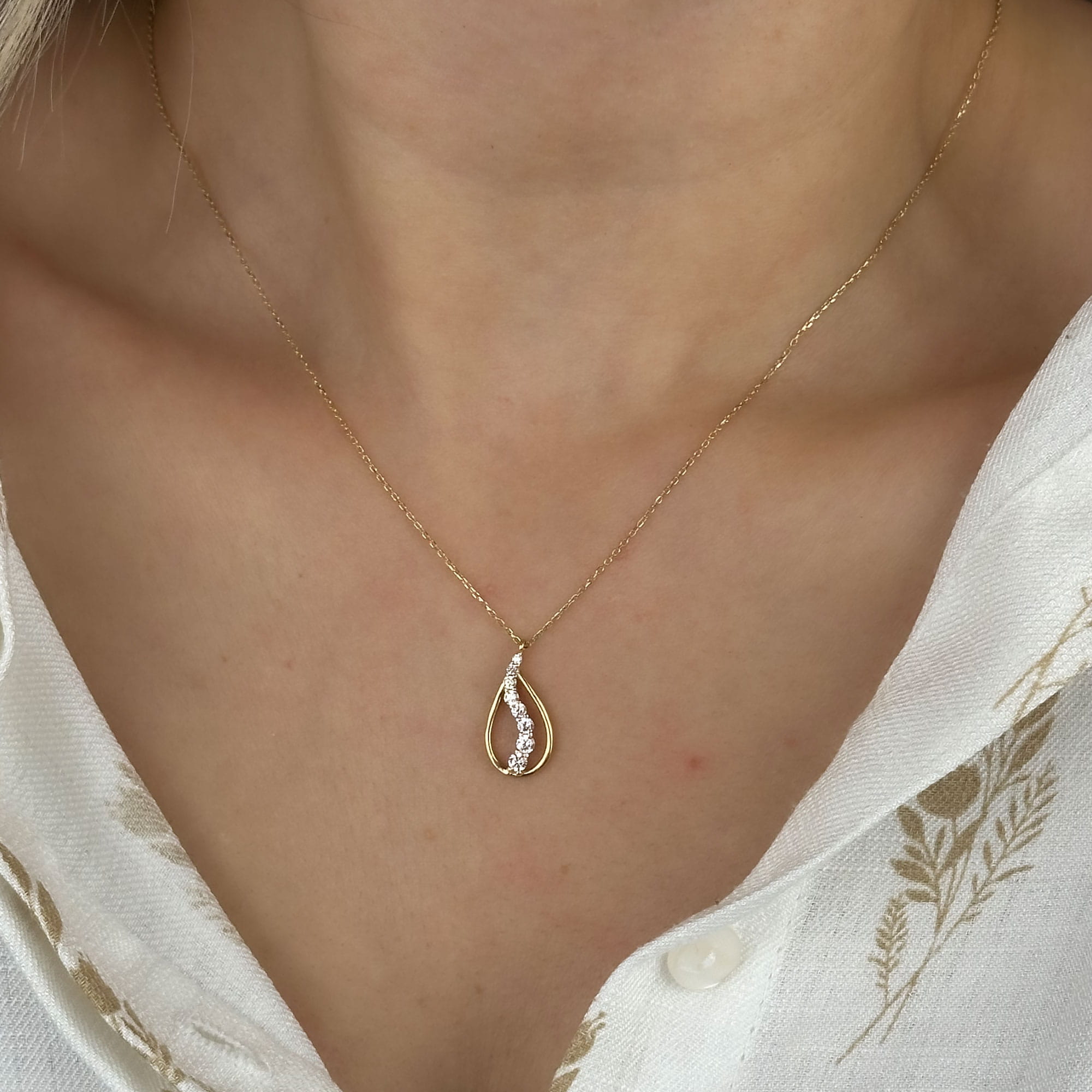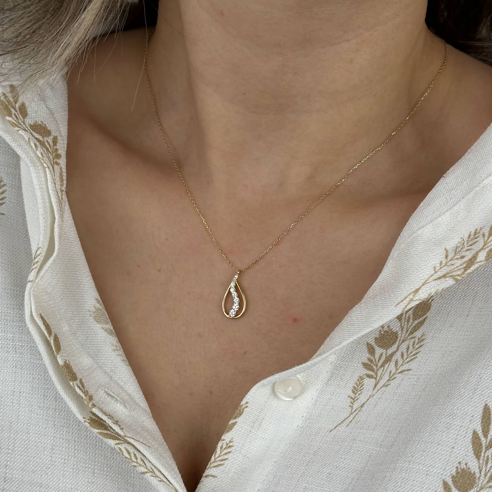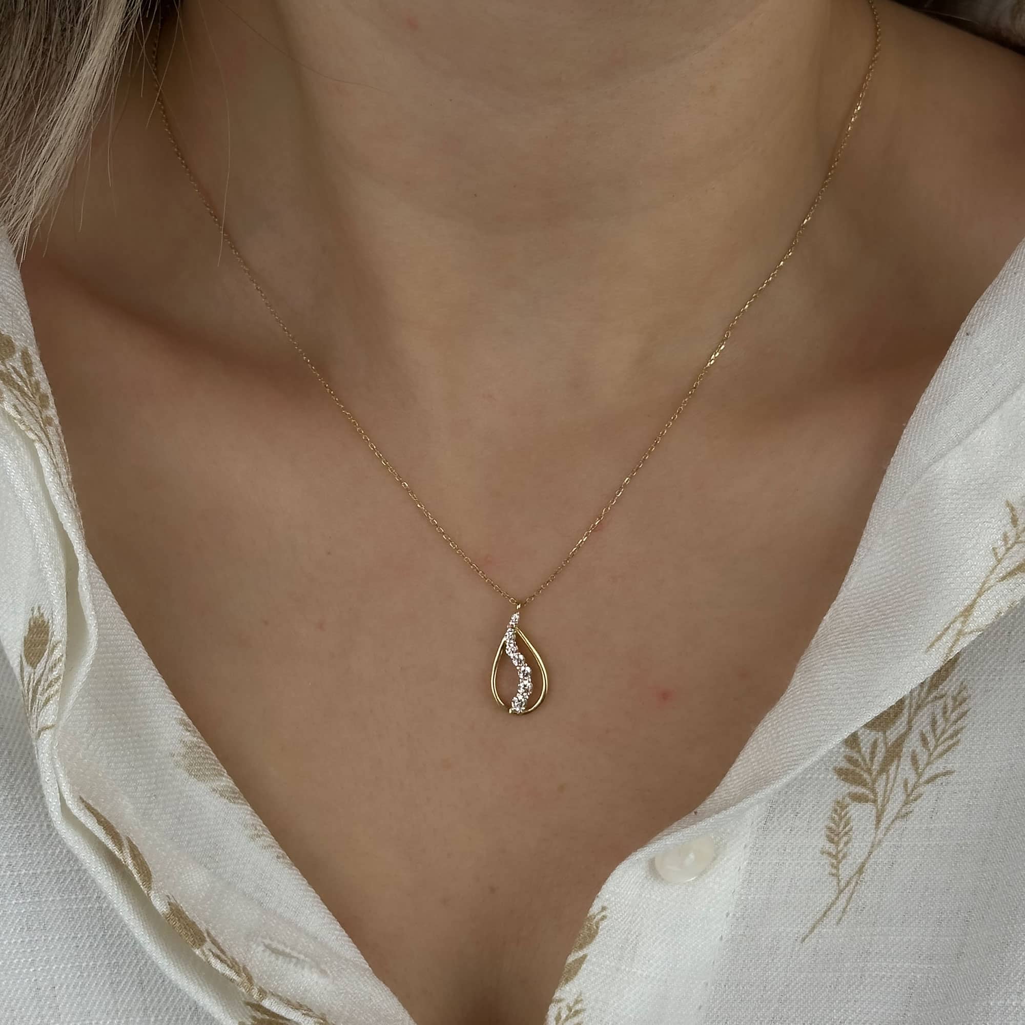 Damla formu, sadeliği ve zarafeti simgeler; bu kolye zamansız bir şıklık sunar.