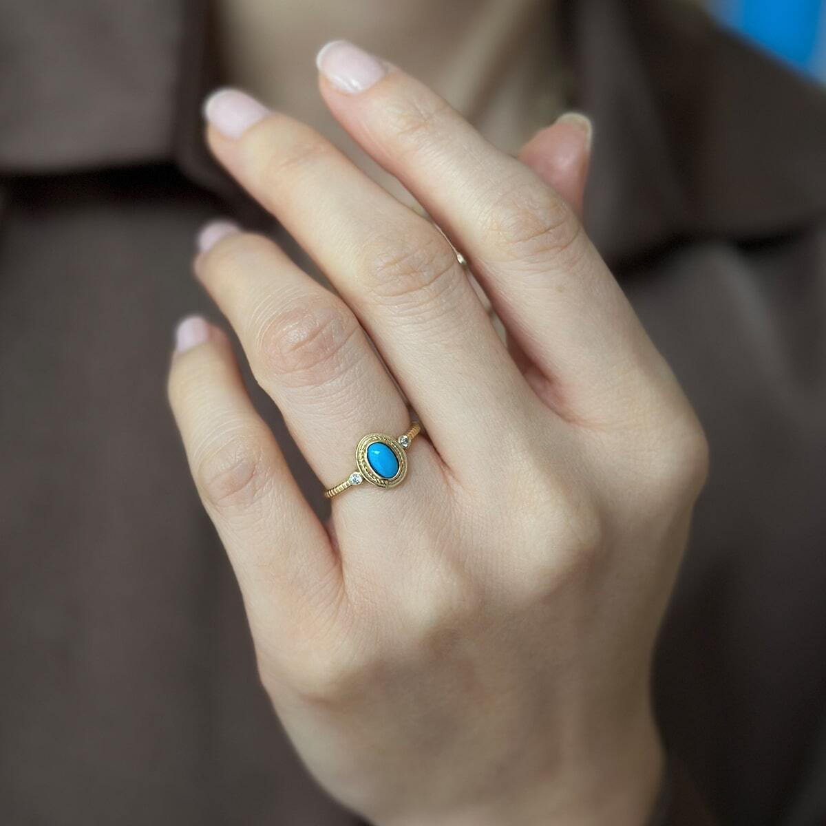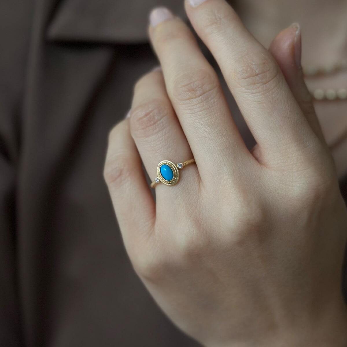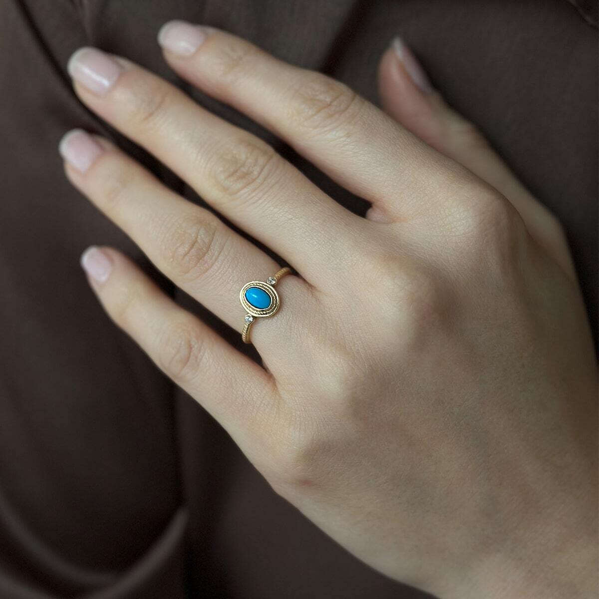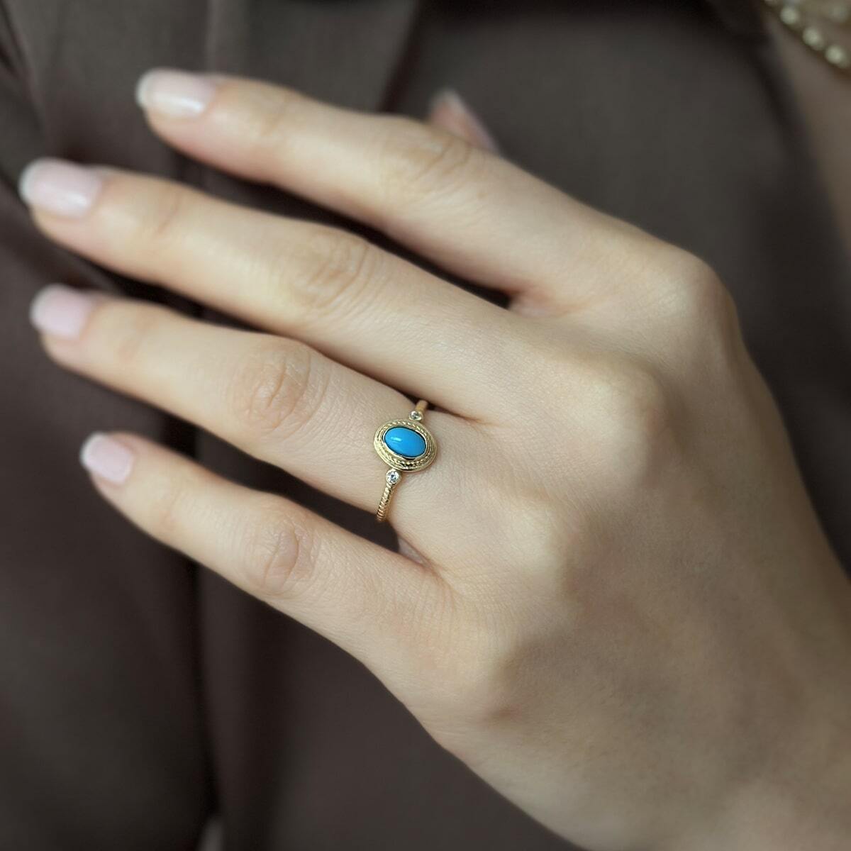 14 Ayar Altın Firuze Taşlı Oval Tasarım Yüzük