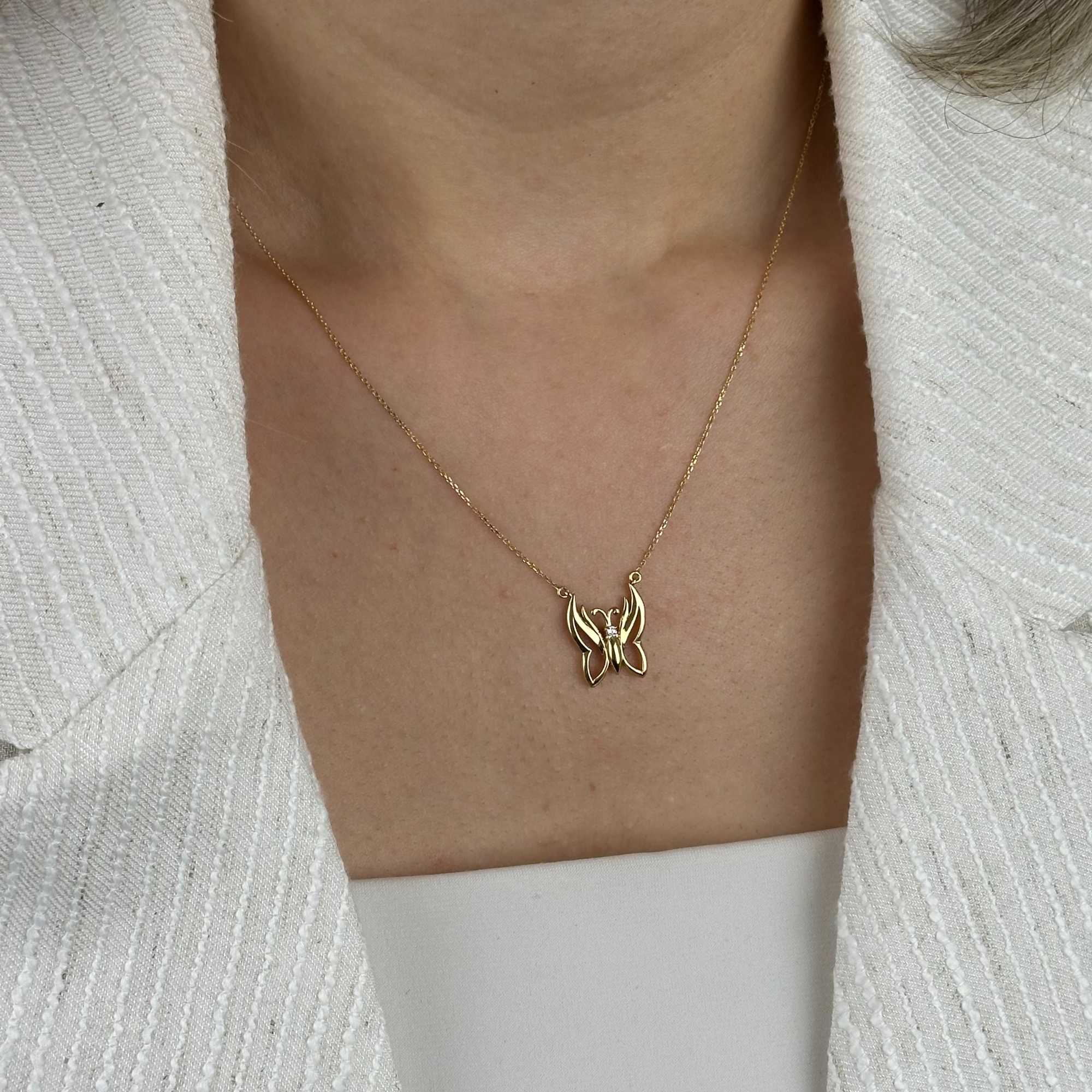 Zarif ve anlamlı tasarımıyla öne çıkan bu 14 ayar altın kelebek kolye, zirkon taş detaylarıyla modern bir şıklık sunar. Kelebek figürü; değişimi, özgürlüğü ve yenilenmeyi simgelerken, ince işçiliği sayesinde günlük kullanıma uygun hafif bir yapı sunar.