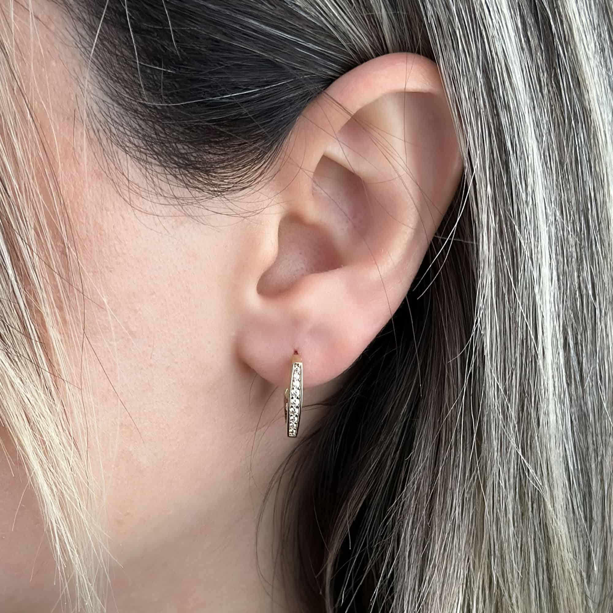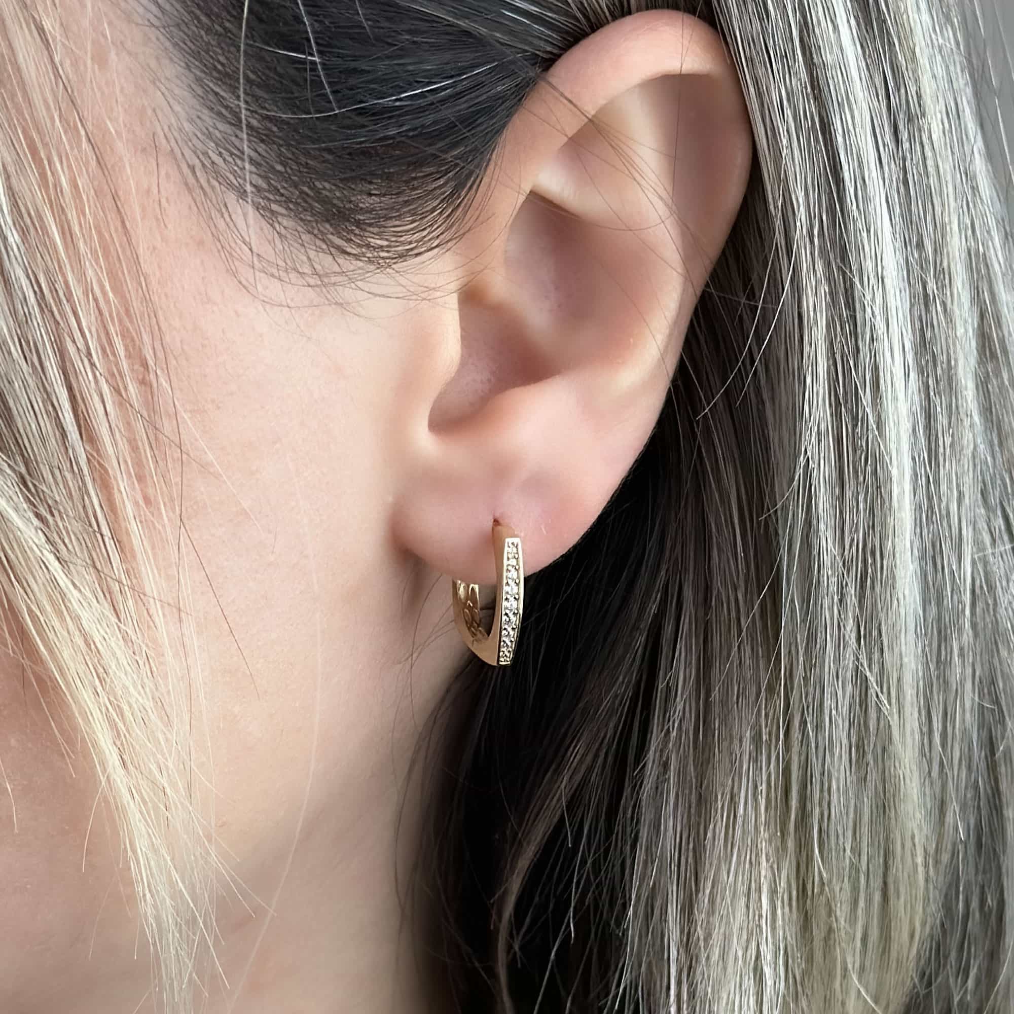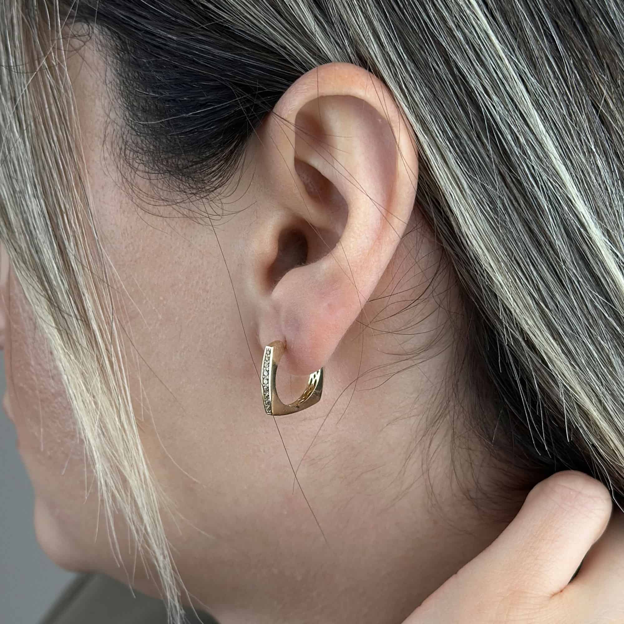 14 ayar altın köşeli taşlı halka küpe, modern çizgileri ve göz alıcı parlaklığıyla günlük şıklığı bir üst seviyeye taşır. Köşeli formunun yarattığı keskin hatlar, klasik halka küpe görünümüne özgün bir dokunuş katar. Üzerindeki ışıltılı taş detayları ise küpeyi hem zarif hem de dikkat çekici bir takı haline getirir.