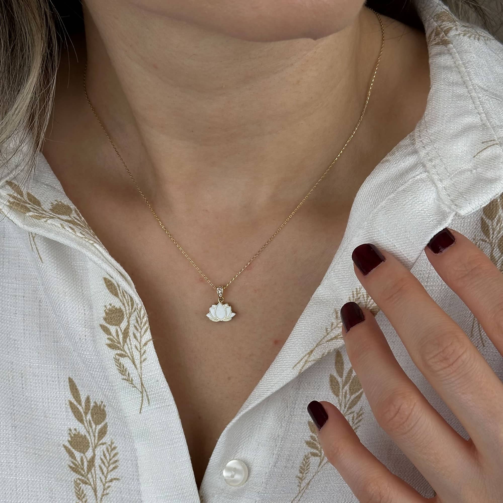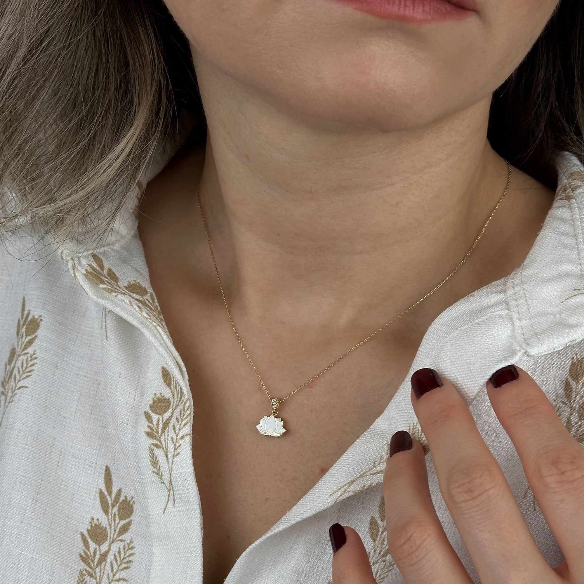 Lotus çiçeği, saflığı ve yeniden doğuşu simgeler; bu zarif kolye anlamı şıklıkla buluşturur.