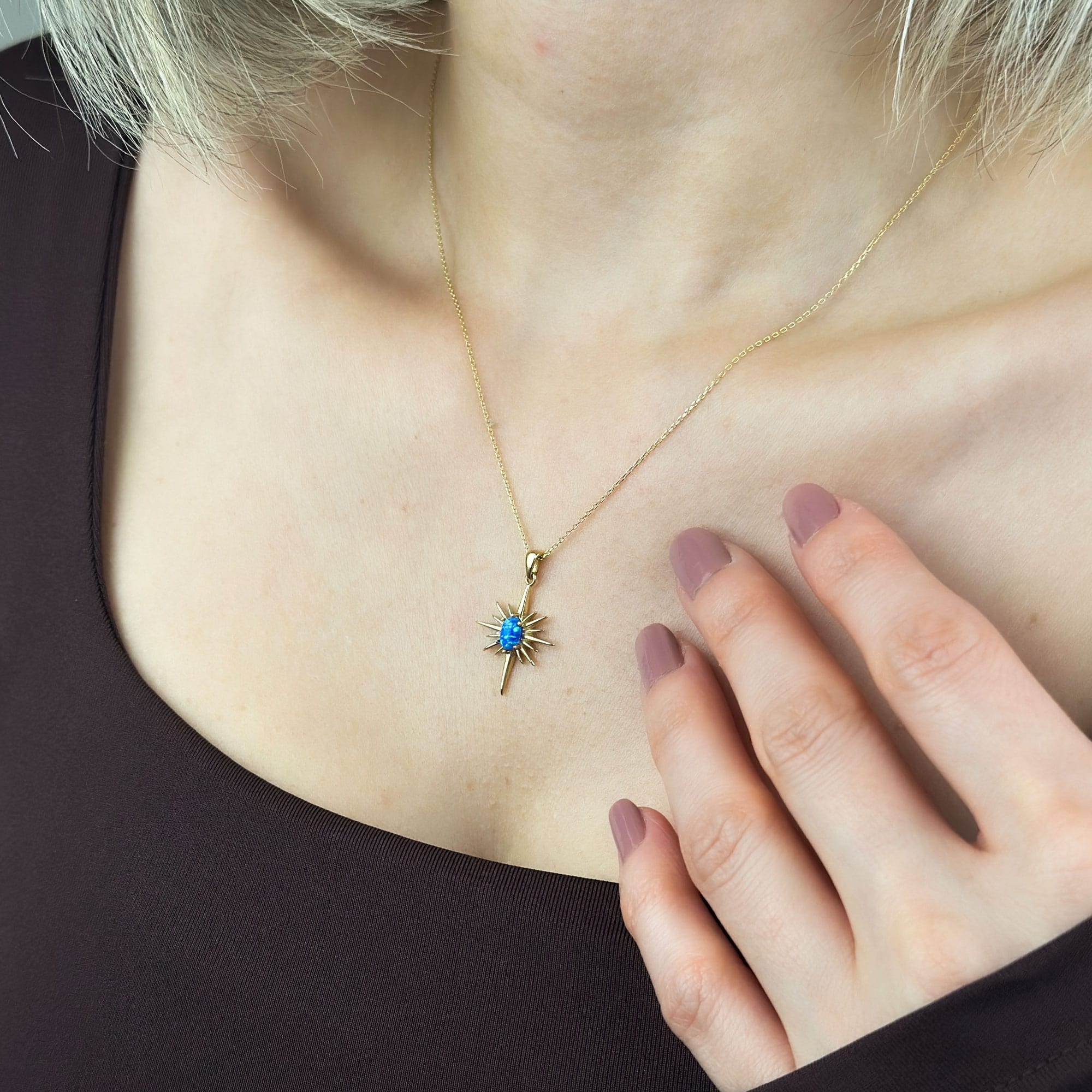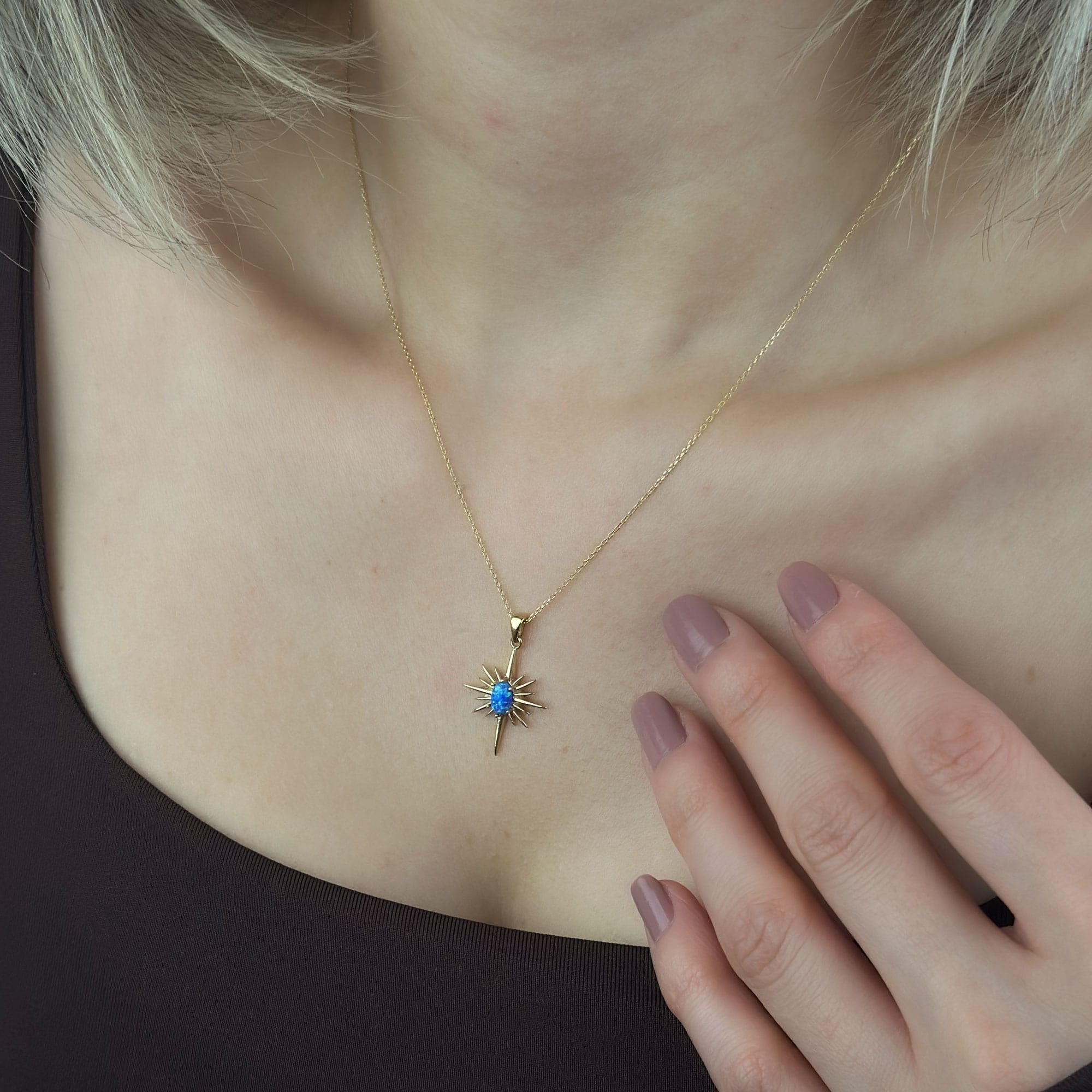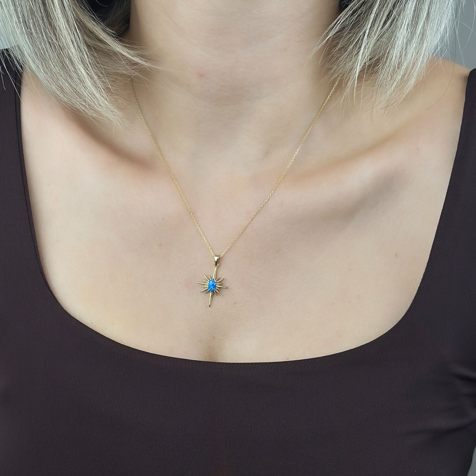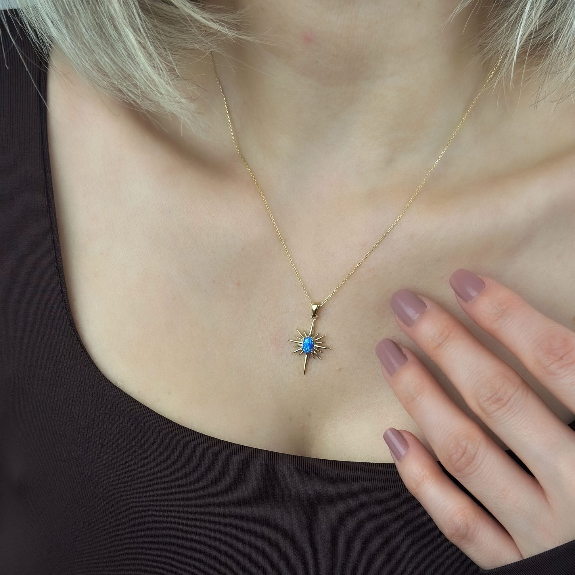 14 ayar altından üretilen bu mavi opal taşlı kutup yıldızı kolye, zarif tasarımı ve sembolik anlamıyla günlük ve özel kombinlere şıklık katar. Opal taşın doğal ışıltısı, kutup yıldızı formuyla birleşerek modern ve anlamlı bir görünüm sunar. Hafif yapısı sayesinde gün boyu konforlu kullanım sağlar.