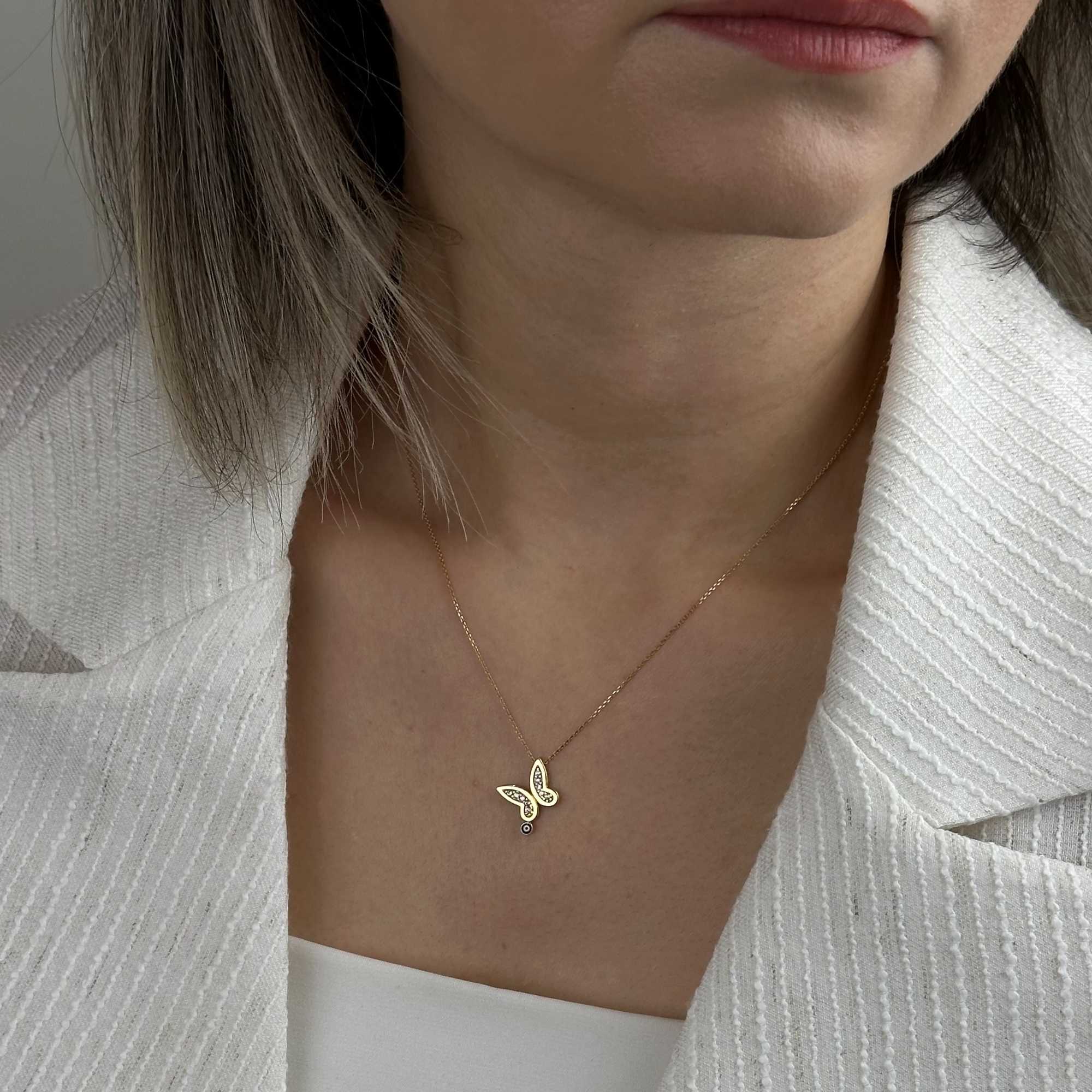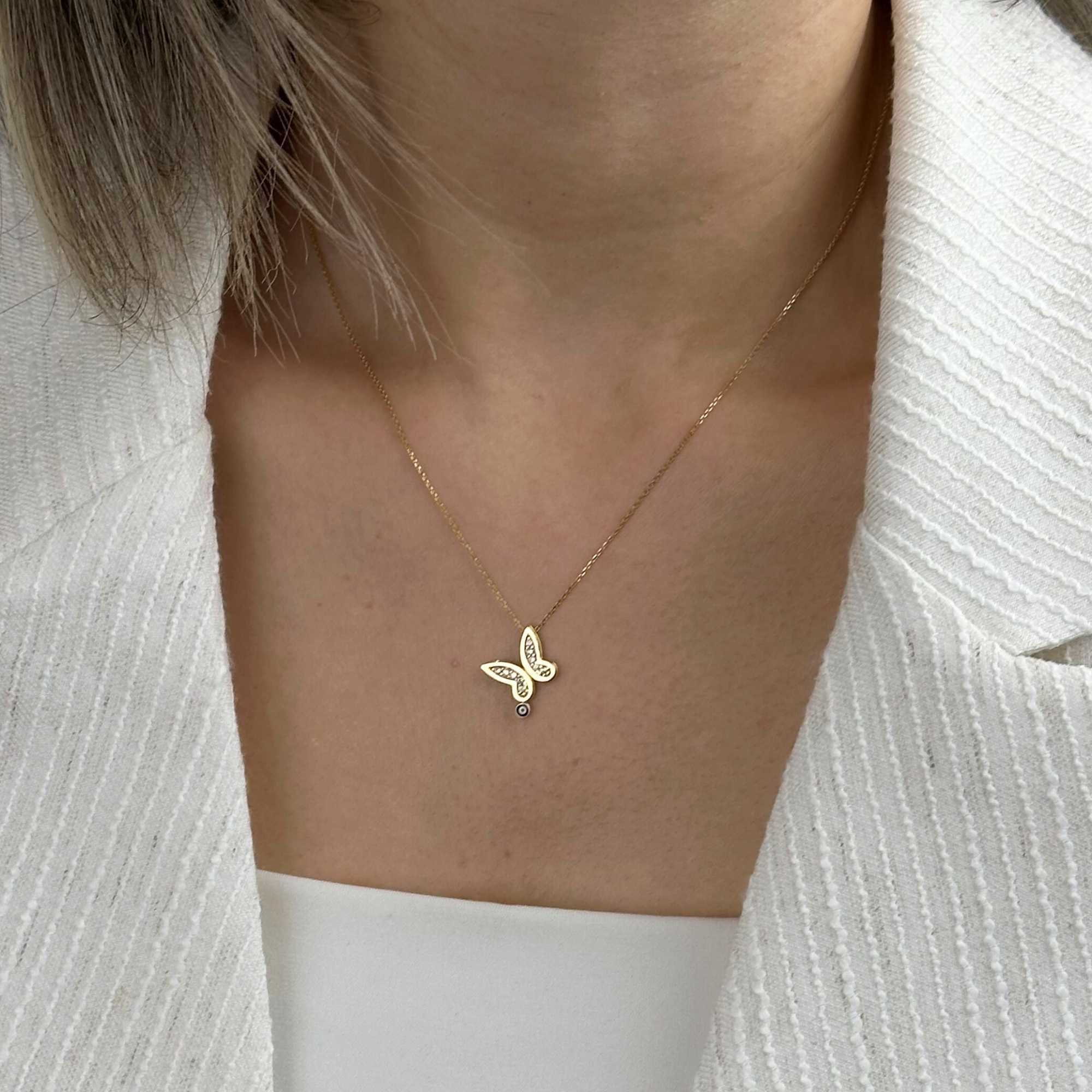 14 ayar altın nazar boncuk kolye, zarif kelebek silüeti ve zirkon taş ışıltısıyla hem minimal hem de dikkat çekici bir görünüm sunar. Sarı altın tonu; sade kombinlerde şık bir tamamlayıcı, özel günlerde ise anlamlı bir hediye alternatifi olarak öne çıkar.