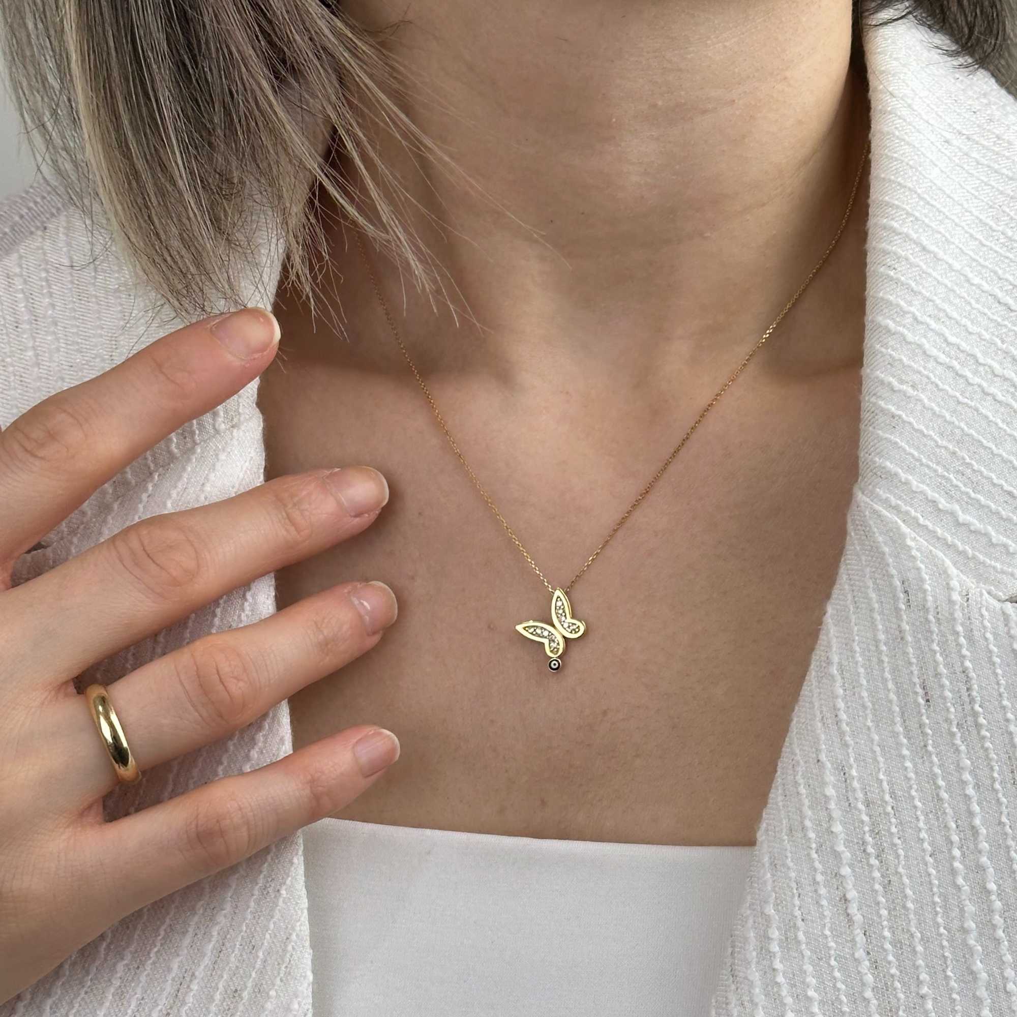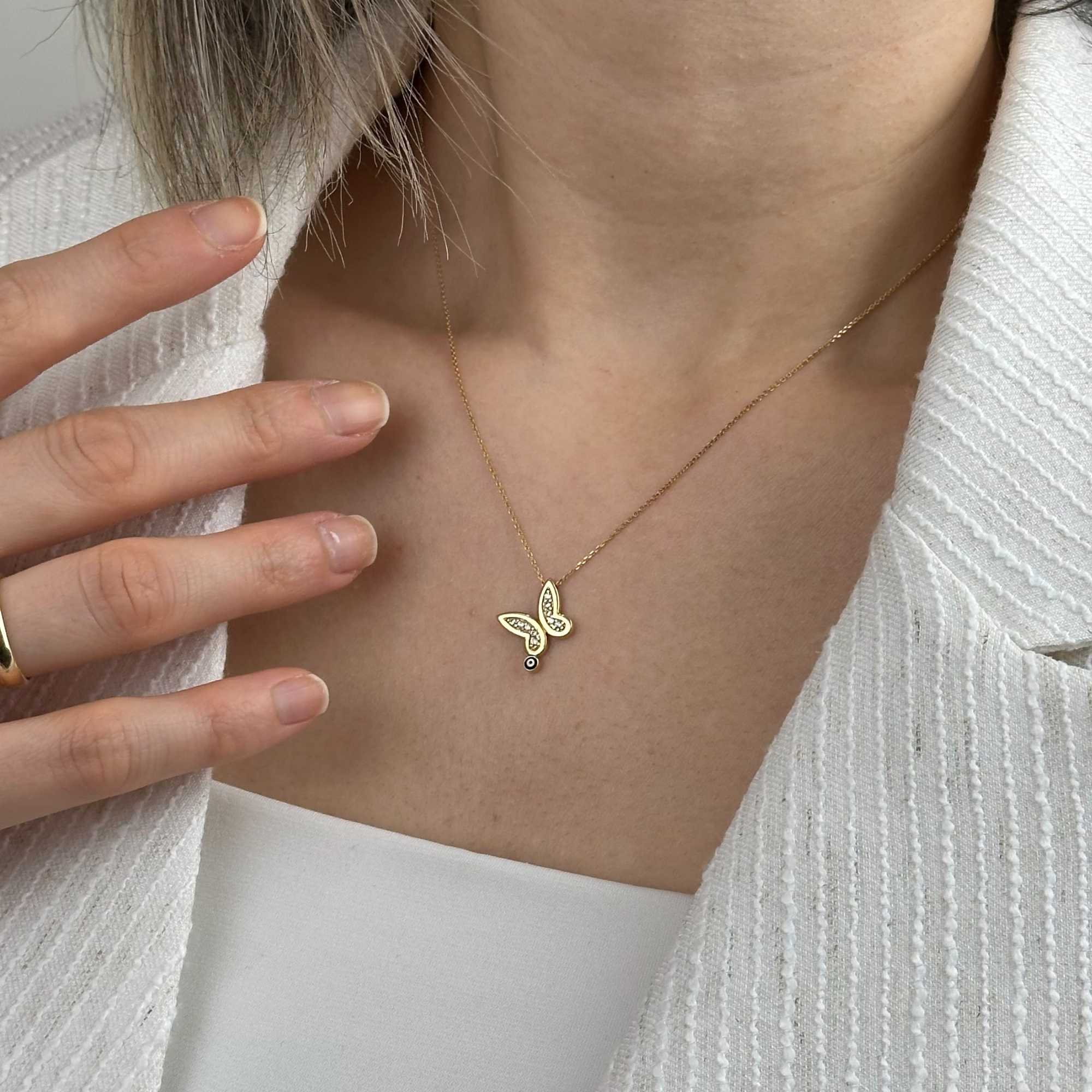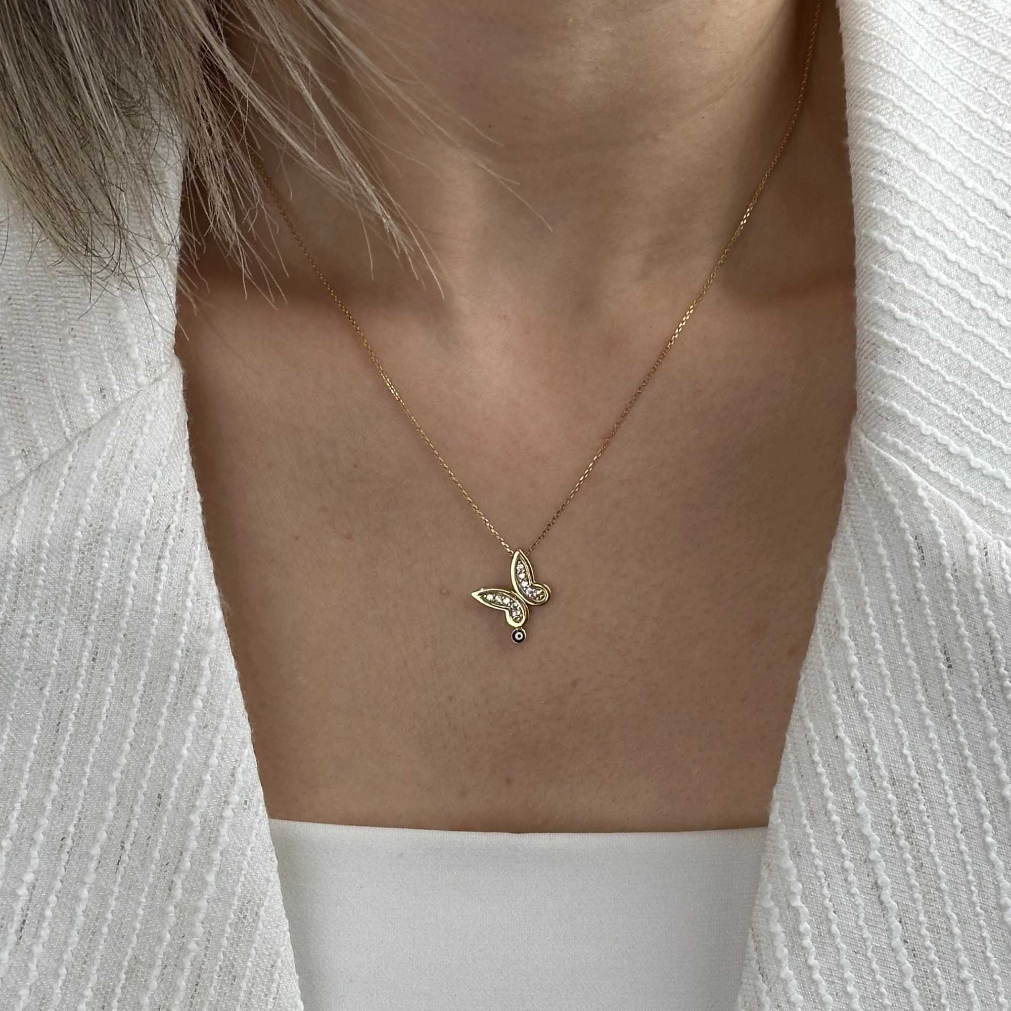 Nazar boncuk detayı ve kelebek formuyla bu kolye, günlük şıklığa modern bir anlam katar.