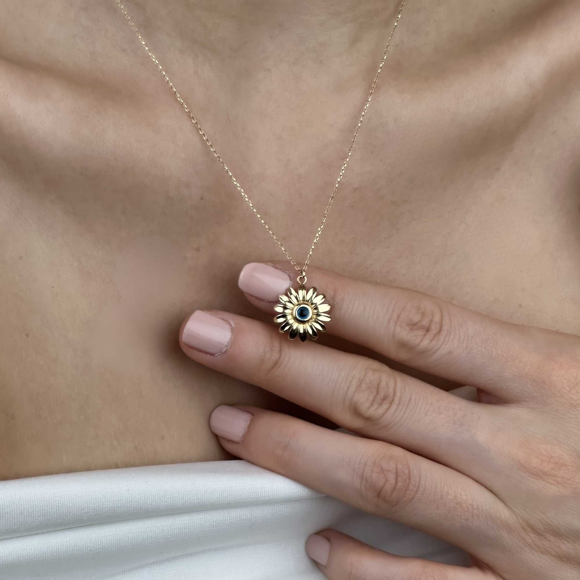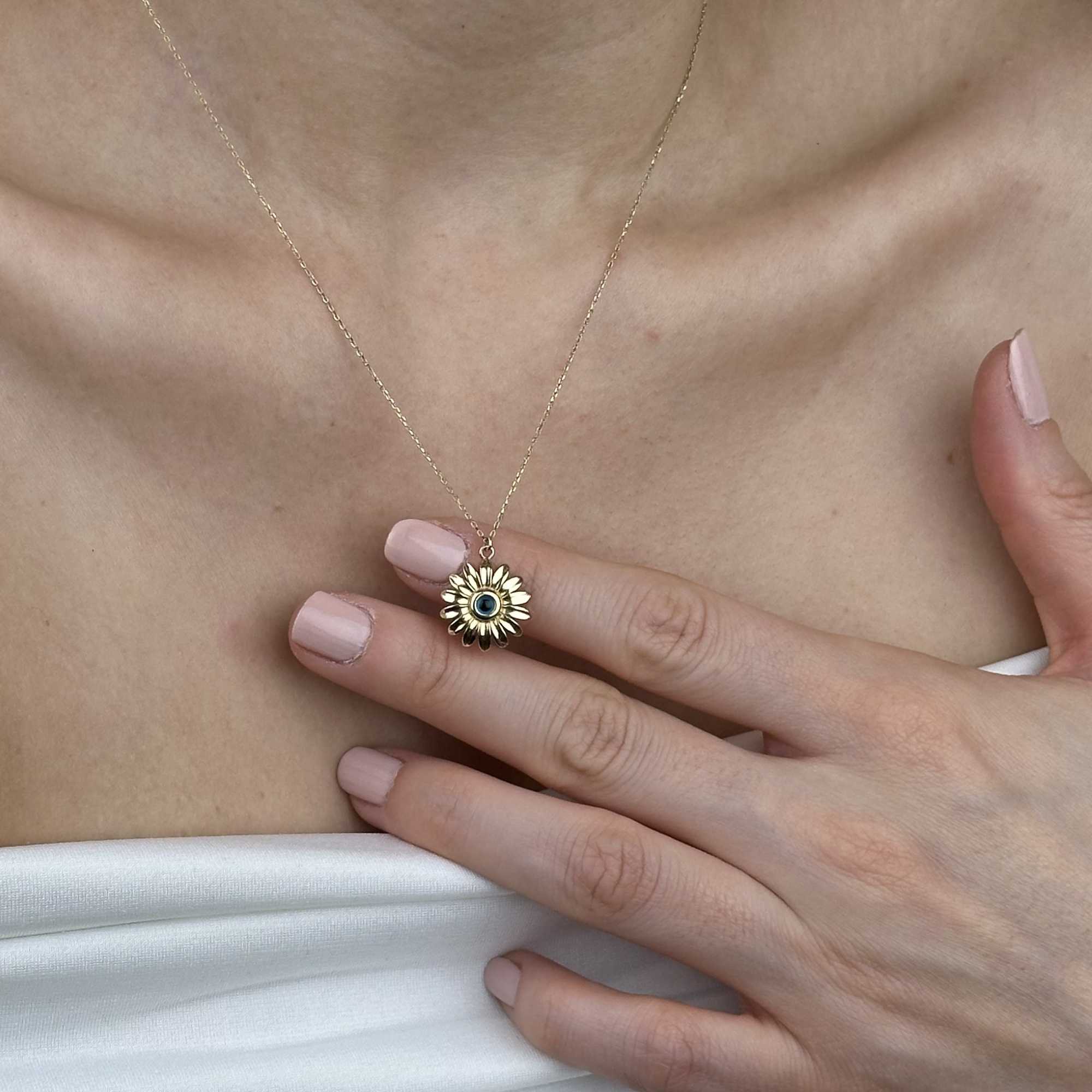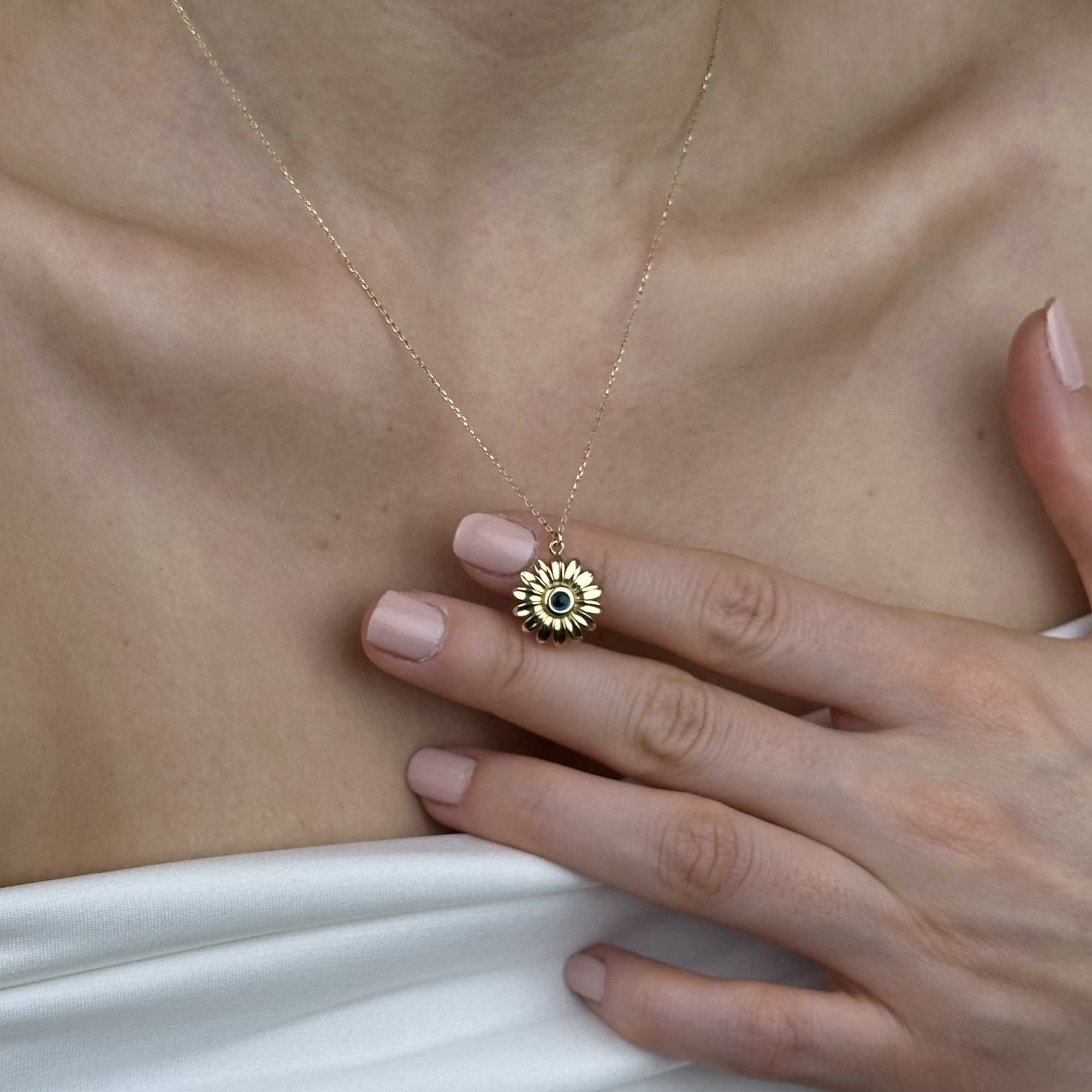 Papatya kolye, zarif ve anlamlı tasarımıyla minimal şıklığı sevenler için özel olarak tasarlanmıştır. 14 ayar sarı altın gövdesi ve mavi zirkon taş detayı sayesinde hem modern hem de dikkat çekici bir görünüm sunar.