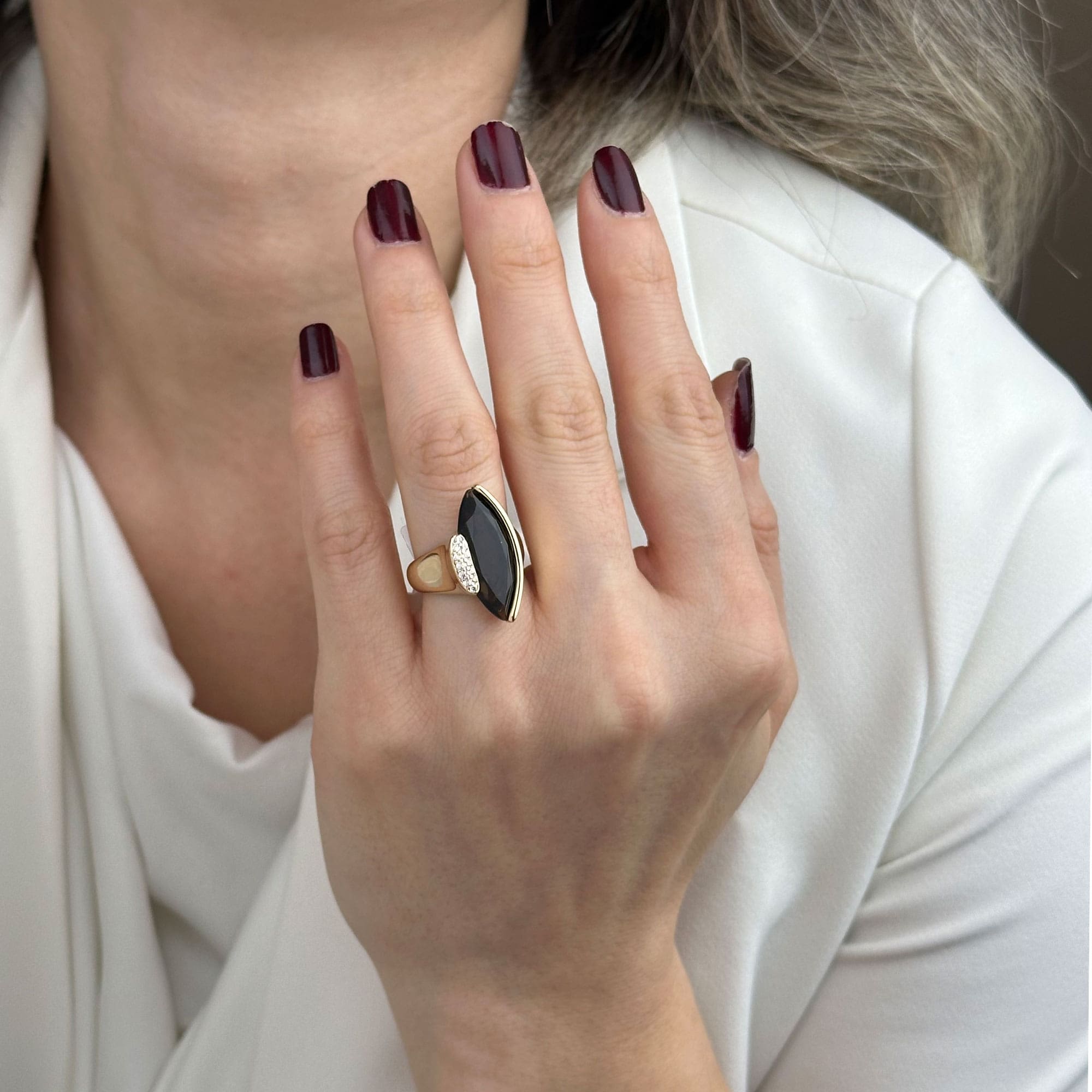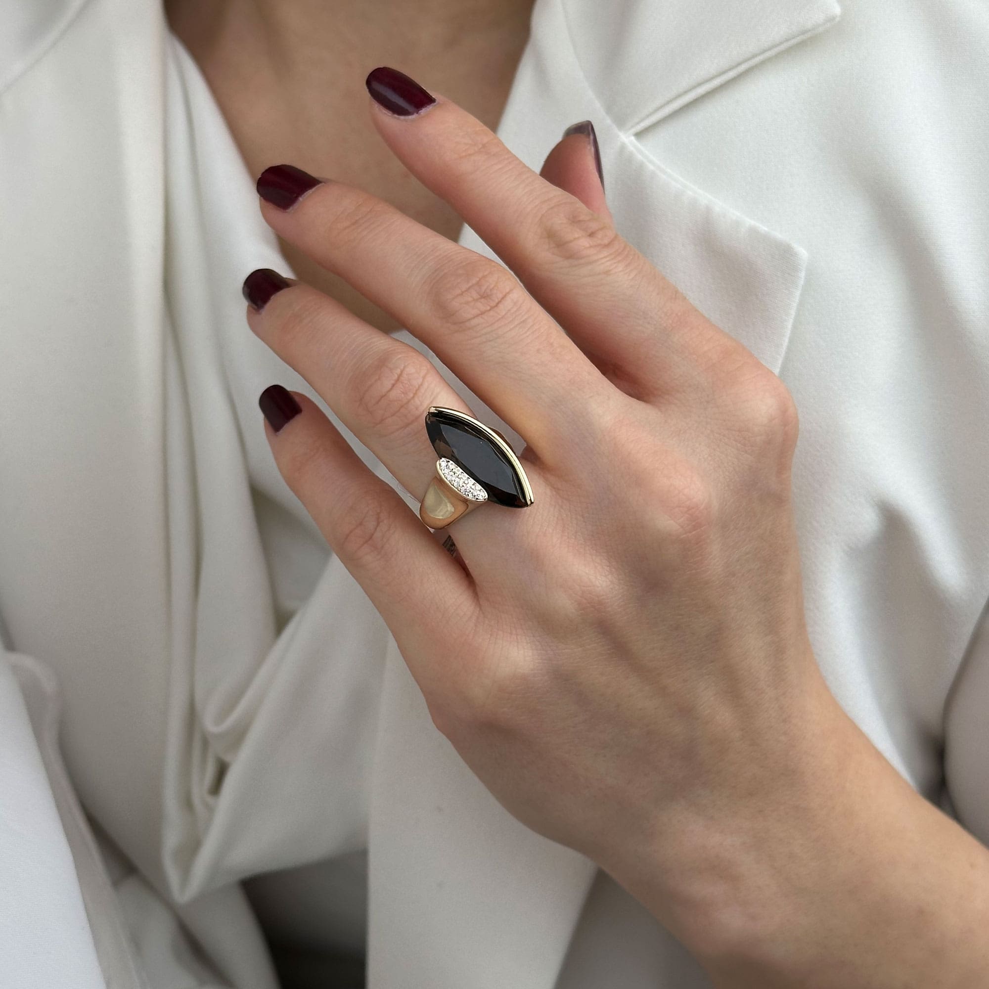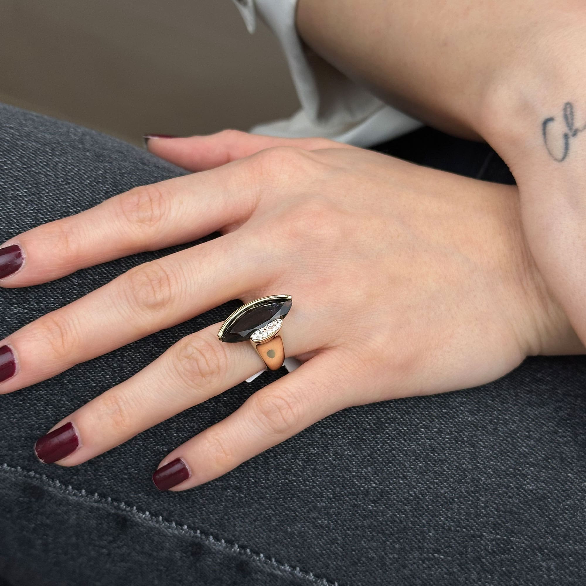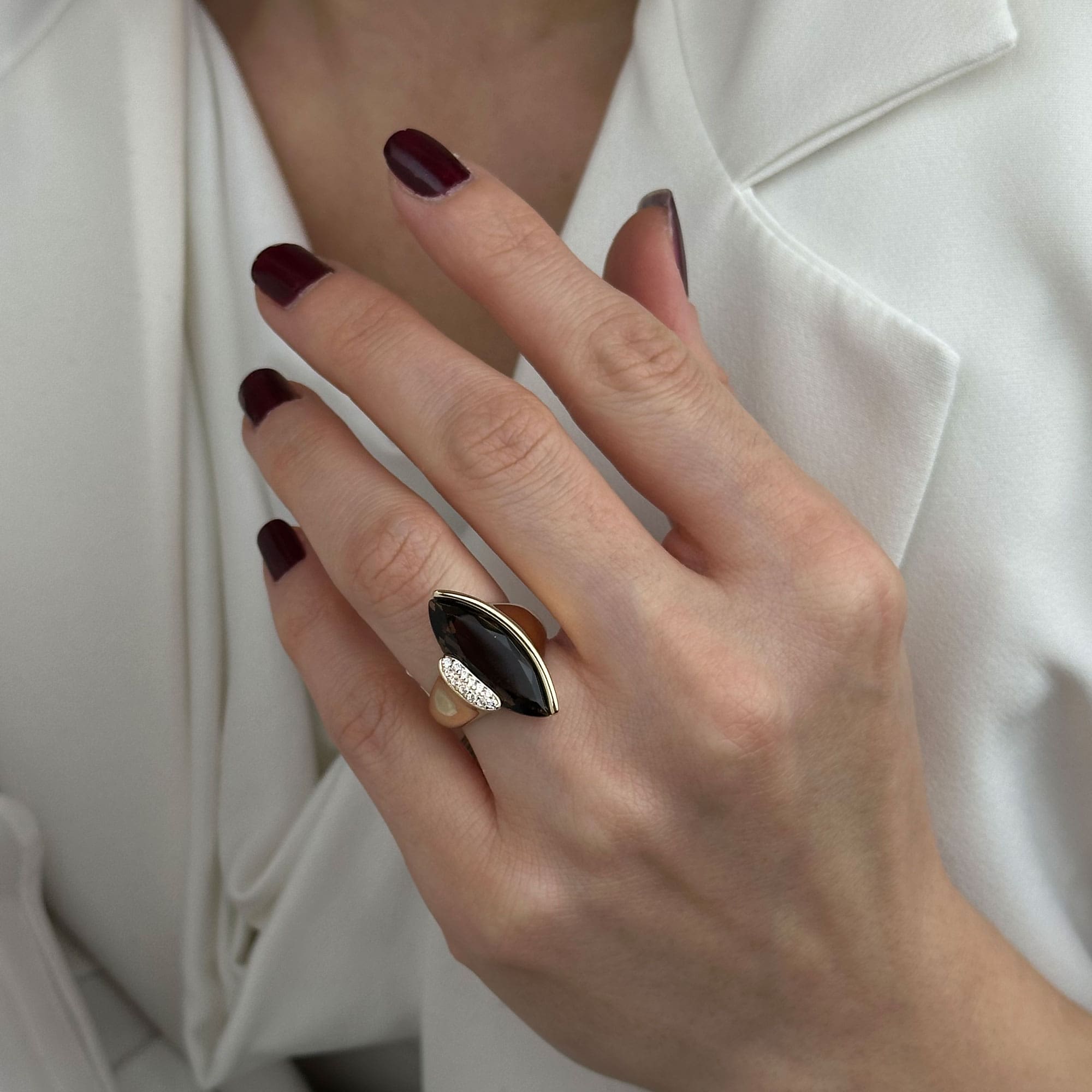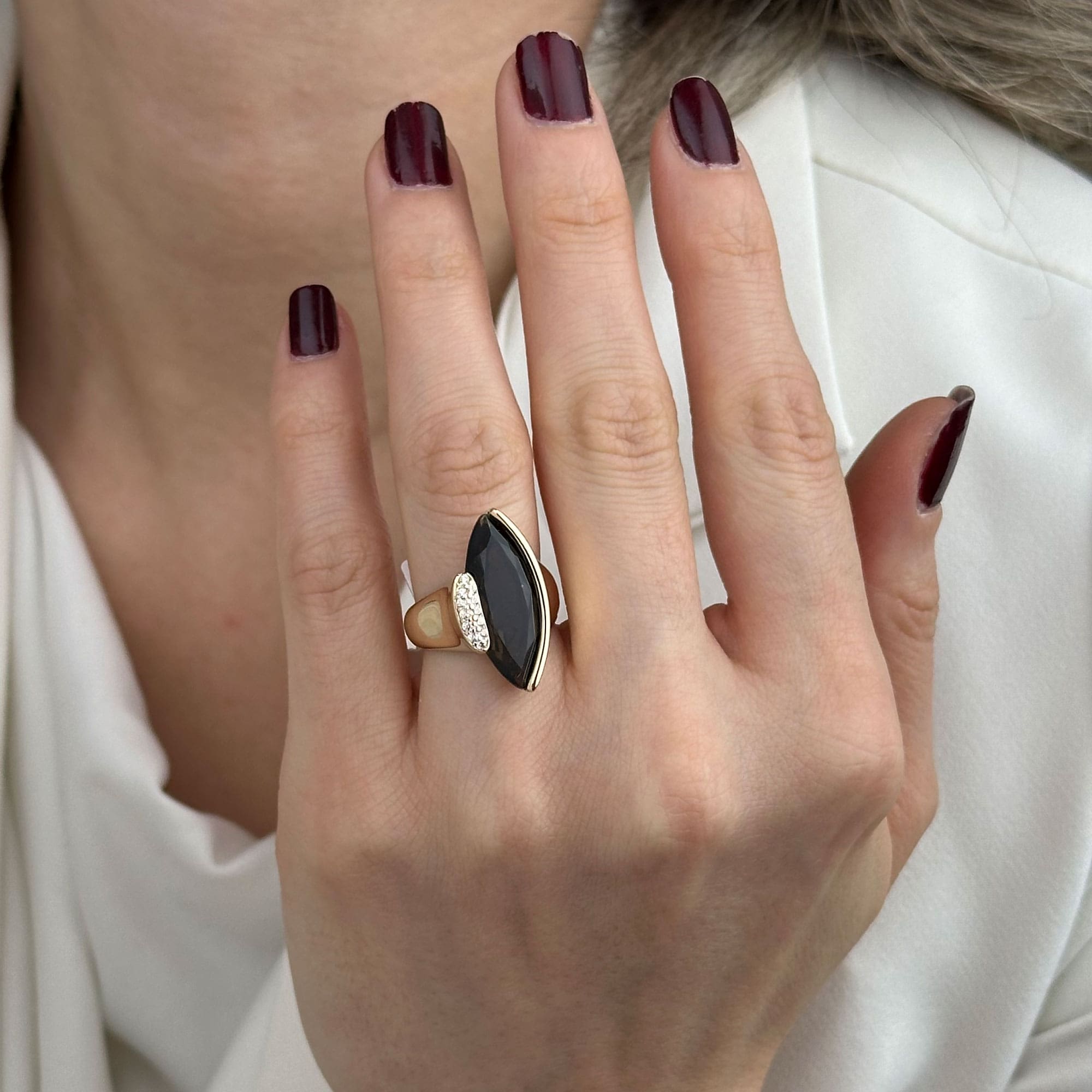 Kahverengi zirkon taşın sıcak tonu ve regold tasarımın modern çizgisi, bu yüzüğe güçlü bir stil kazandırır.