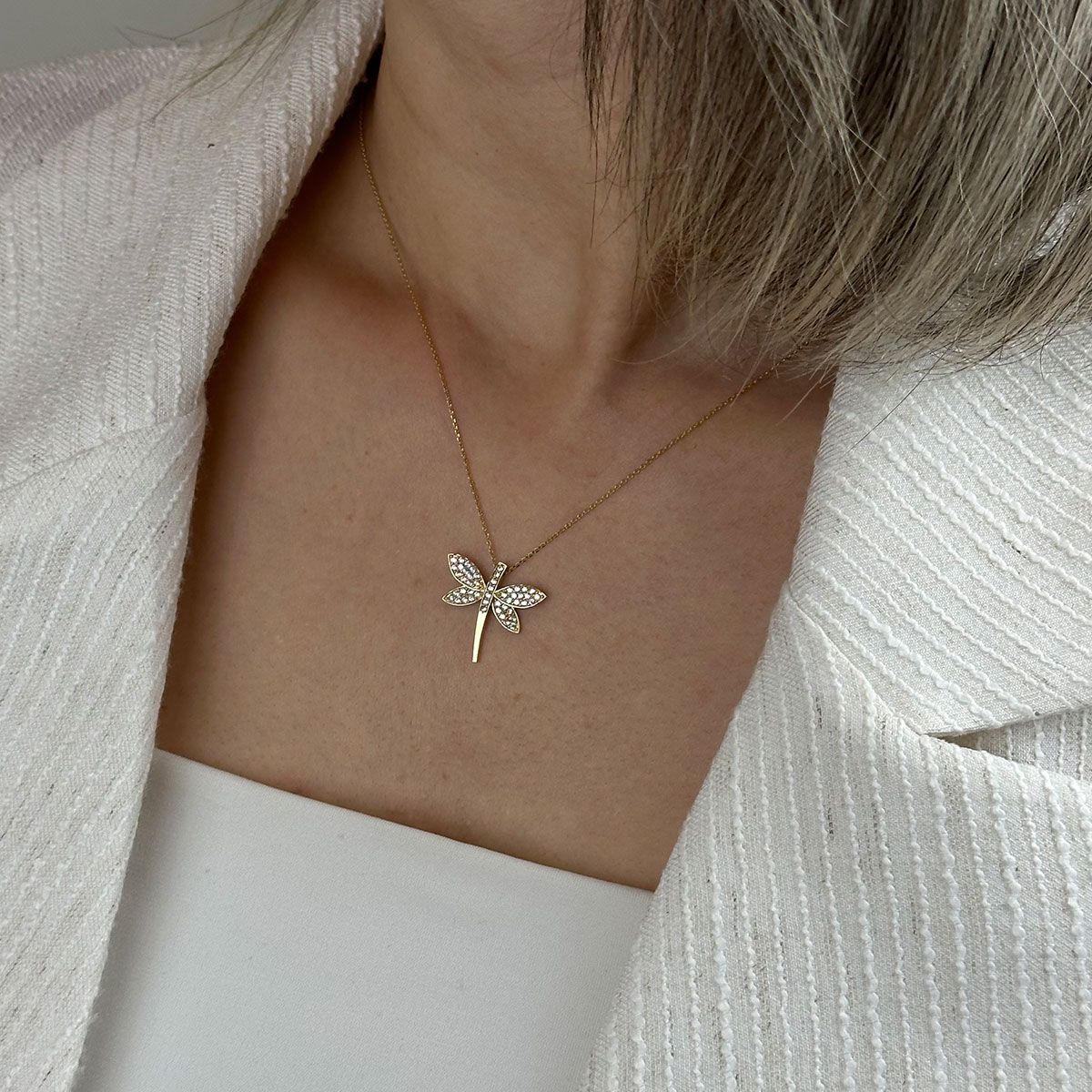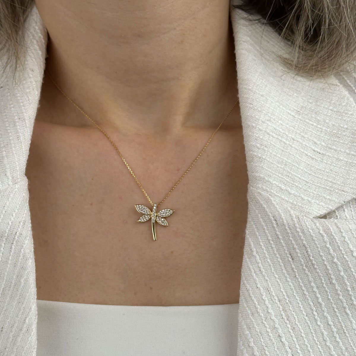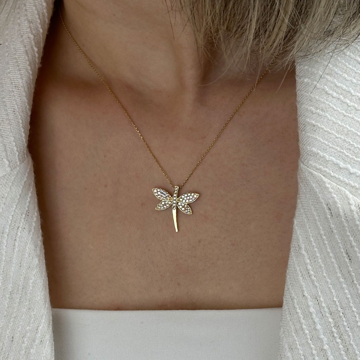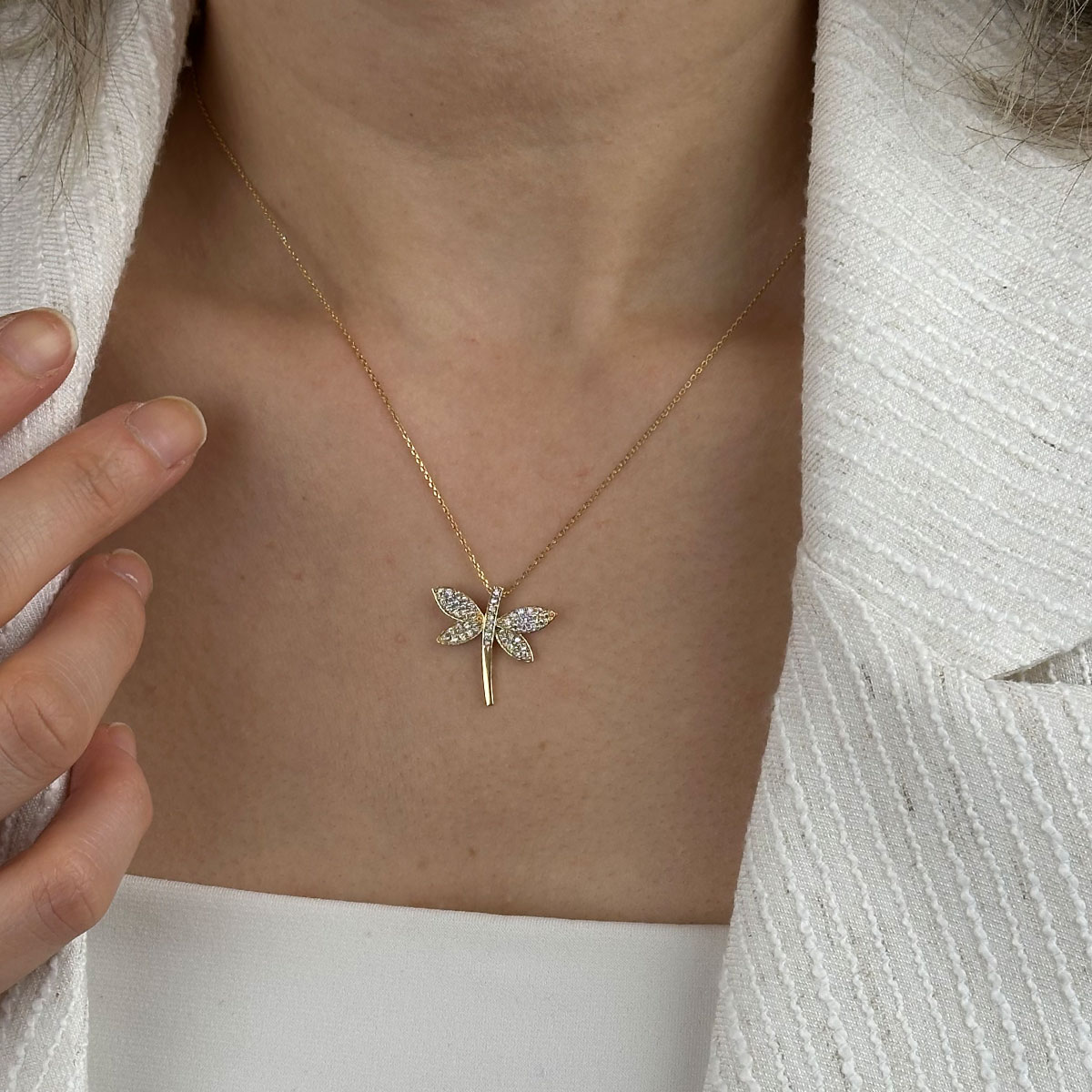 14 ayar altın taşlı yusufçuk kolye, zarif formu ve ışıltılı zirkon taş detaylarıyla modern ve anlamlı bir tasarım sunar. Hafif yapısı sayesinde günlük kullanım için idealdir; özel günlerde ise şık bir tamamlayıcı olur.