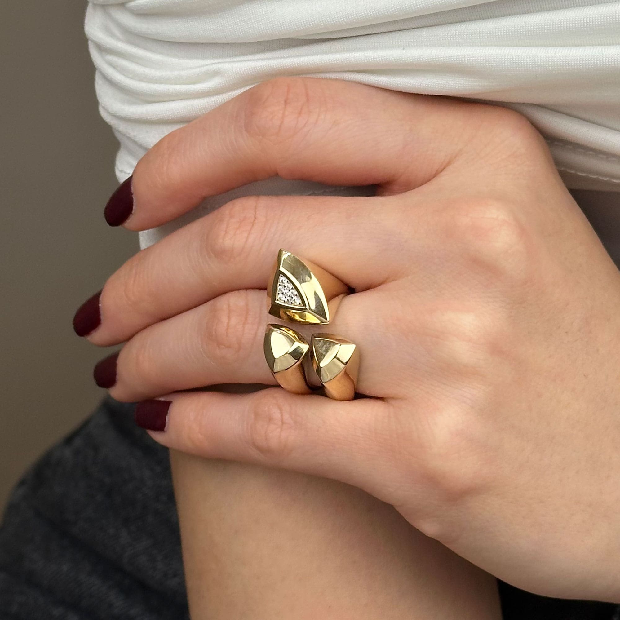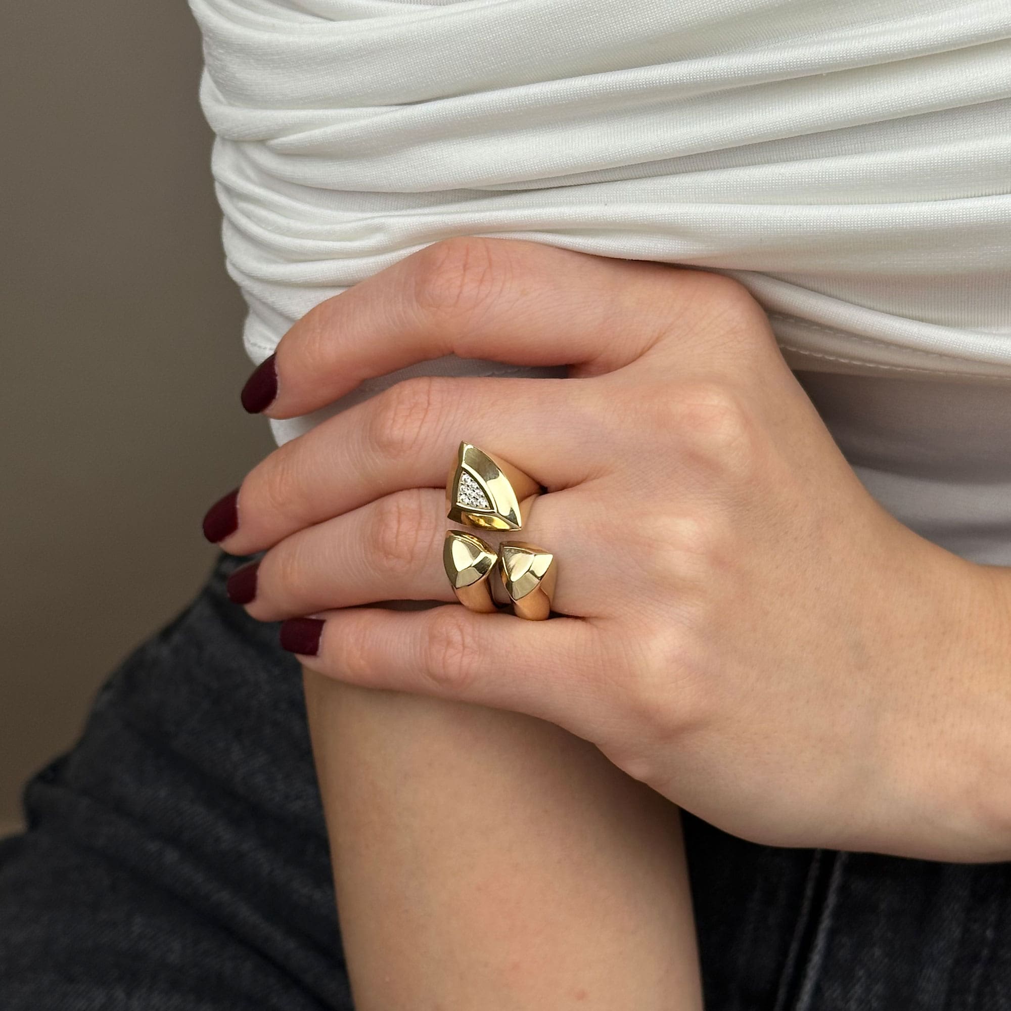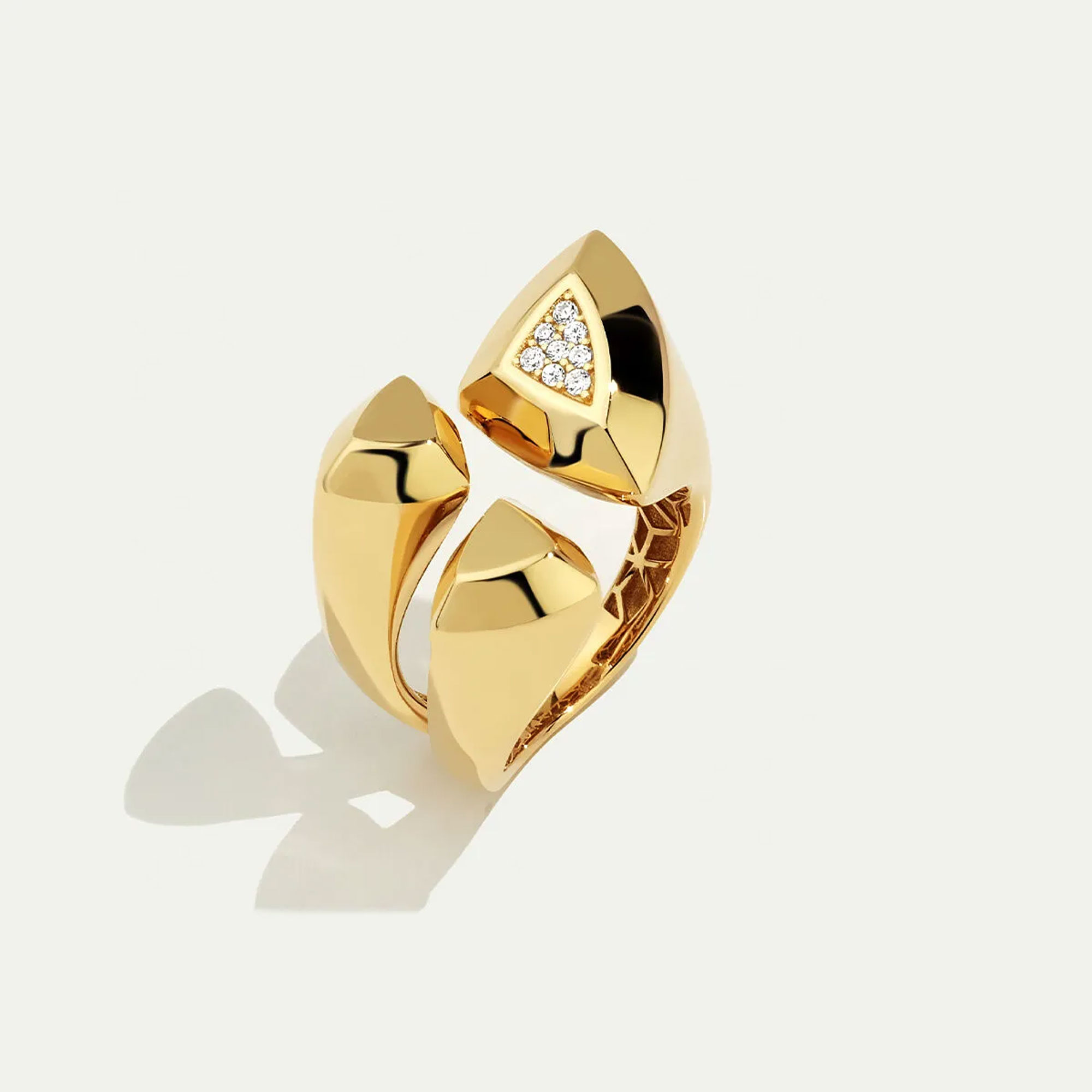 Yaklaşık 4,76 gram ağırlığı sayesinde hafif ve konforlu bir kullanım sağlar. Sarı altın tonu, geometrik üçgen form ile birleşerek yüzüğe zarif ama güçlü bir karakter kazandırır.