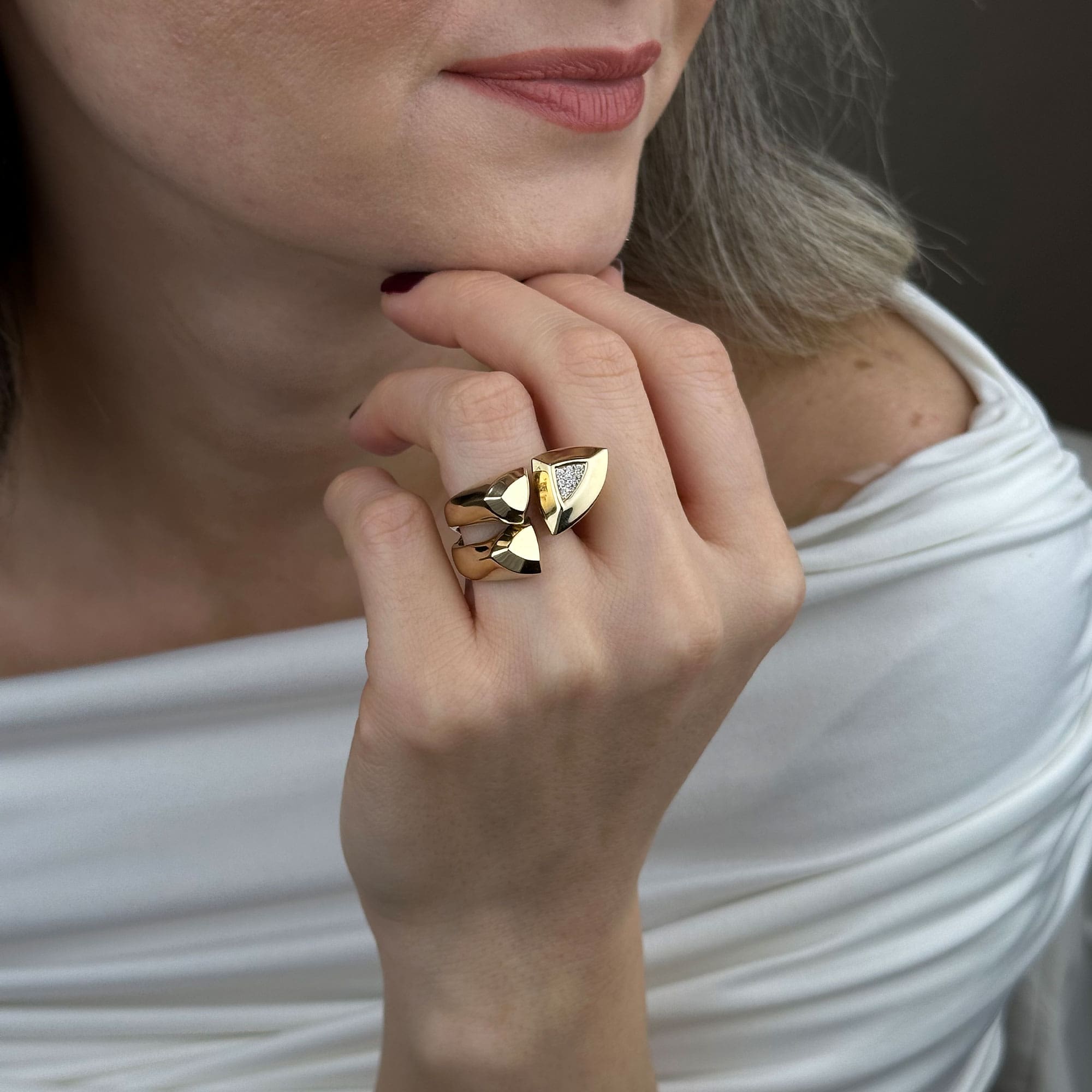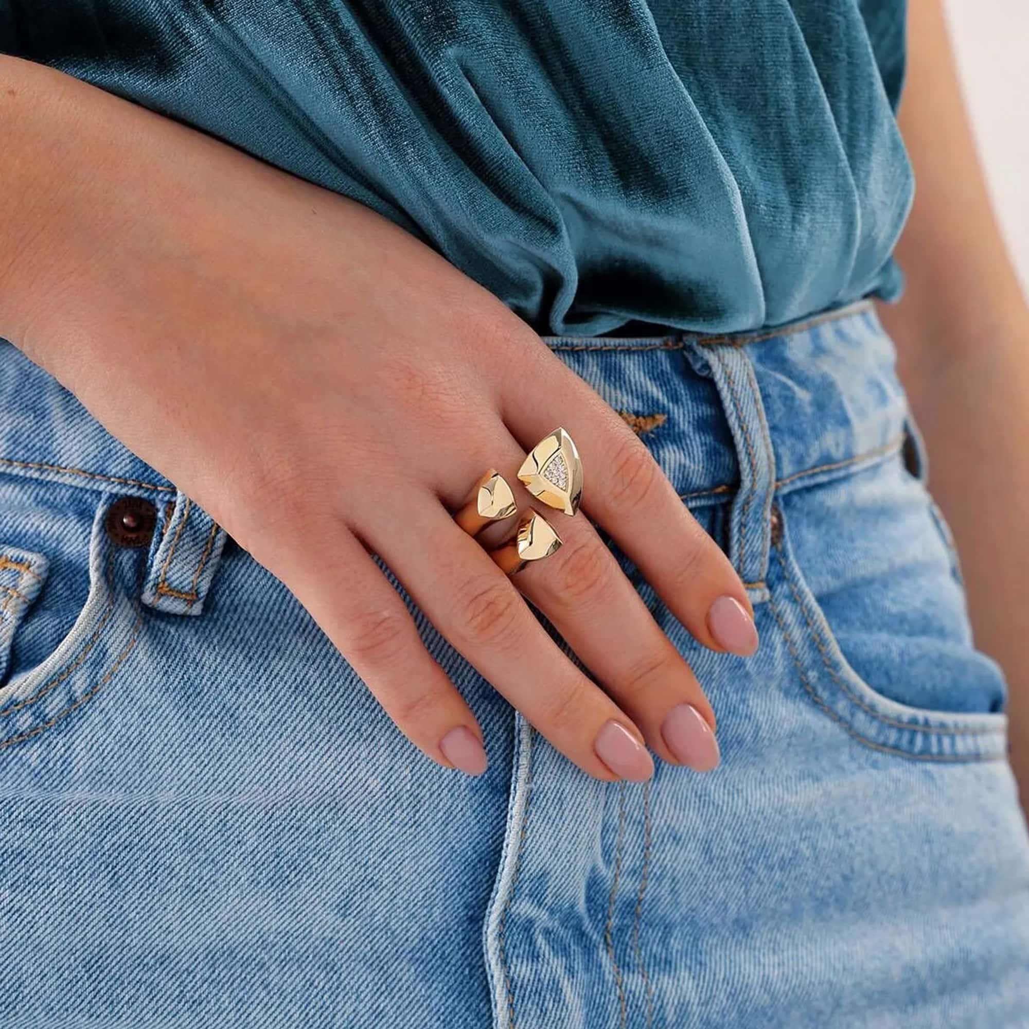 Geometrik üçgen formu ve ışıltılı zirkon taşıyla bu yüzük, modern stilin güçlü bir ifadesidir.