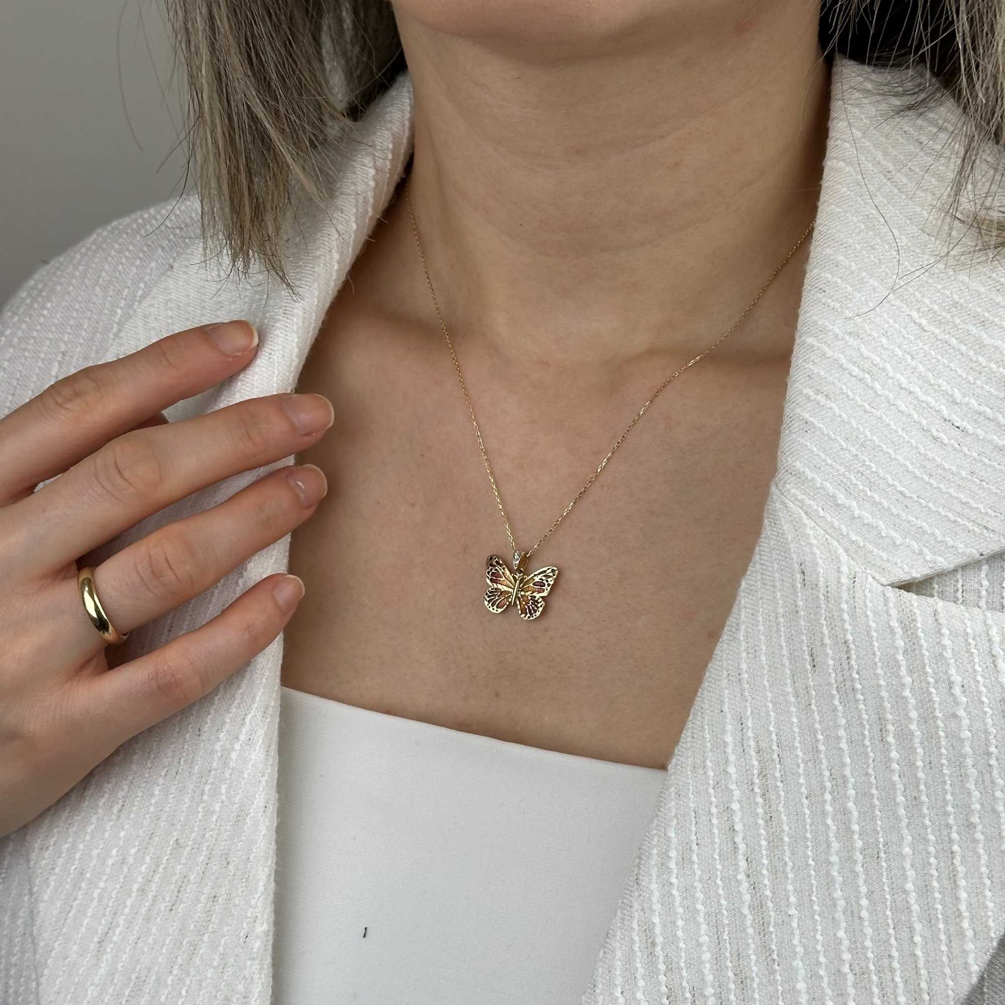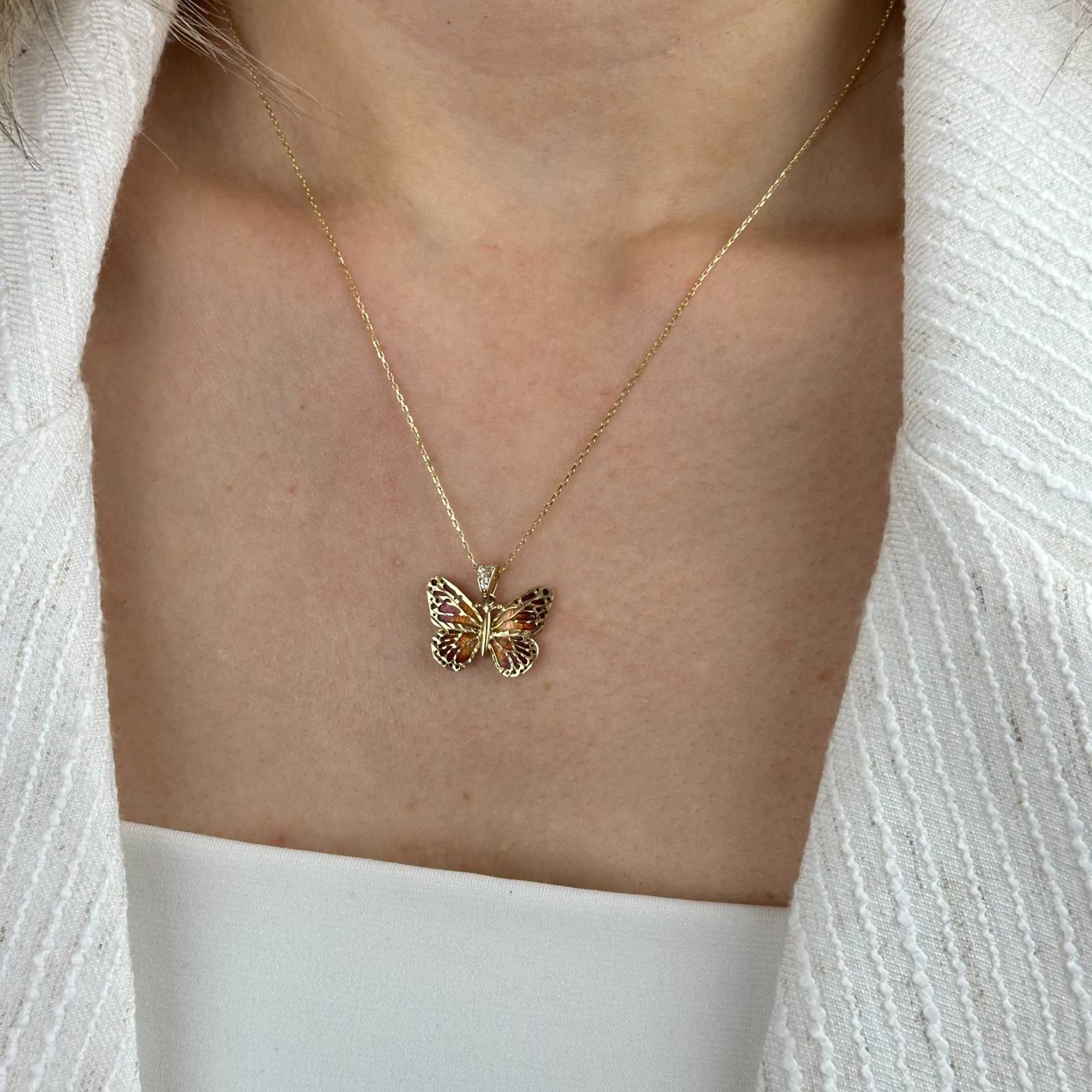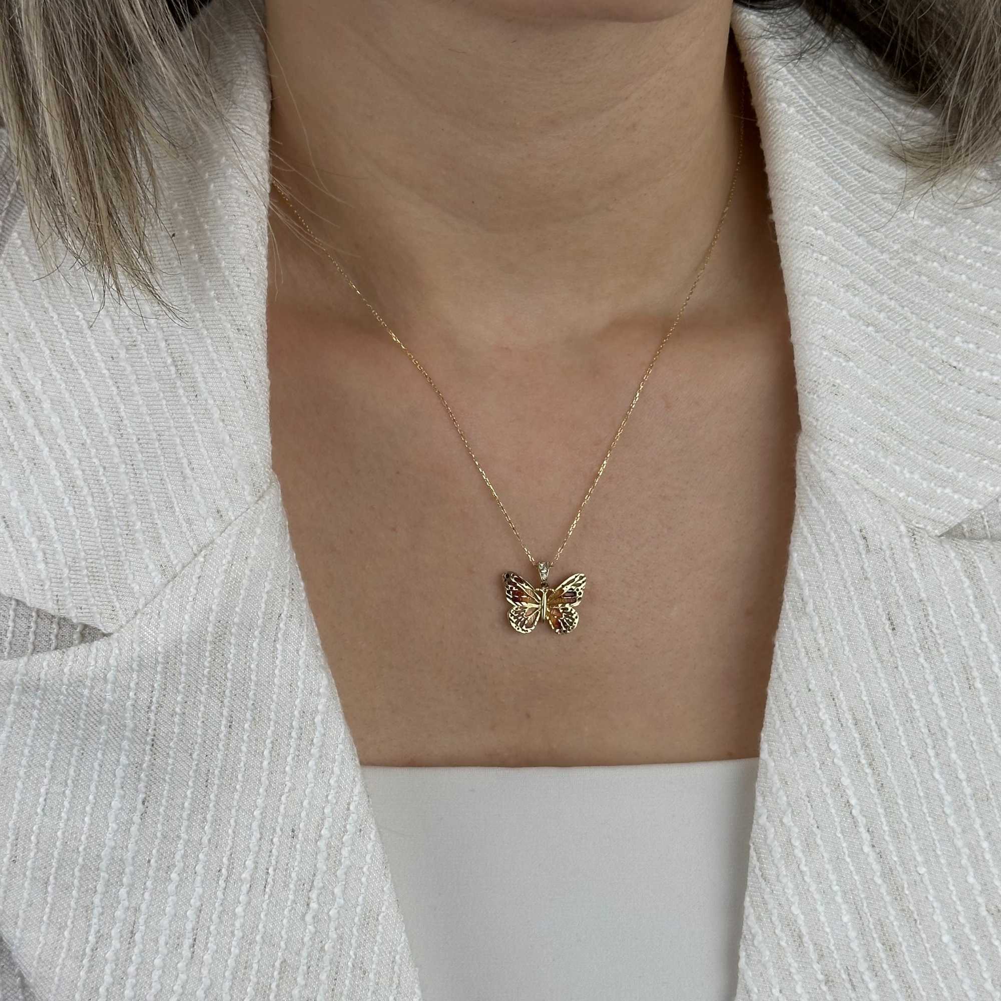 14 ayar altın turuncu mineli kelebek kolye, zarif tasarımı ve canlı rengiyle günlük şıklığı tamamlayan özel bir aksesuardır. Kelebek figürü; özgürlük, yenilenme ve zarafeti simgelerken, turuncu mine detayı kolyeye enerjik ve modern bir karakter kazandırır.