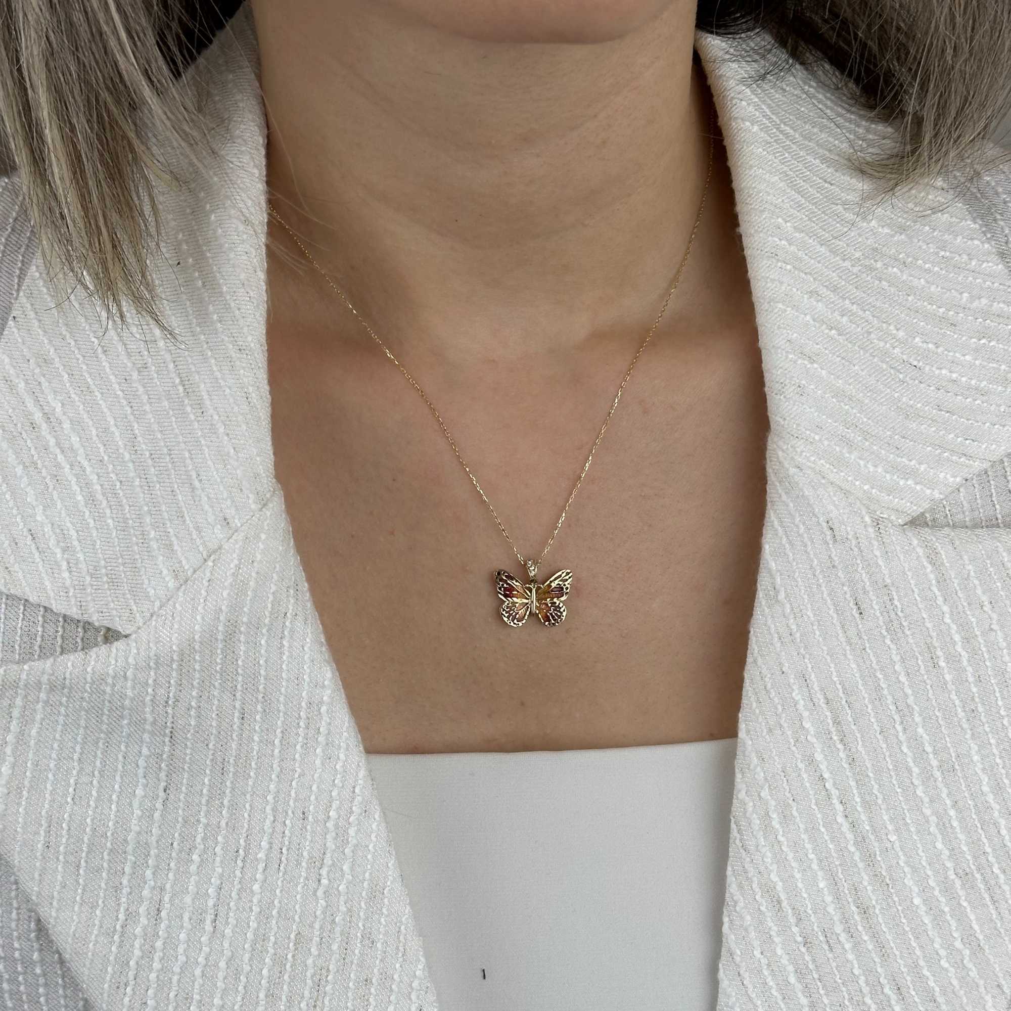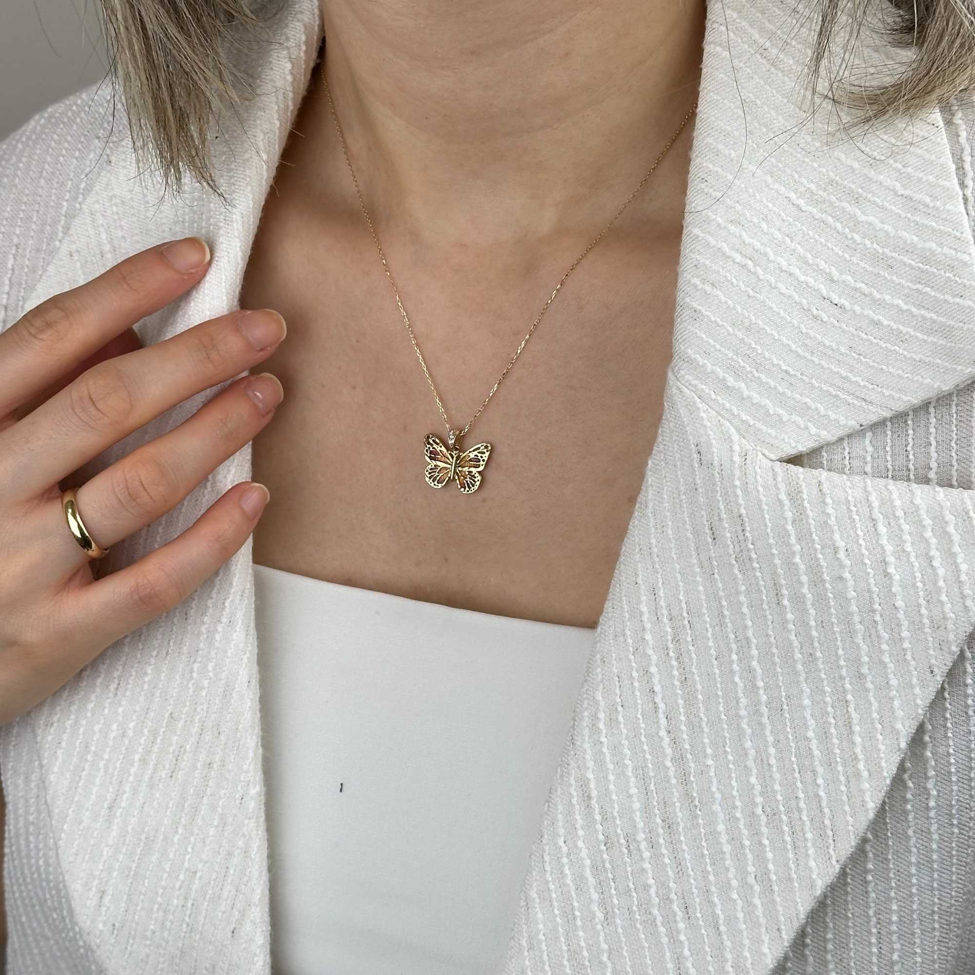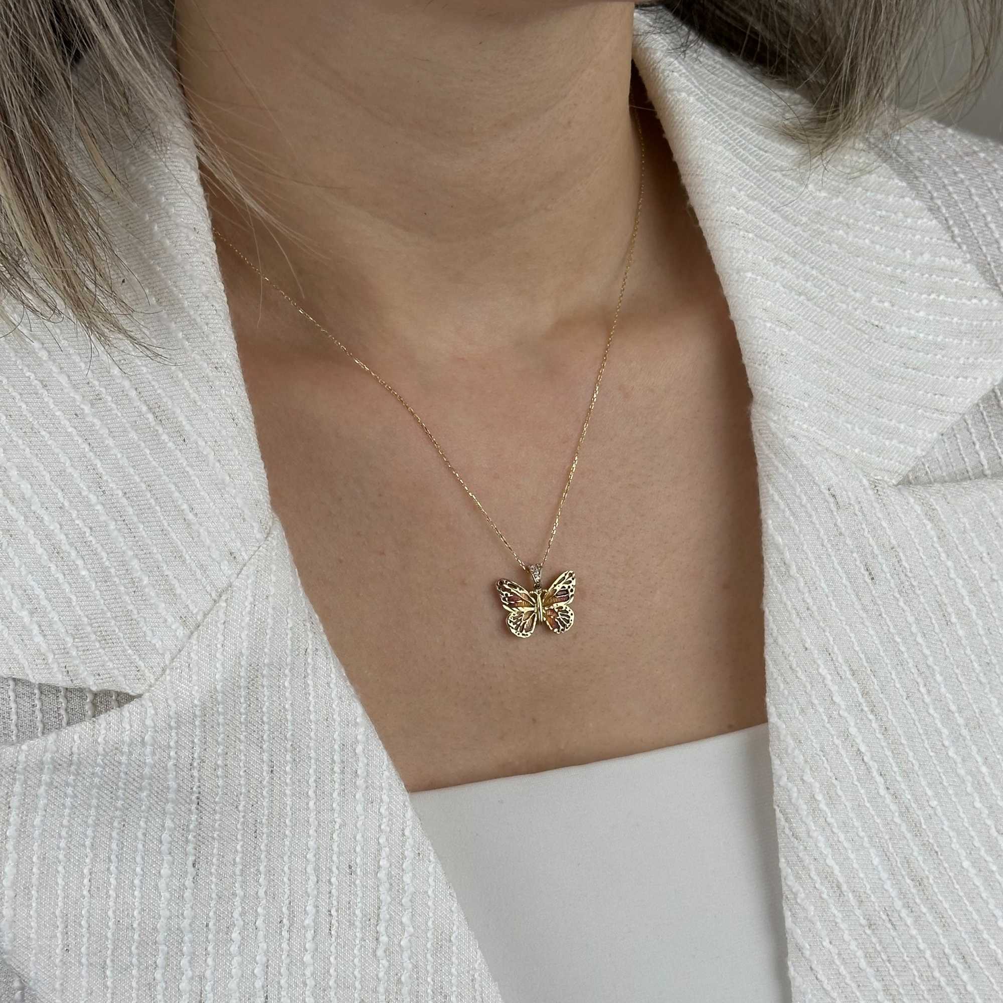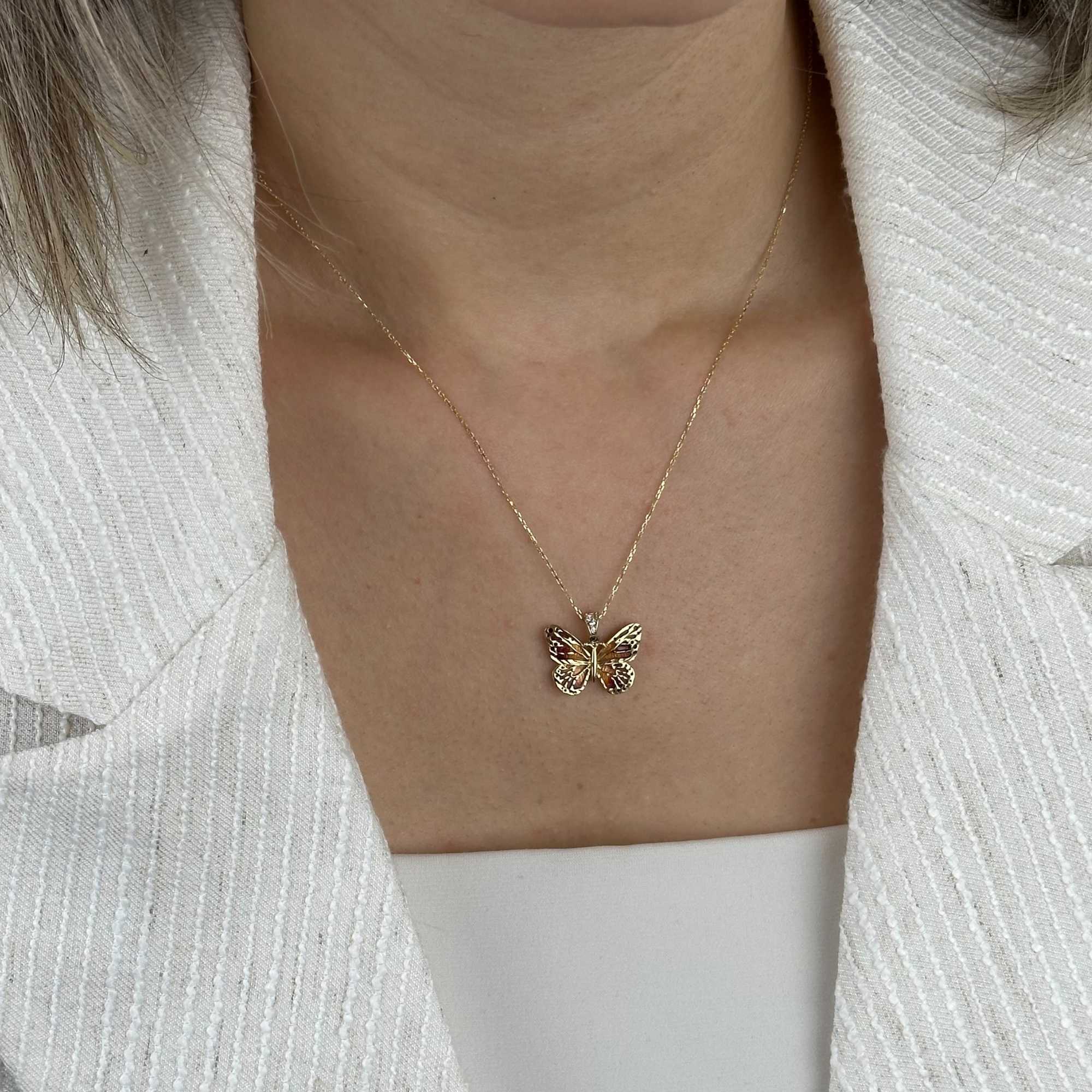 14 ayar altın turuncu mineli kelebek kolye, zarif tasarımı ve canlı rengiyle günlük şıklığı tamamlayan özel bir aksesuardır. Kelebek figürü; özgürlük, yenilenme ve zarafeti simgelerken, turuncu mine detayı kolyeye enerjik ve modern bir karakter kazandırır.