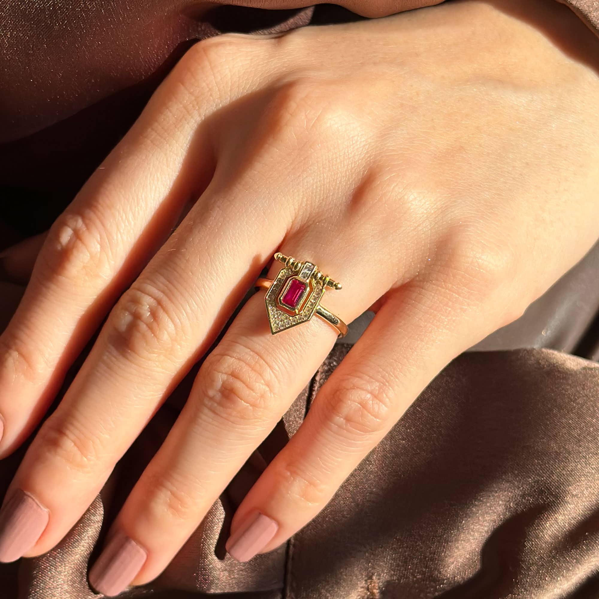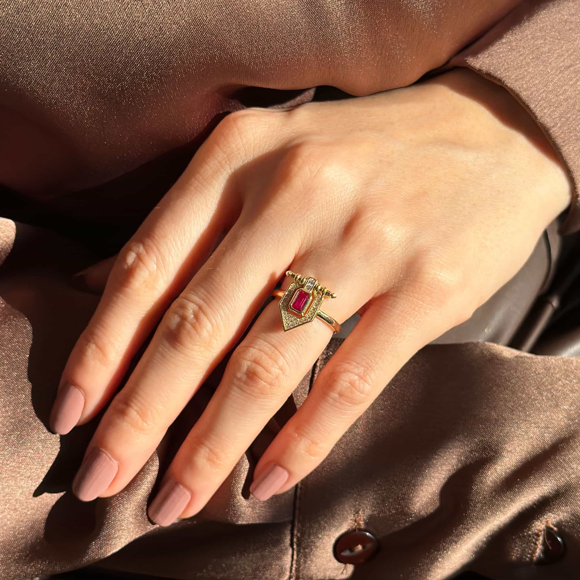14 ayar altının dayanıklılığı ile vintage tasarımın zamansız estetiğini bir araya getiren bu özel yüzük, pembe ruby taşın büyüleyici enerjisiyle tamamlanıyor. El işçiliği detayları, yüzüğe benzersiz bir karakter kazandırırken her ışıkta farklı bir ışıltı sunar.