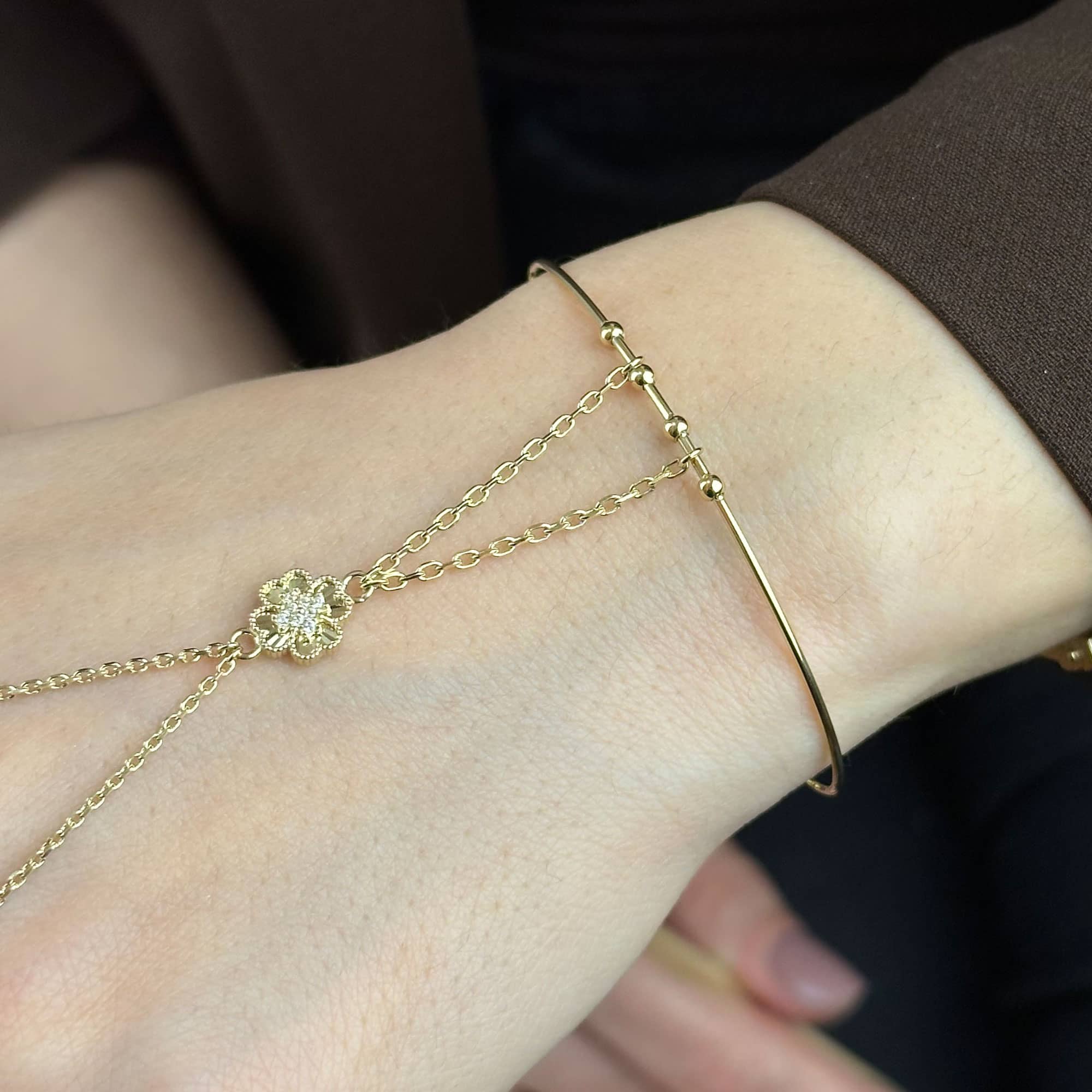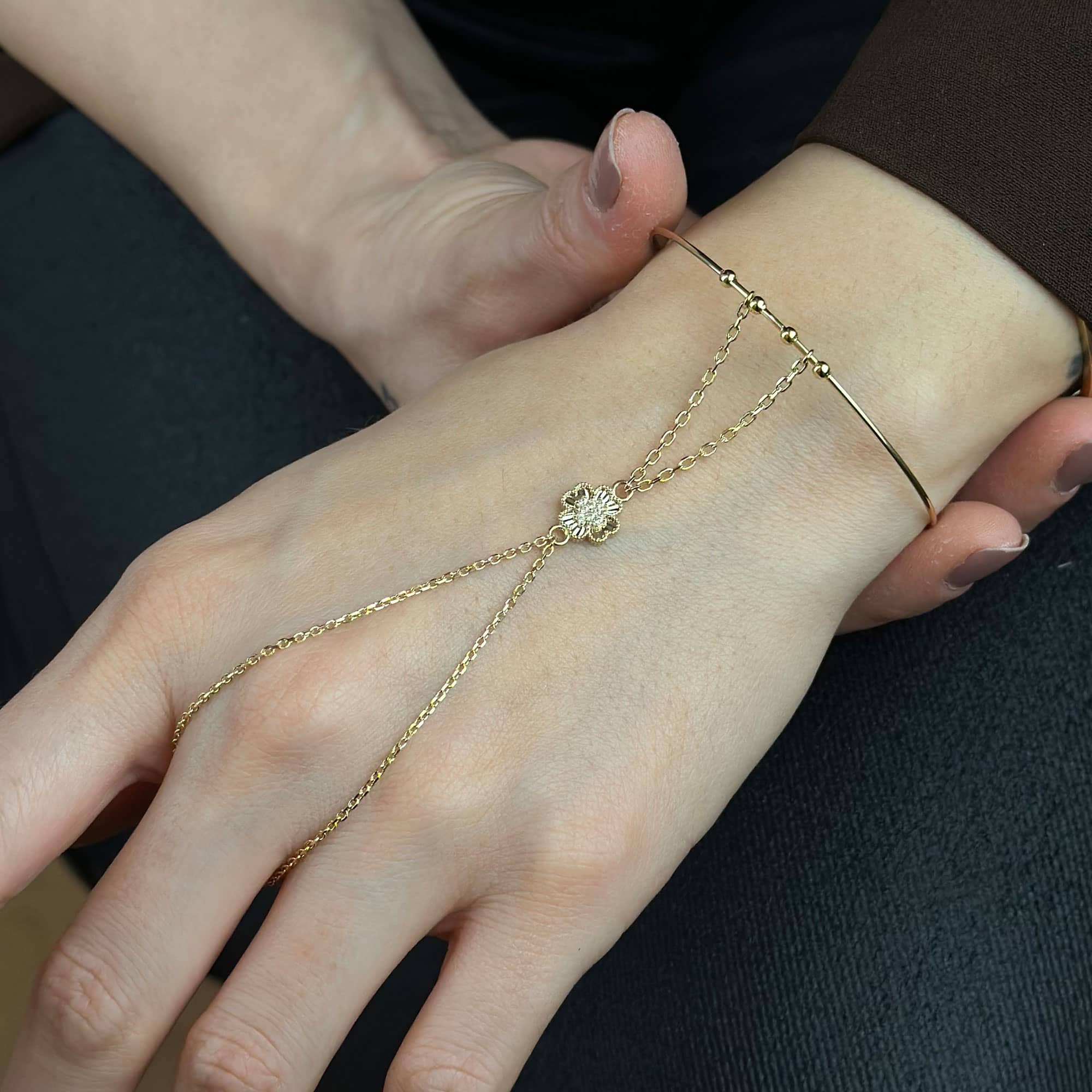 Yonca motifli şahmeran bileklik, şahmeran formunun zarif yapısını yonca sembolünün şans ve bereket anlamı ile birleştirir. El üstünden bileğe uzanan zincir detayı, takıya modern ve dikkat çekici bir görünüm kazandırır.
