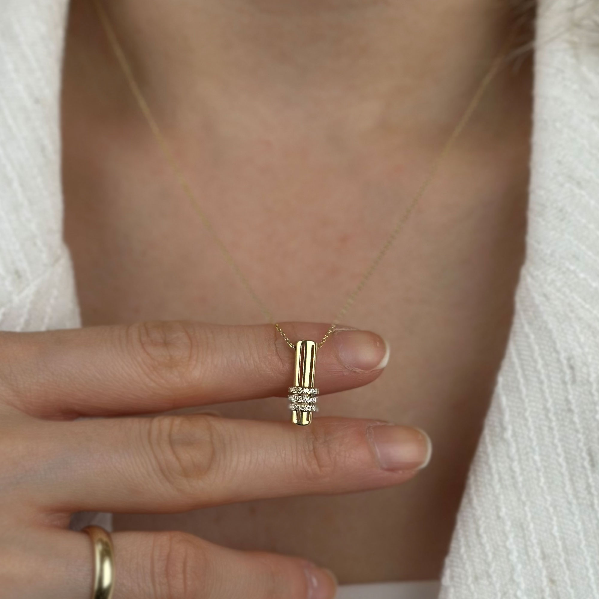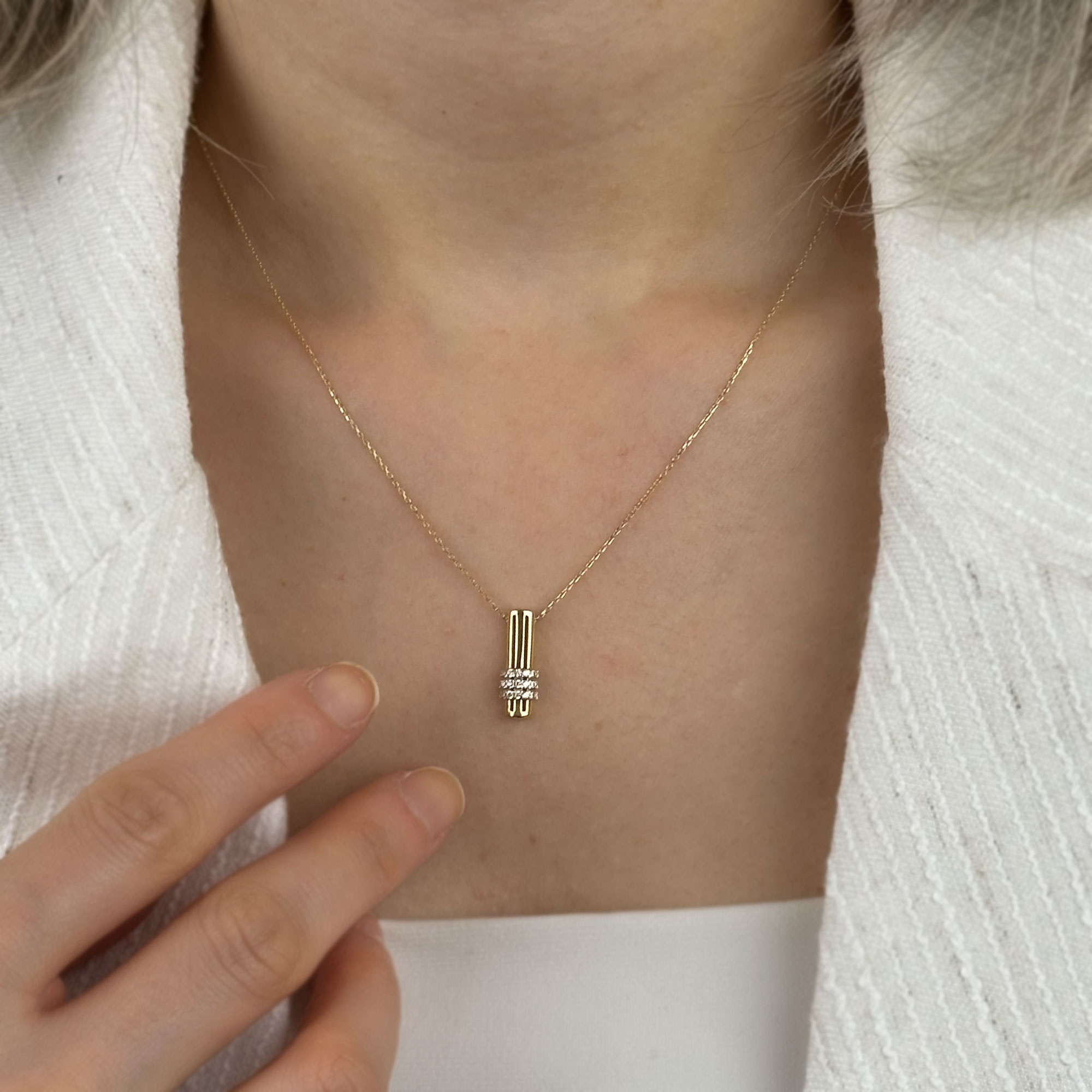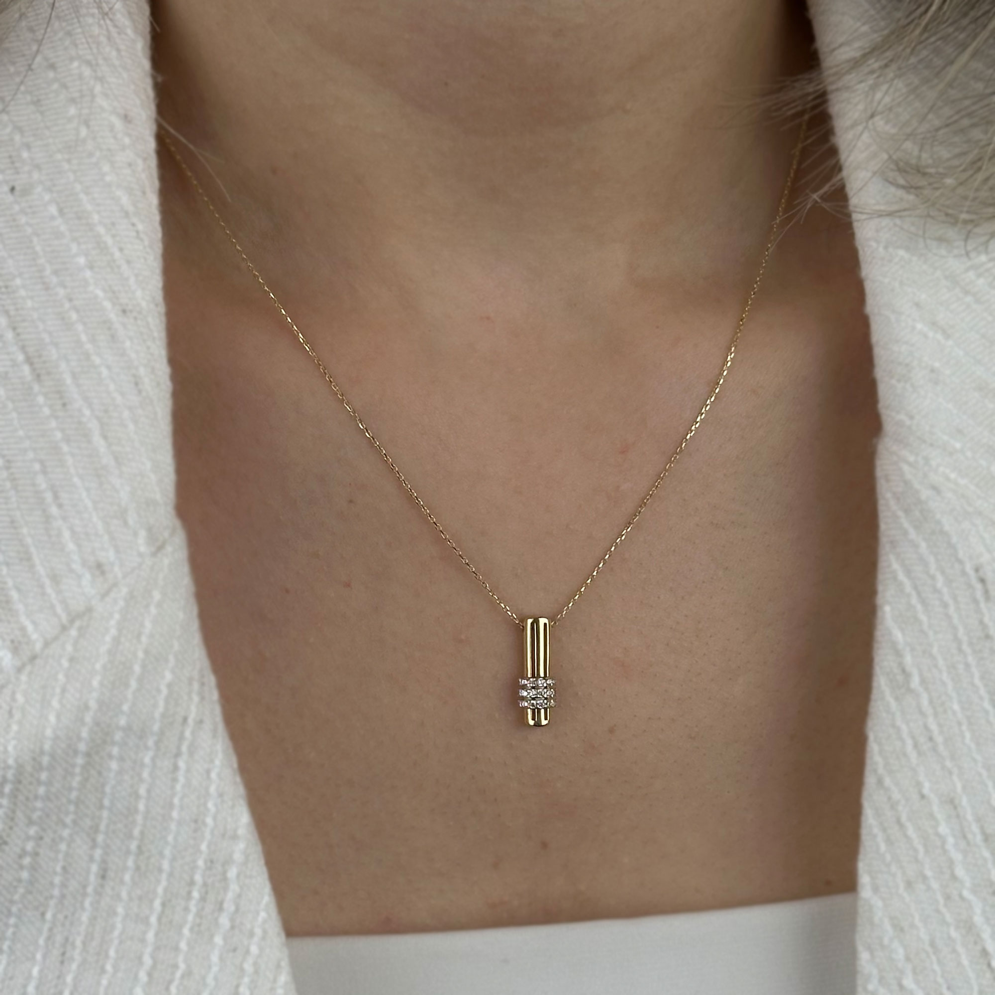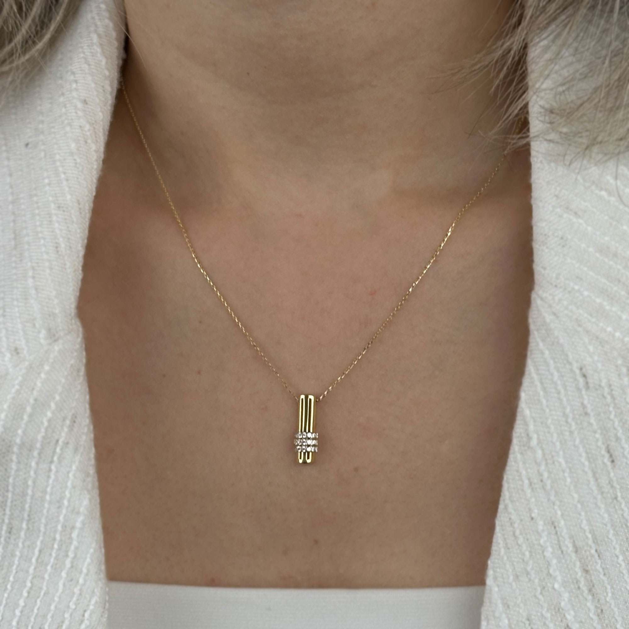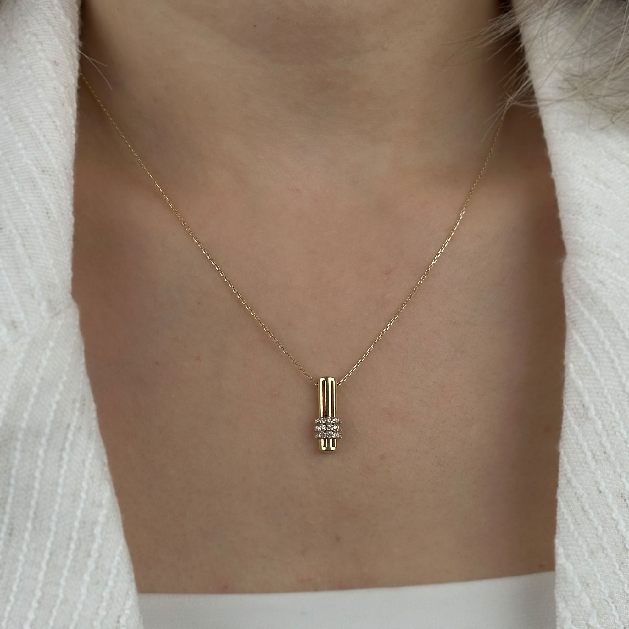 Taşlı altın kolye arayanlar için modern ve minimal bir seçenek: bar taşlı kolye tasarımı. 14 ayar altın ile üretilen bu model, taş detaylı bar formu sayesinde zarif bir ışıltı sunar ve günlük kullanımda kolayca kombinlenebilir.