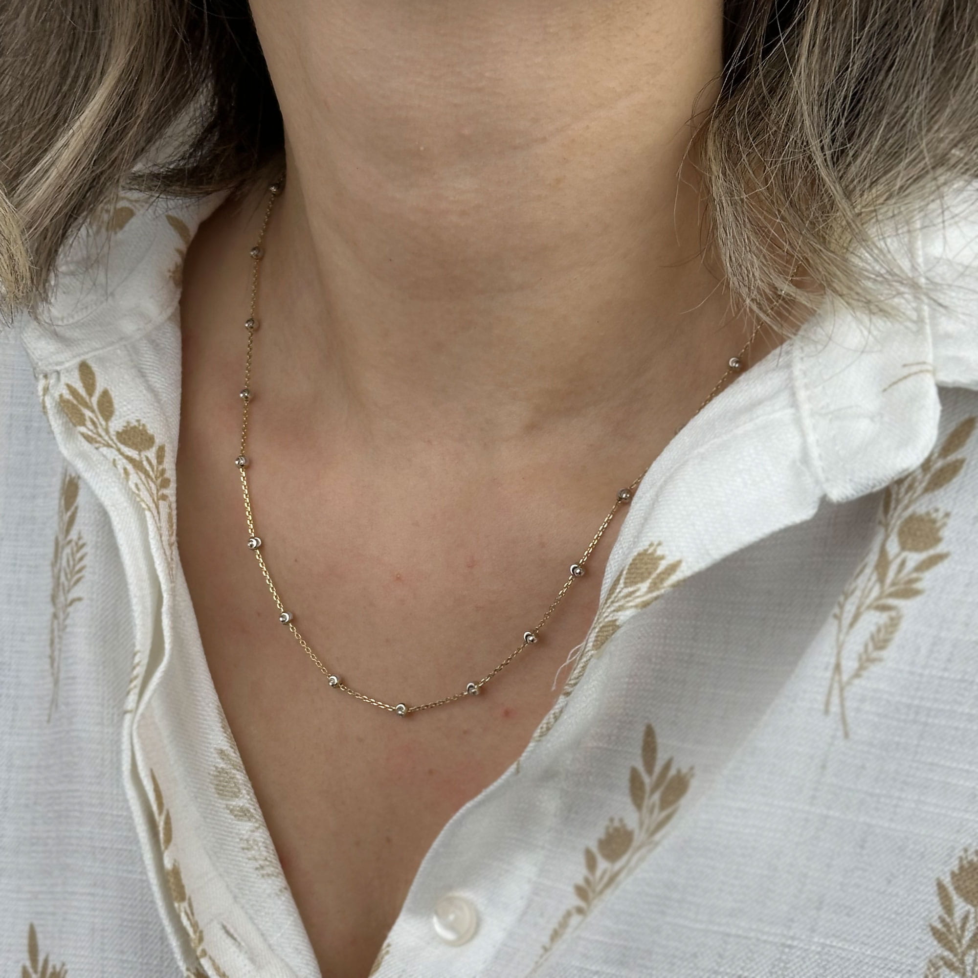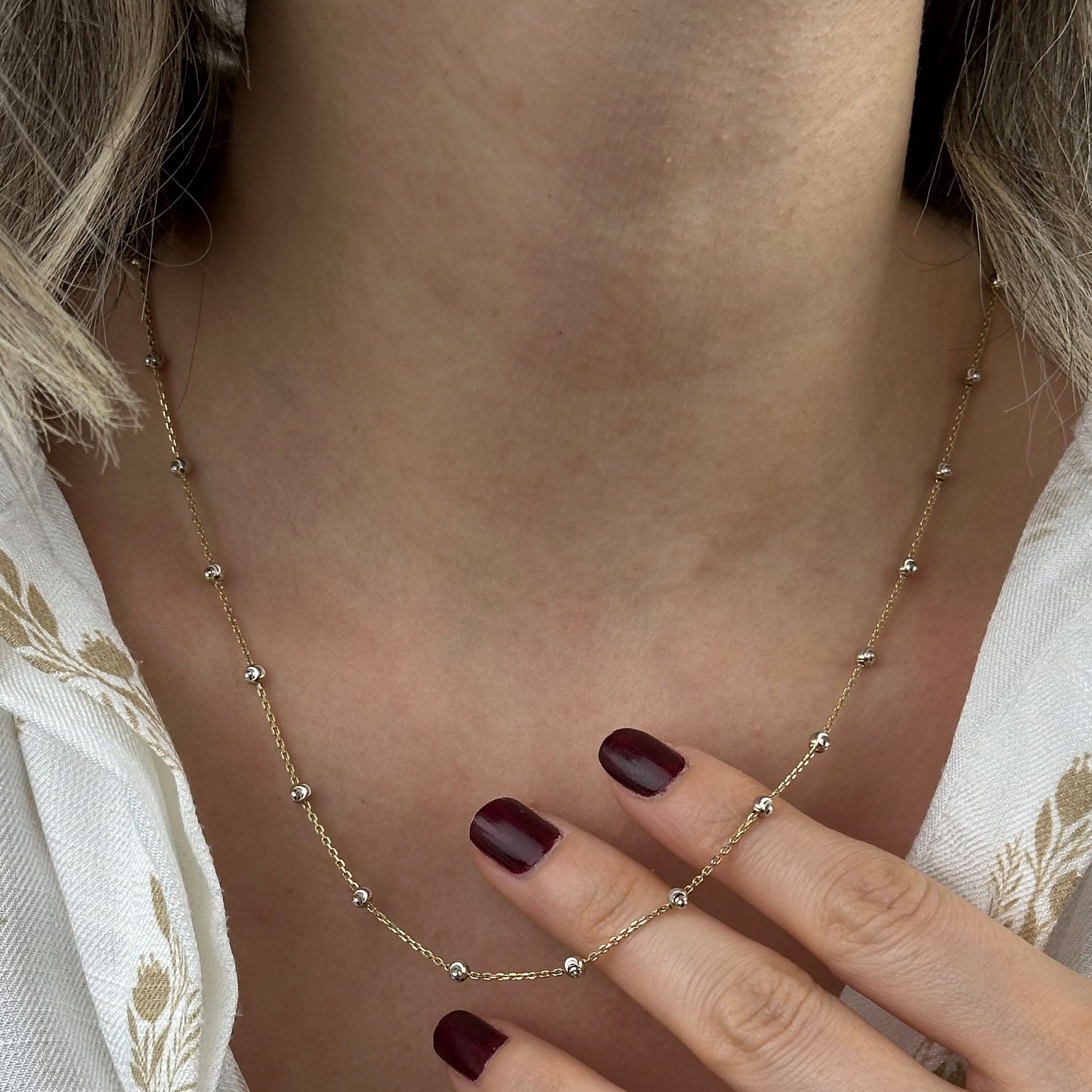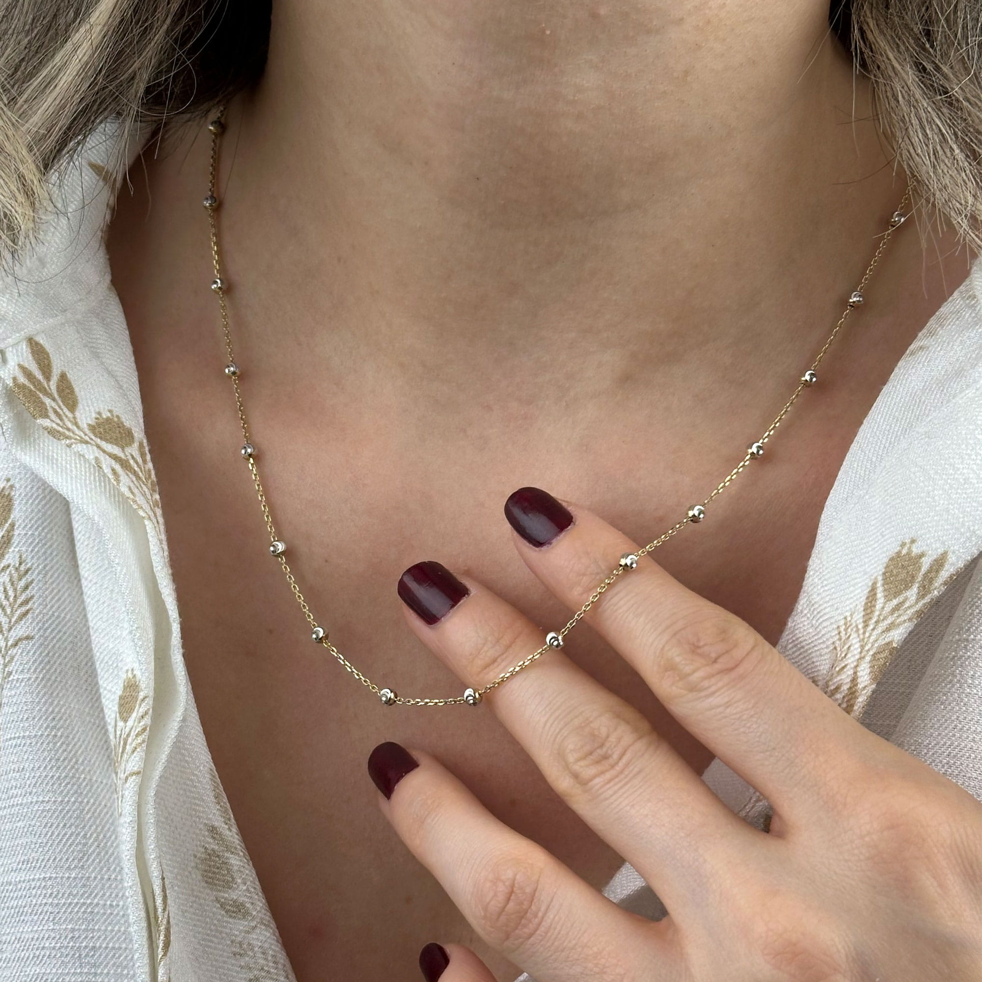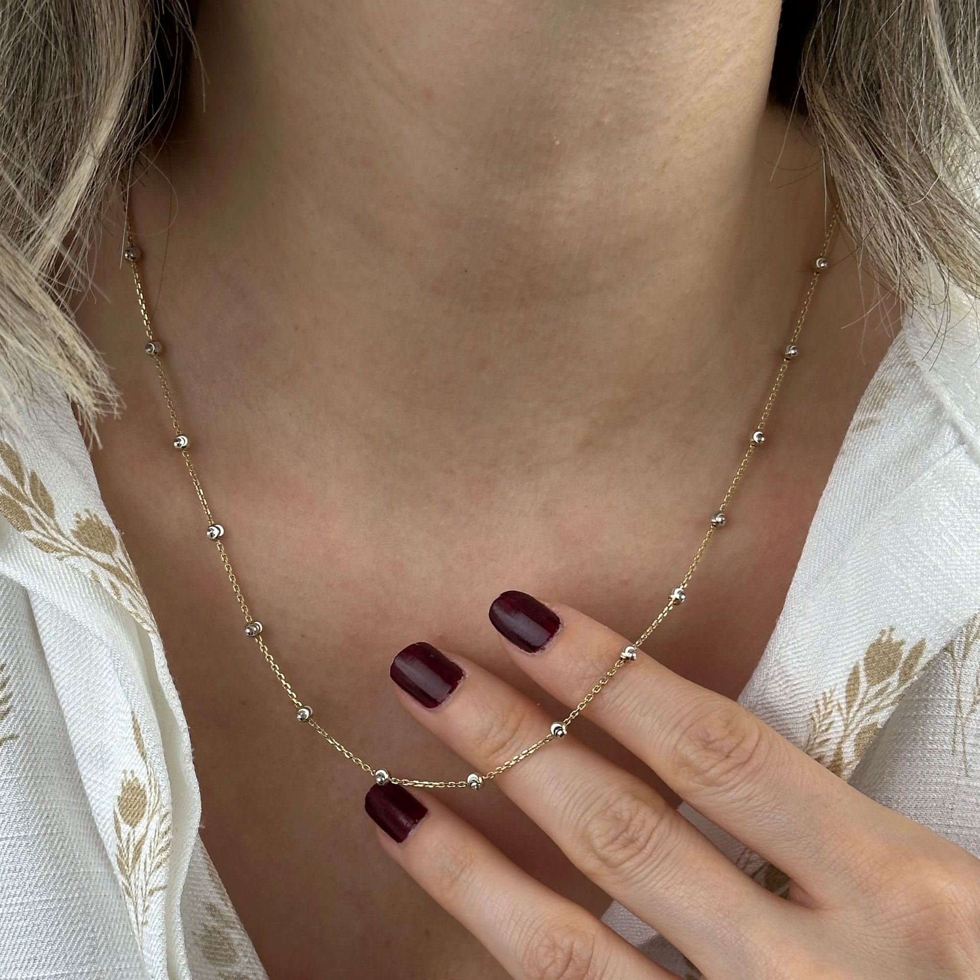 14 ayar beyaz altın dorika kolye, zarif zincir yapısı ve ritmik dorika detaylarıyla modern ve sofistike bir görünüm sunar. Günlük kombinlerde minimal bir şıklık sağlar; özel günlerde ise zarif ve anlamlı bir hediye alternatifi olarak öne çıkar.