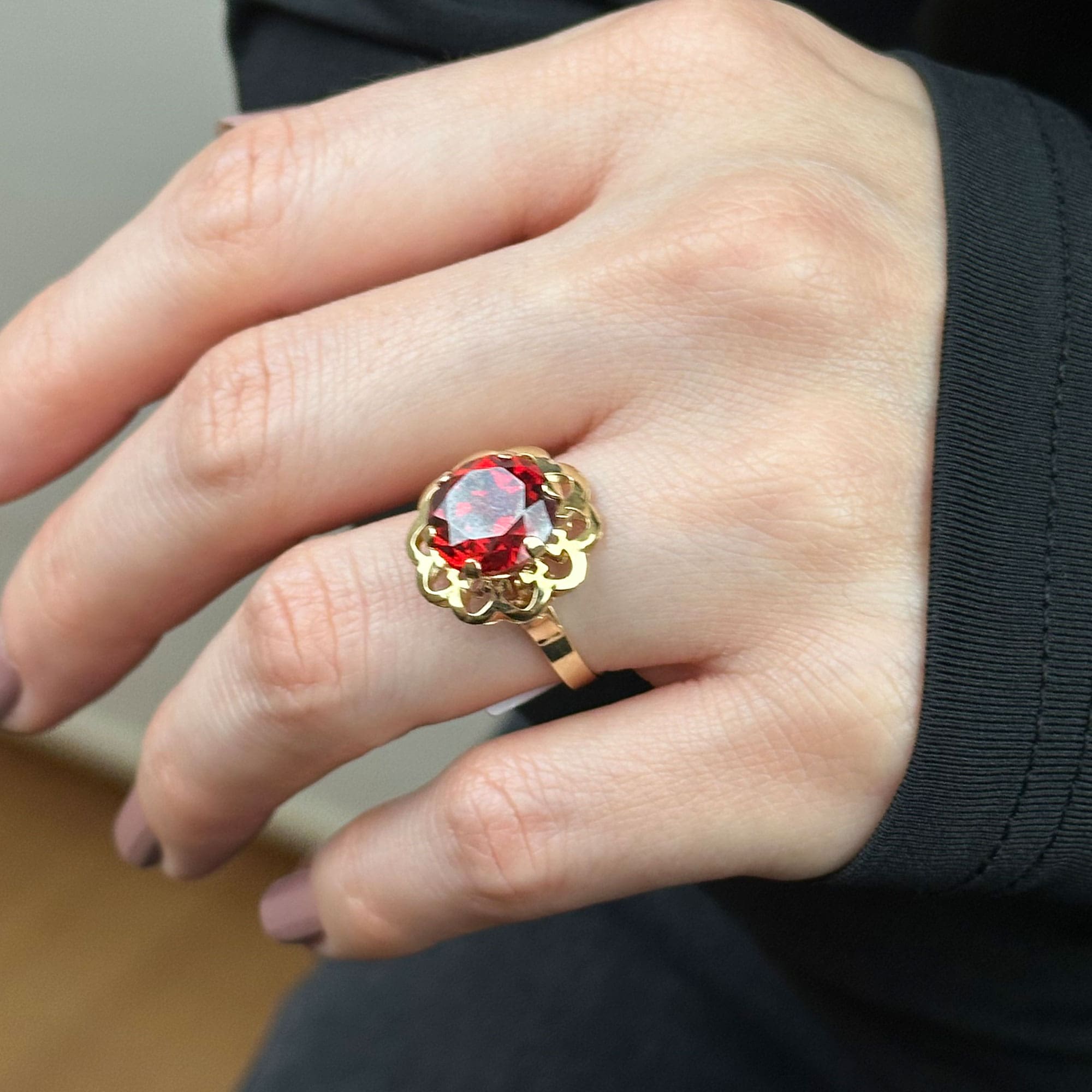 Göz alıcı kırmızı taşı ve çiçek formundaki zarif detaylarıyla bu 14 ayar altın yüzük, hem romantik hem de modern bir tarz sunar. İnce işçilikle tasarlanan model, günlük kombinleri tamamladığı gibi özel günlerde de şıklığınızı öne çıkarır. Hem kendinize hem de sevdiklerinize değer katacak şık bir hediye seçeneğidir.