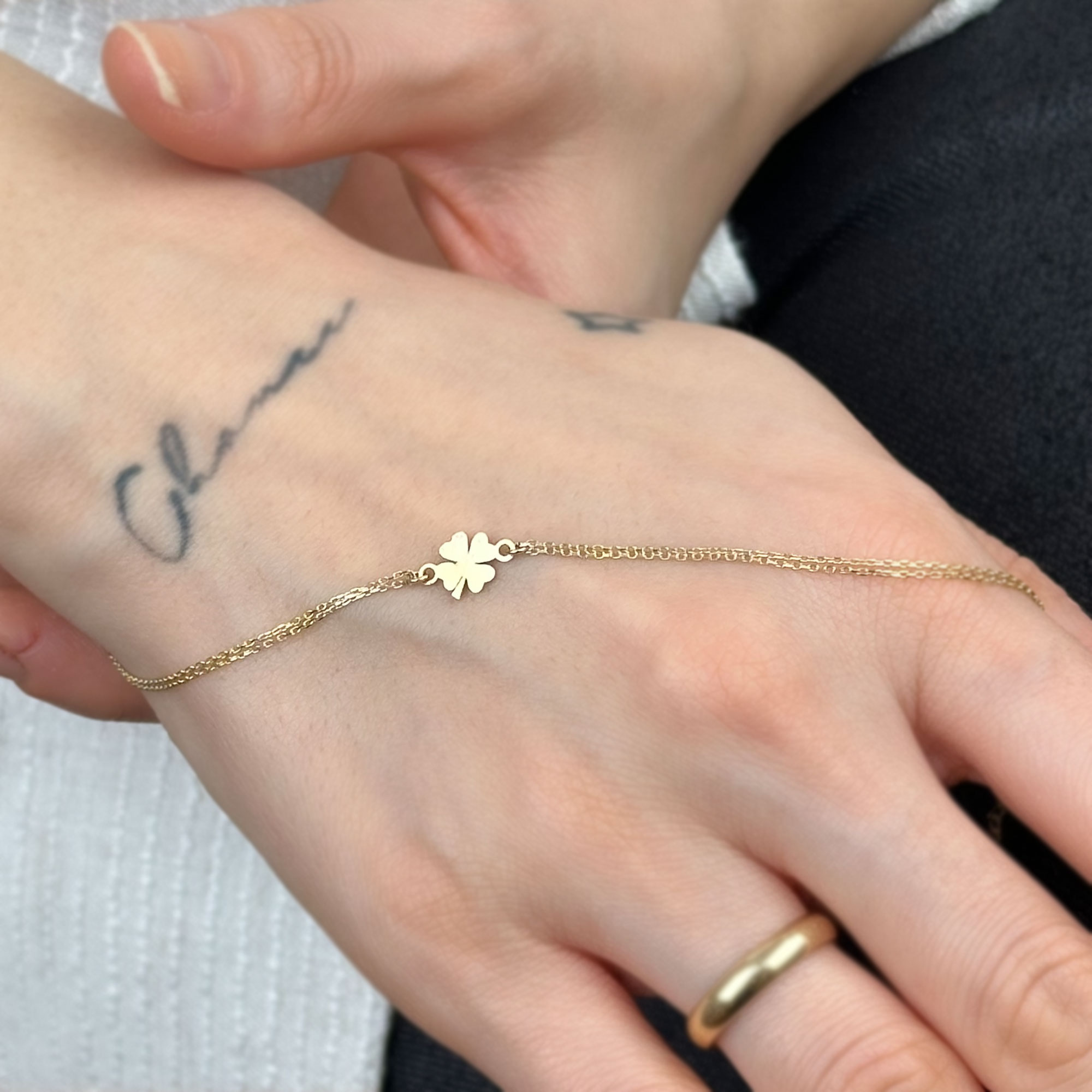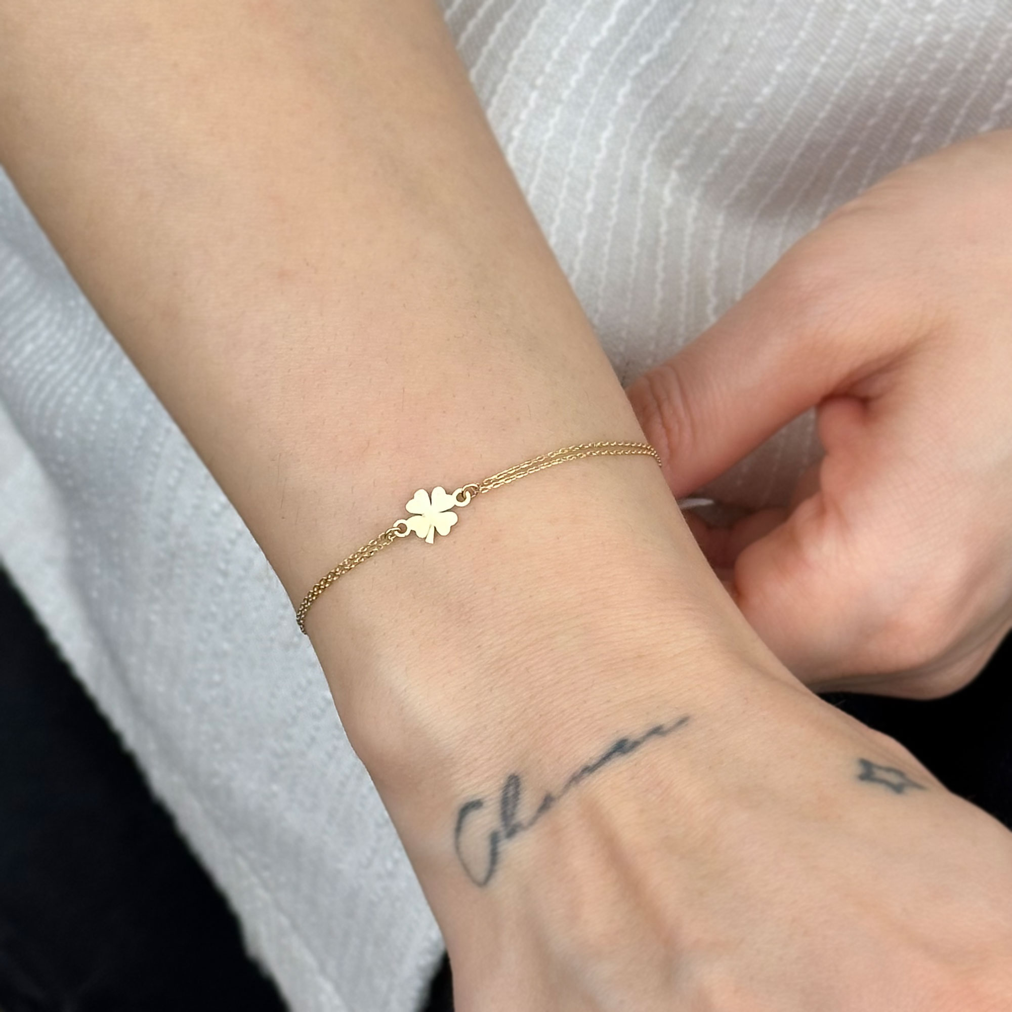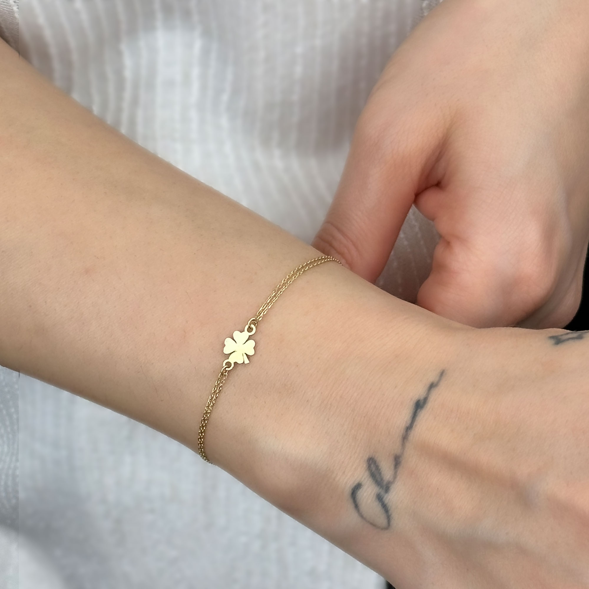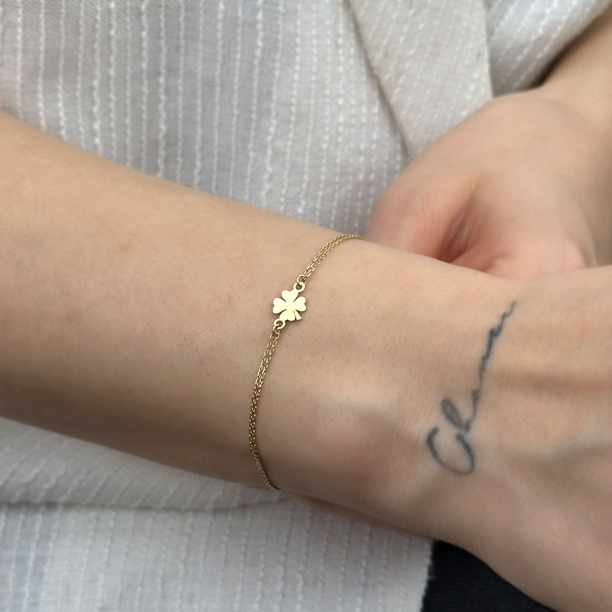 Yonca bileklik, anlamı güçlü yonca figürünü sade bir şıklıkla birleştiren zamansız modeller arasında yer alır. Bu minimal bileklik tasarımı, 14 ayar altın ile hazırlanmış taşsız yapısıyla günlük kullanımda kolayca kombinlenebilir.