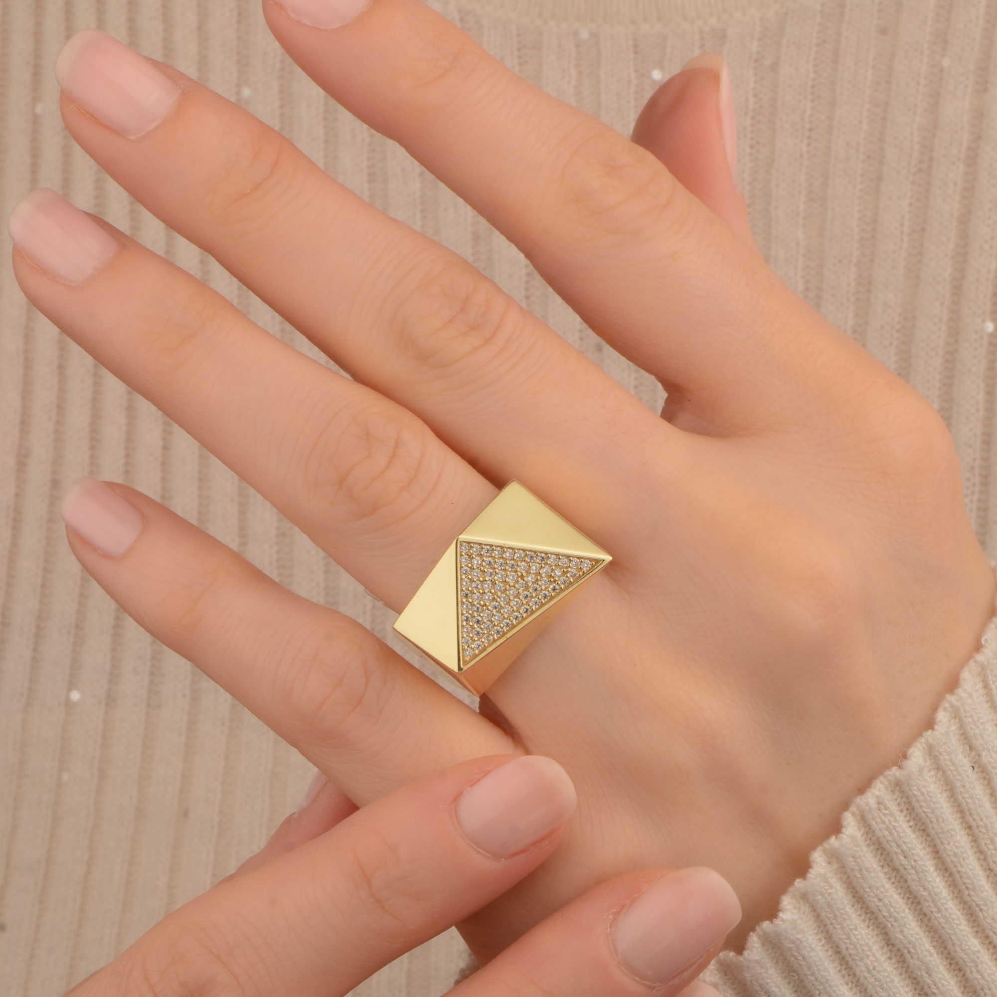 Geometrik taşlı yüzük, modern çizgisi ve farklı formuyla klasik yüzük tasarımlarından ayrılan şık modeller arasında yer alır. 14 ayar altın üzerine işlenen zirkon taş detayı, geometrik formu daha belirgin hale getirirken zarif bir ışıltı sunar.