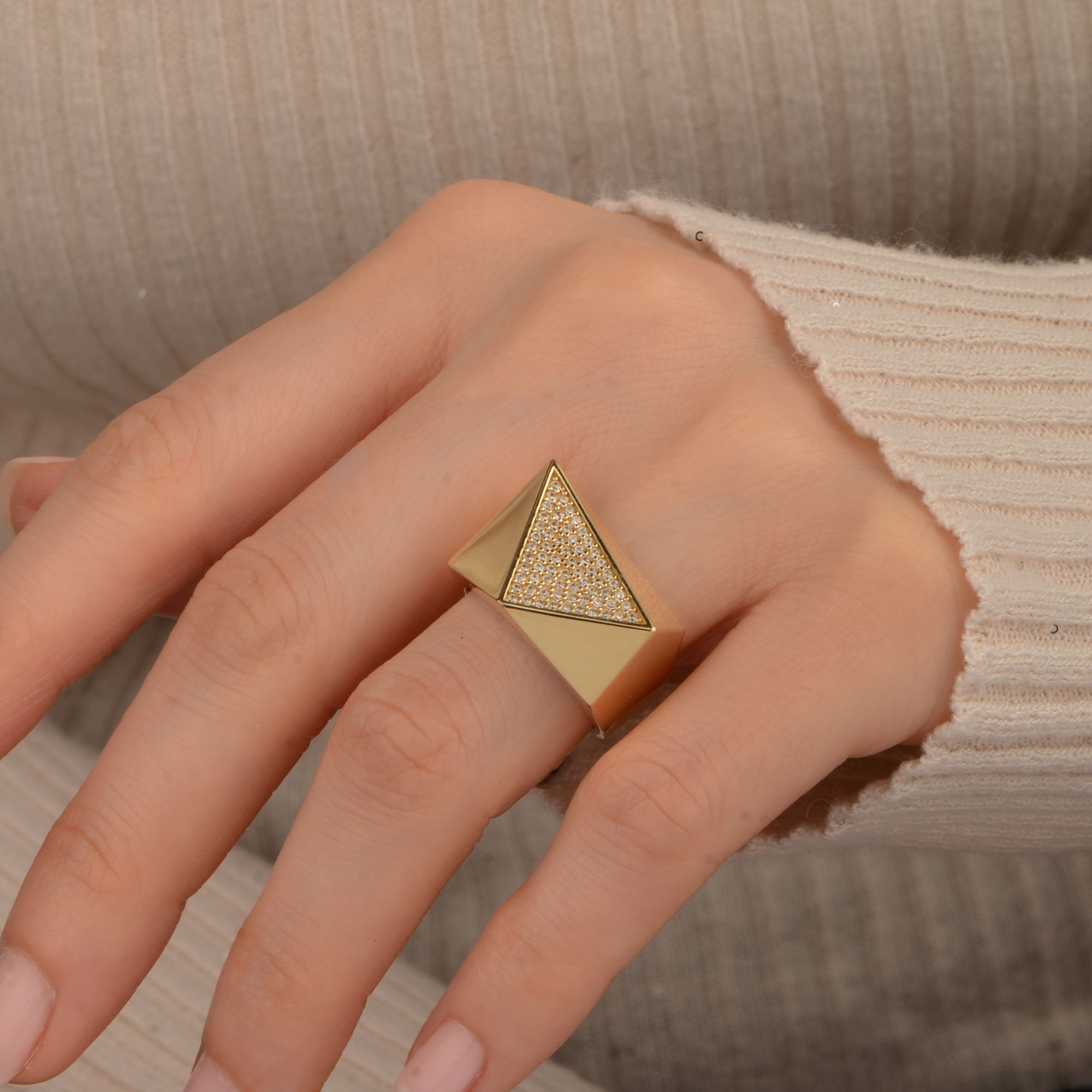 Yaklaşık 6.05 gr ağırlığıyla elde daha dolgun ve dikkat çekici bir duruş sağlayabilir. Sarı altının sıcak tonu, yüzüğün formunu net gösterir; tek başına kullanıldığında güçlü bir vurgu oluşturur, sade kombinlerde ise stilin odak parçası olabilir.