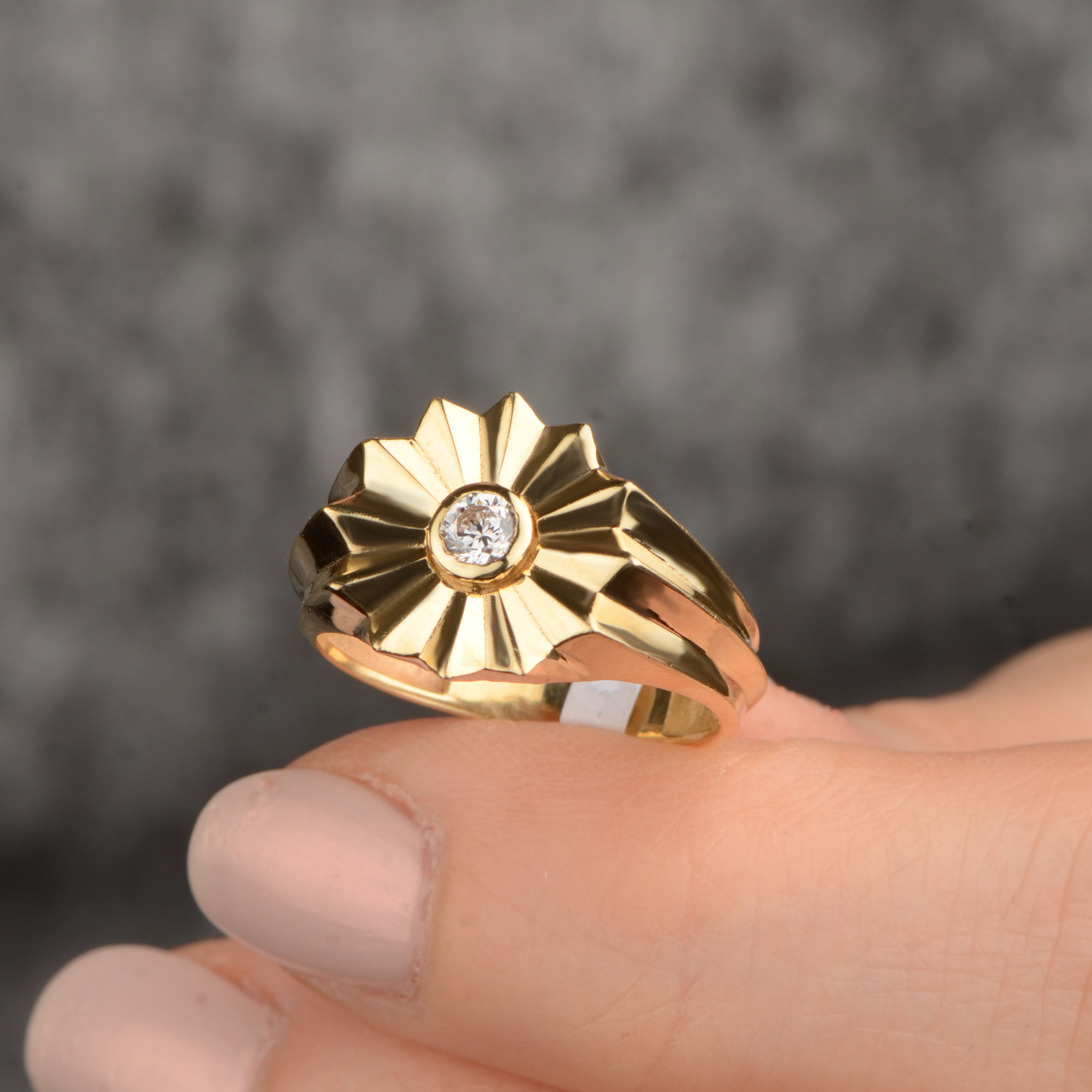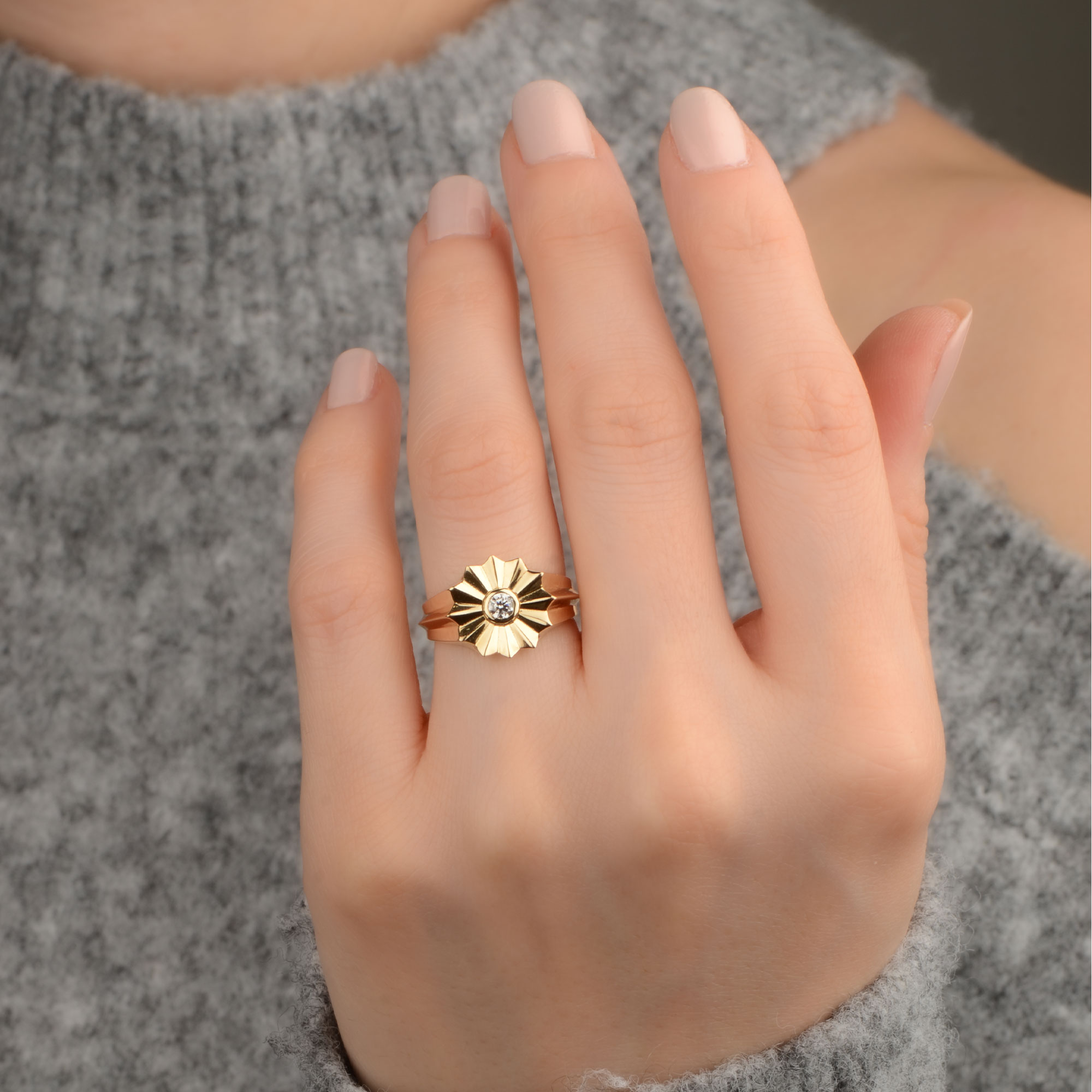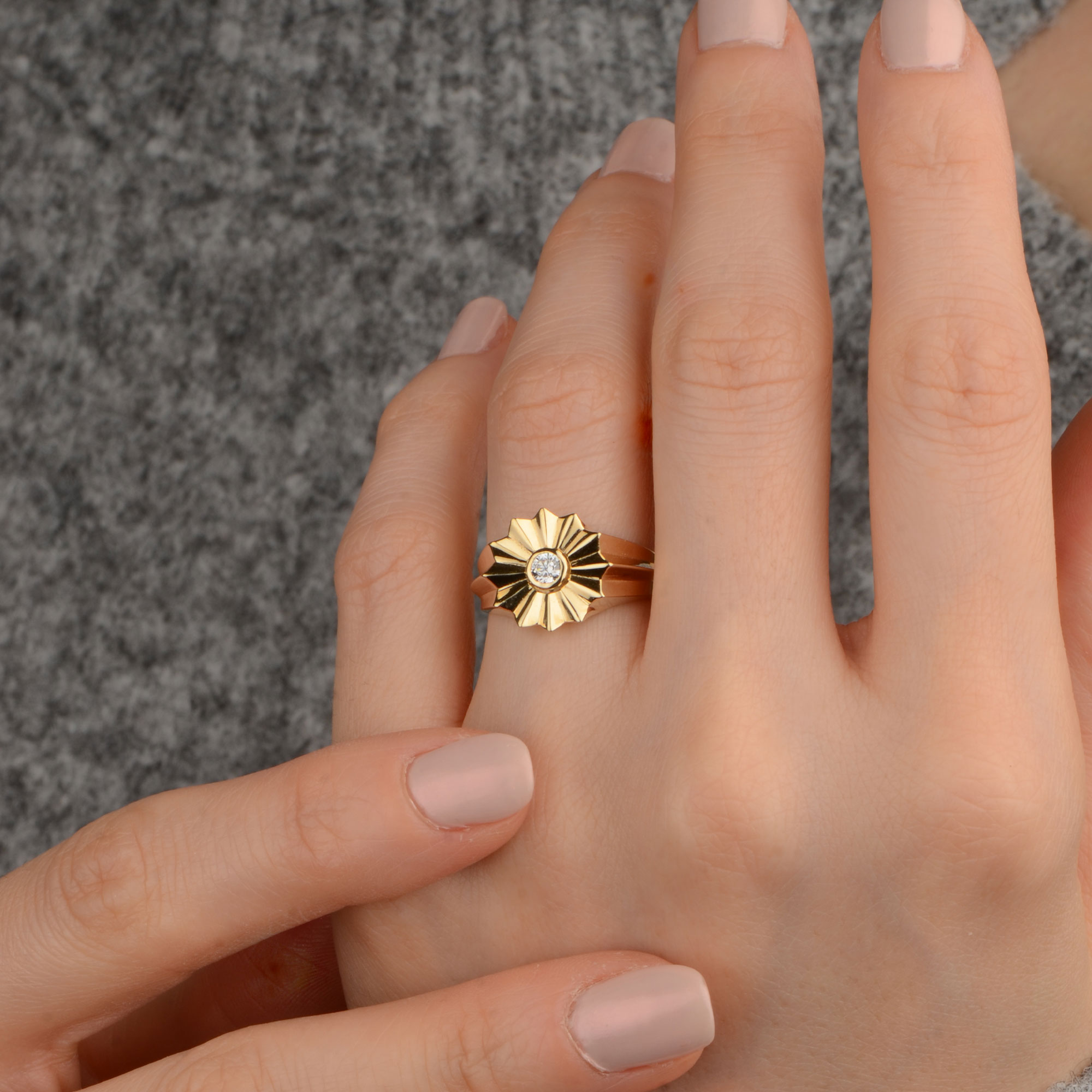 Çiçek yüzük, zarif formu ve dikkat çekici duruşuyla günlük kombinleri yükselten, hediye seçiminde de anlamı güçlü modeller arasında yer alır. Bu ay çiçeği yüzük tasarımı, 14 ayar altın ve zirkon taş detayıyla ışıltılı ama şık bir görünüm sunar.