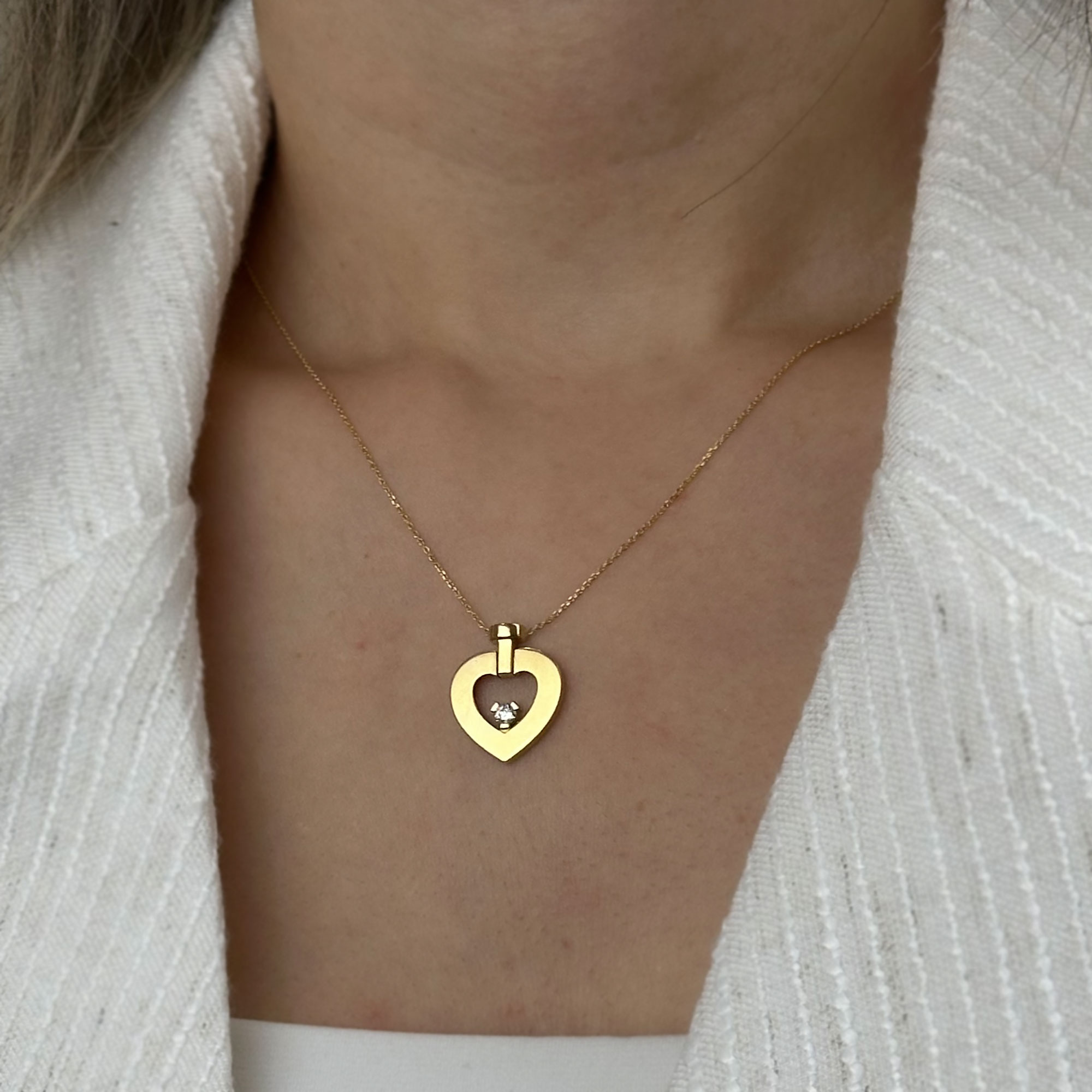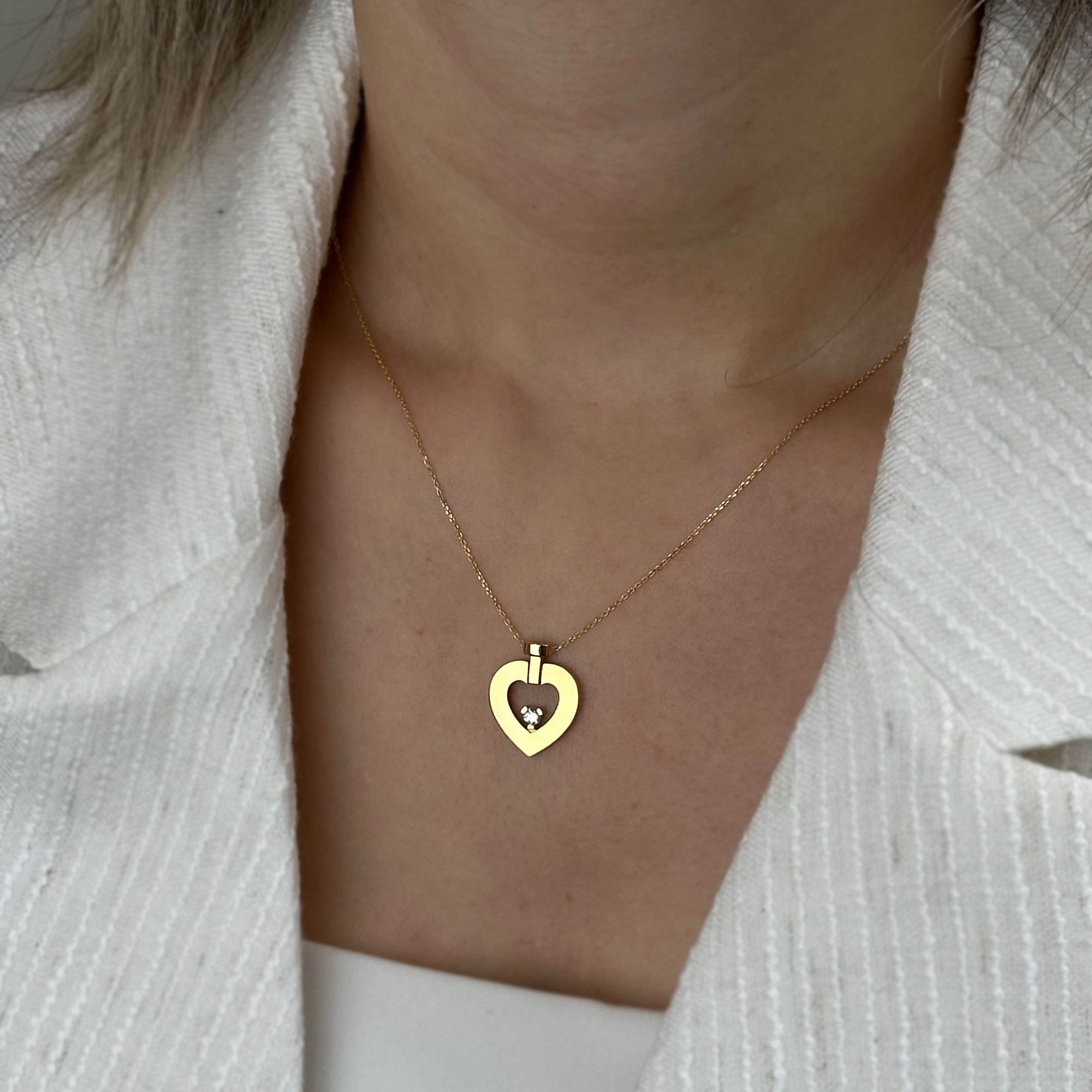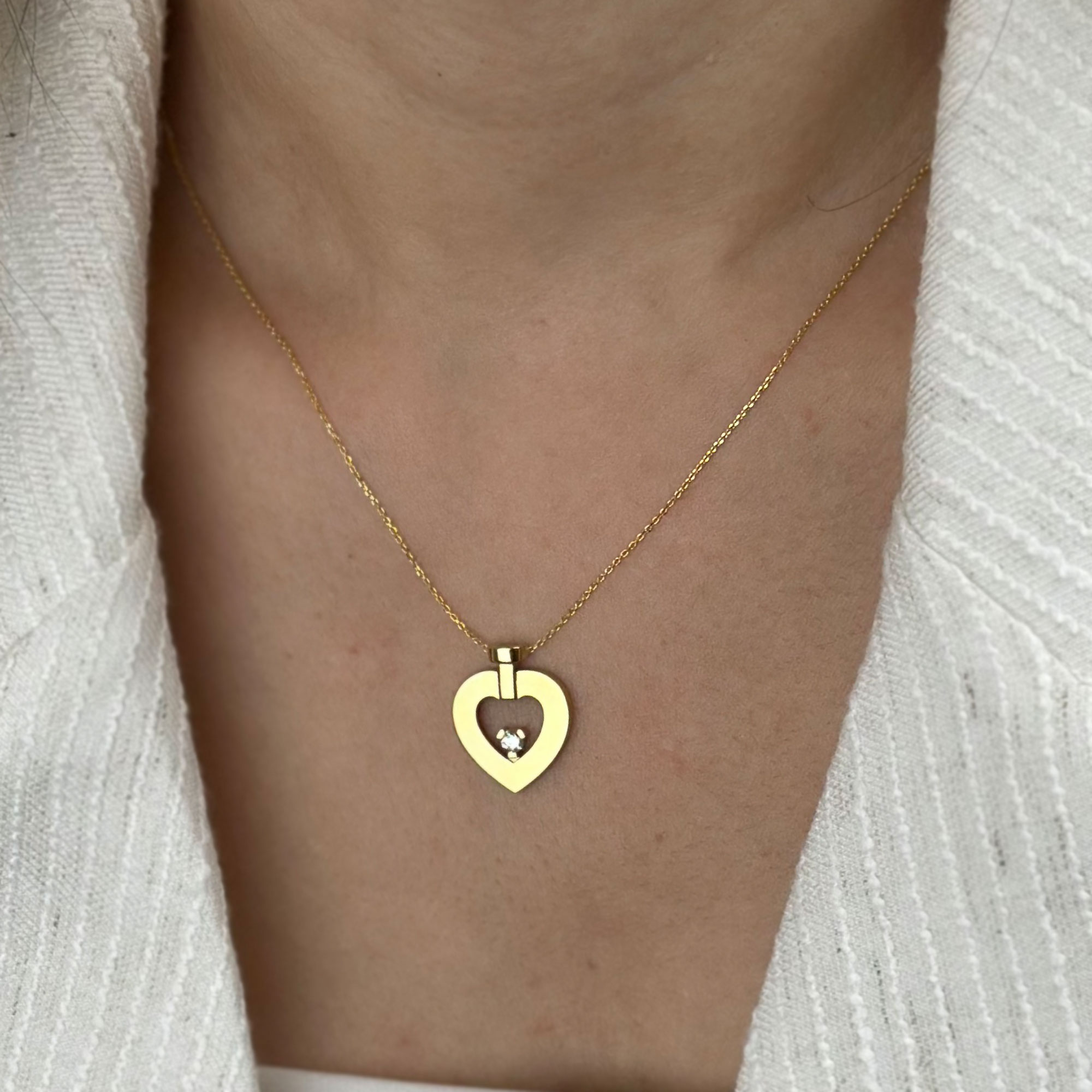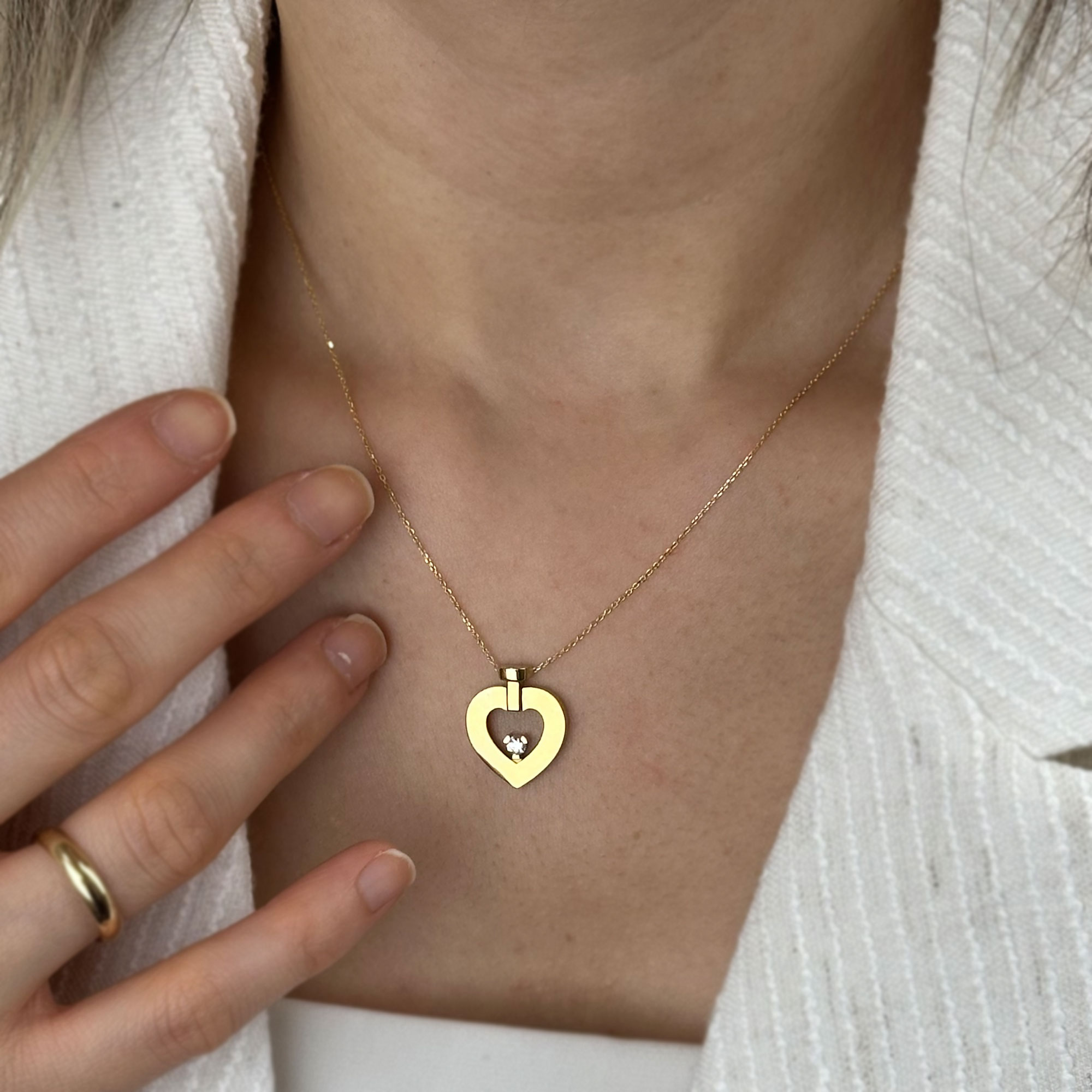 Kalp kolye, sevgi ve bağlılığı simgeleyen anlamlı tasarımıyla hediye seçenekleri arasında öne çıkar. 14 ayar altın ile üretilen bu model, zirkon tek taş detayıyla zarif ve ışıltılı bir görünüm sunar.