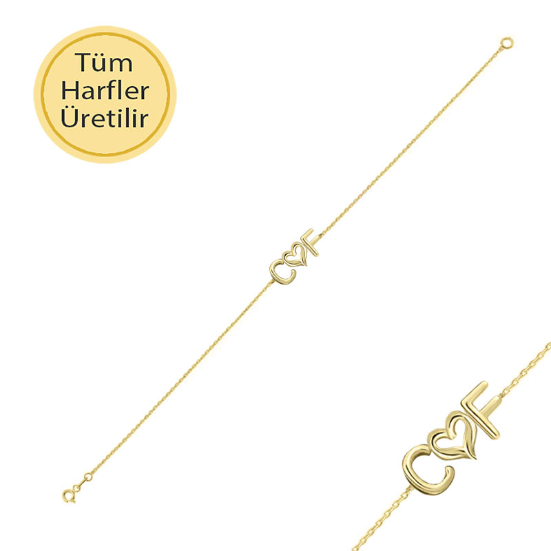 14k Altın Kalpli Çift Harf İsim Bileklik