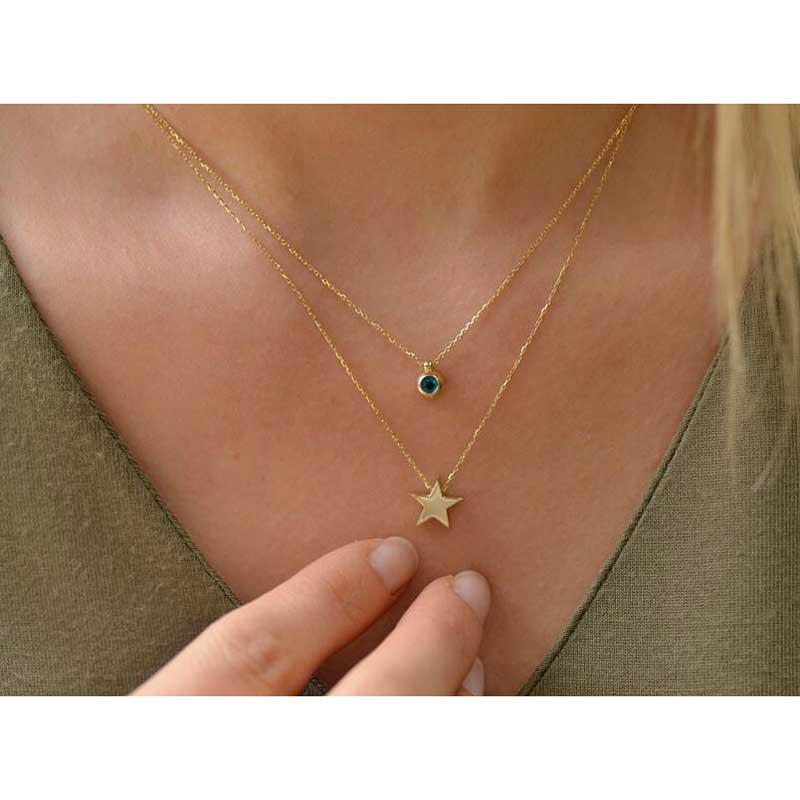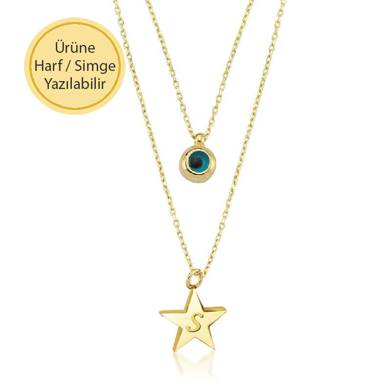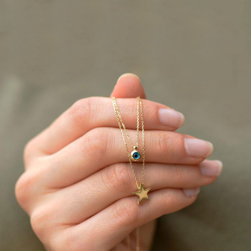 14k Altın Yıldızlı Nazar Boncuk İkili Kolye
