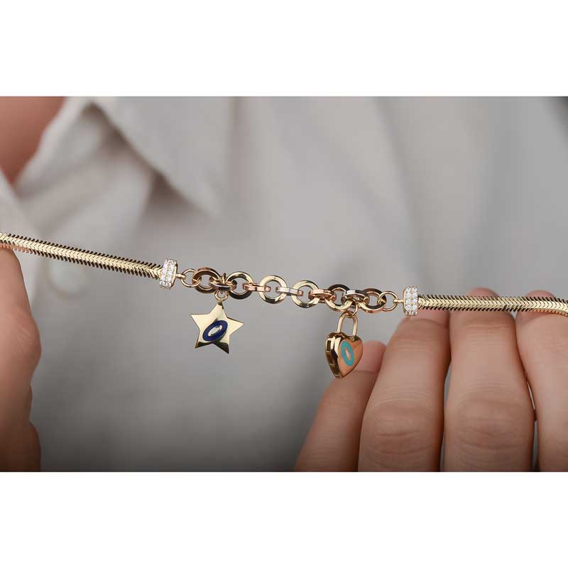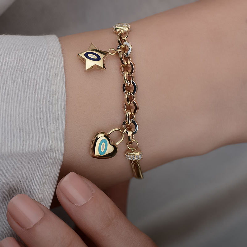14k Altın Yıldızlı ve Kalpli Balık Sırtı Bileklik