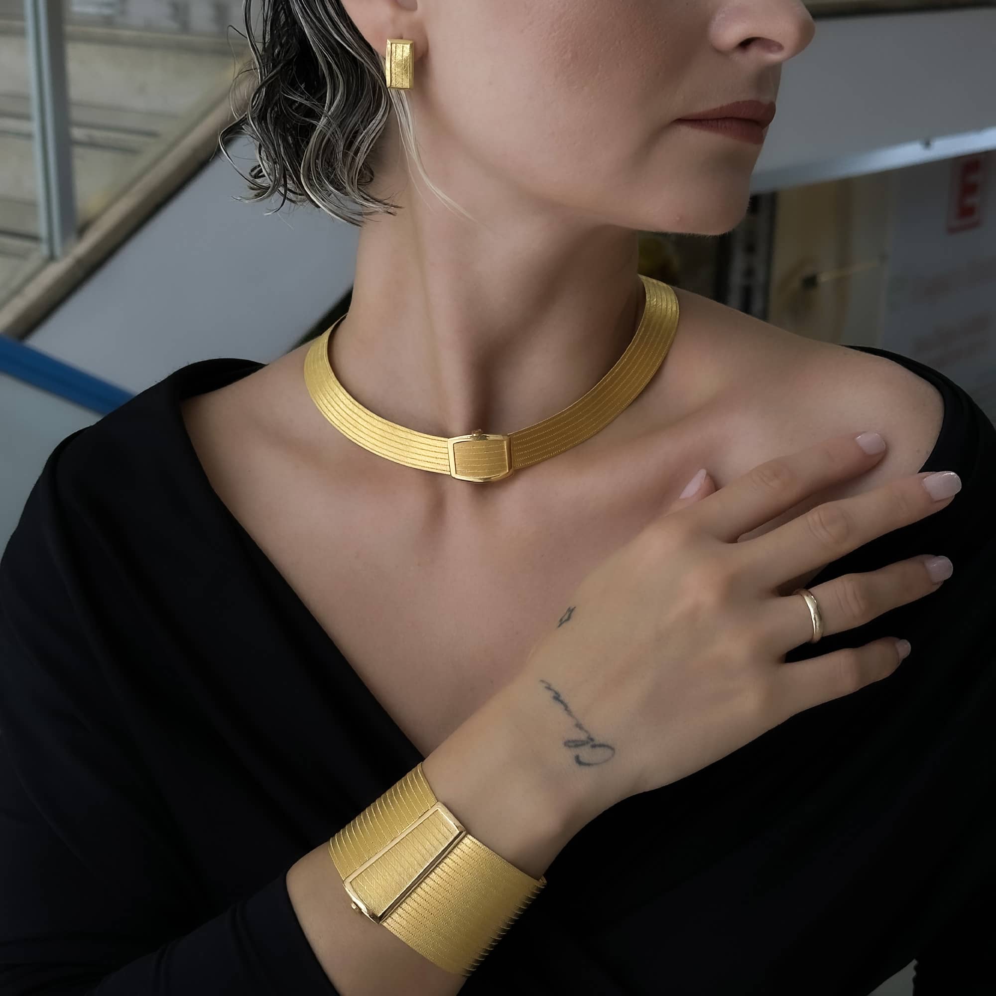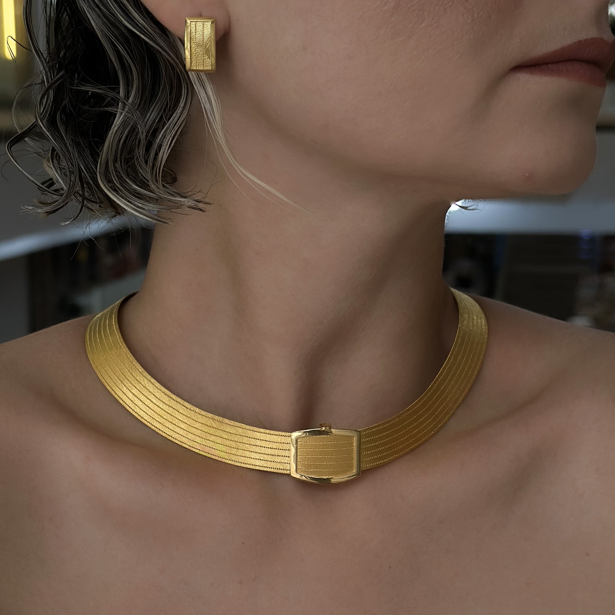 Tamamı 22 ayar saf altın kullanılarak üretilen bu özel tasarım, yüksek gramajı ve el işçiliği detaylarıyla hem estetik hem de yatırım değeri taşıyan bir mücevherdir. Hasır örgü yapısı sayesinde boyun formuna doğal şekilde oturur ve konforlu bir kullanım sağlar.