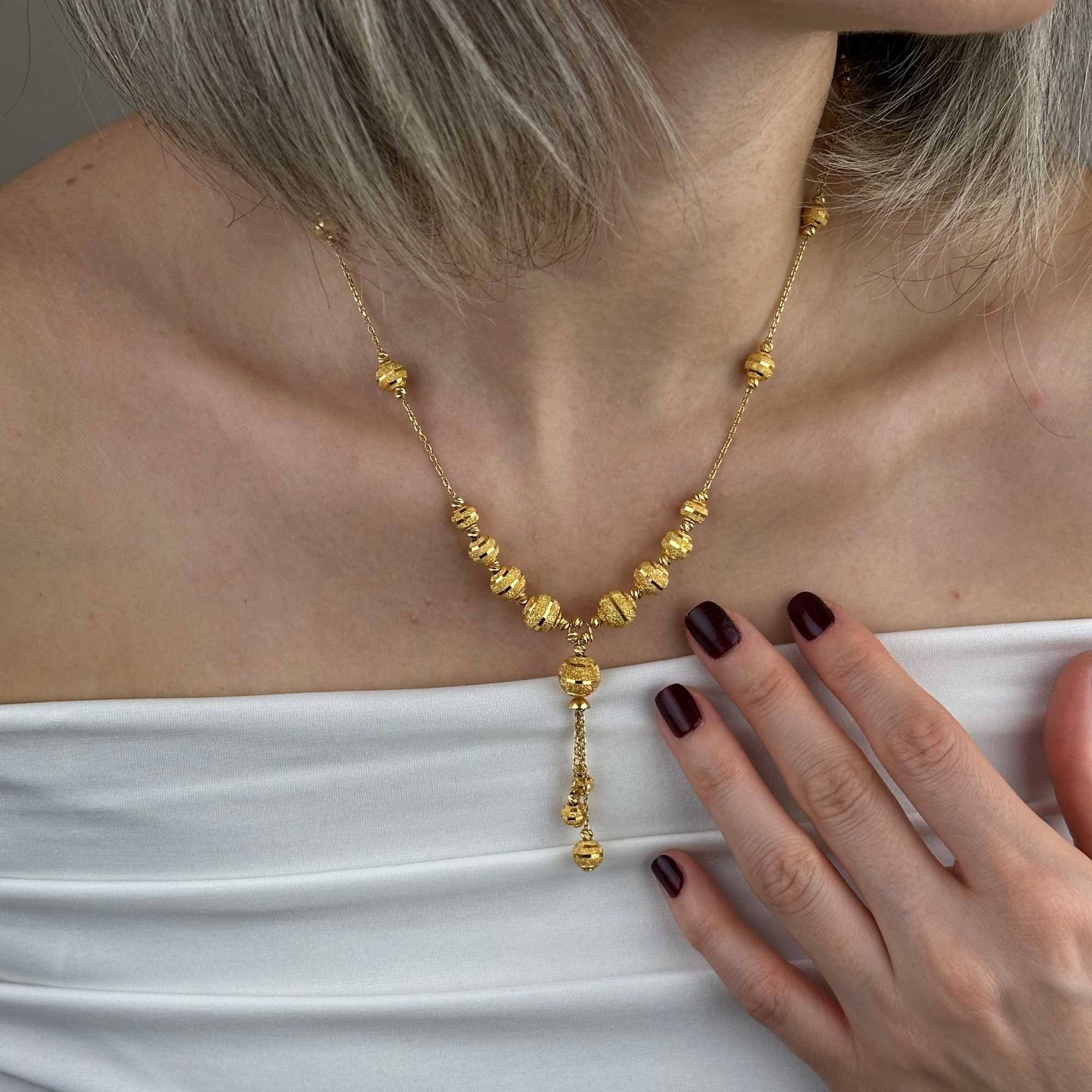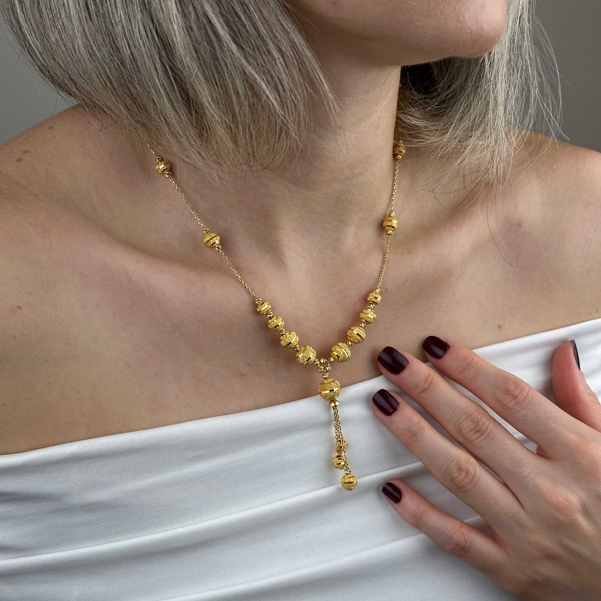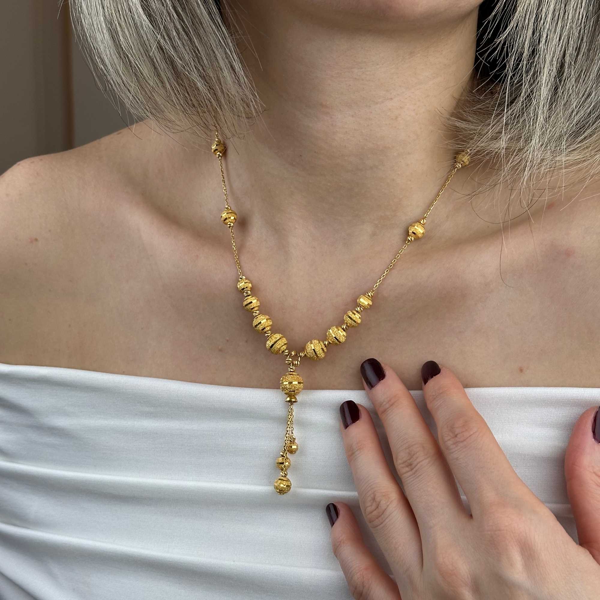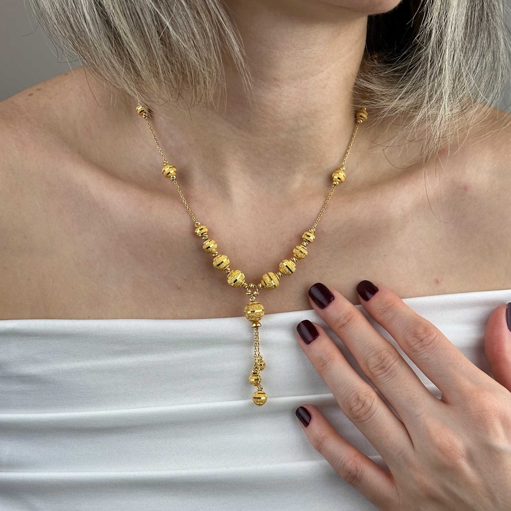 Yaklaşık 19,63 gram ağırlığı, kolyeye tok ve dengeli bir duruş kazandırırken aynı zamanda yatırım değeri taşıyan bir kullanım sunar. Sarı altının sıcak tonu, dorika topların ritmik dizilimiyle birleşerek tasarıma zamansız bir karakter kazandırır.