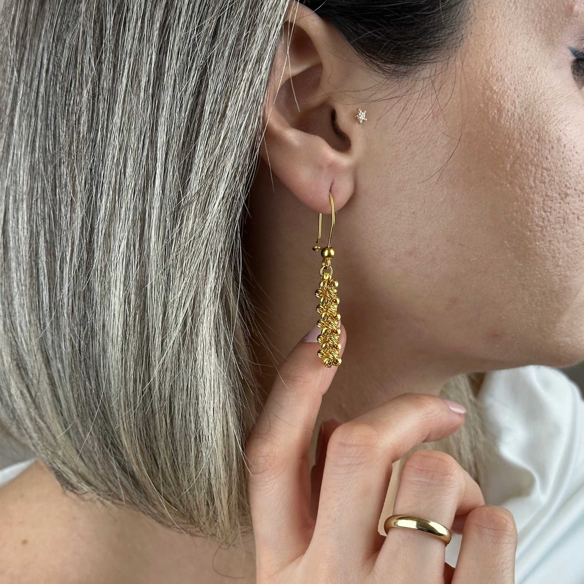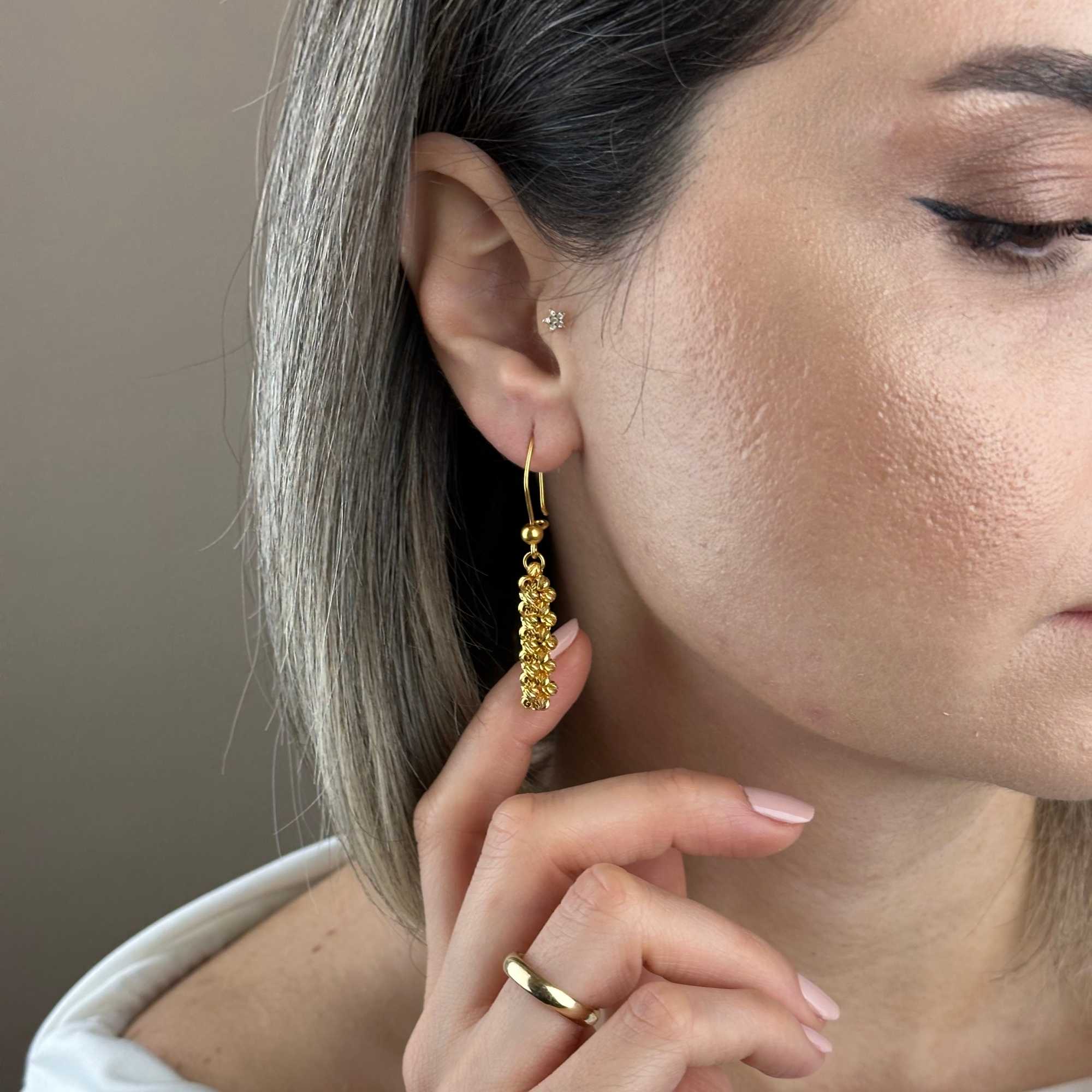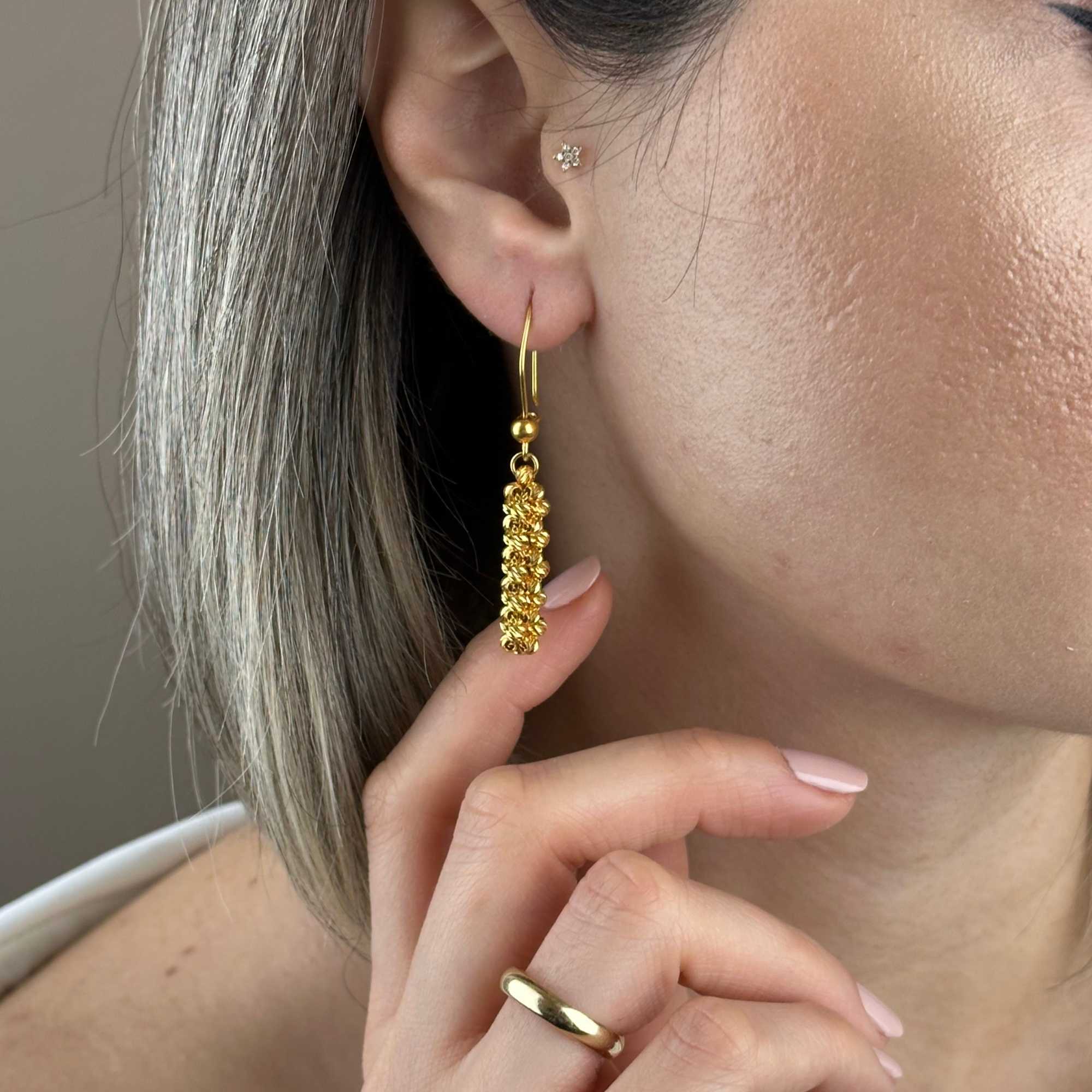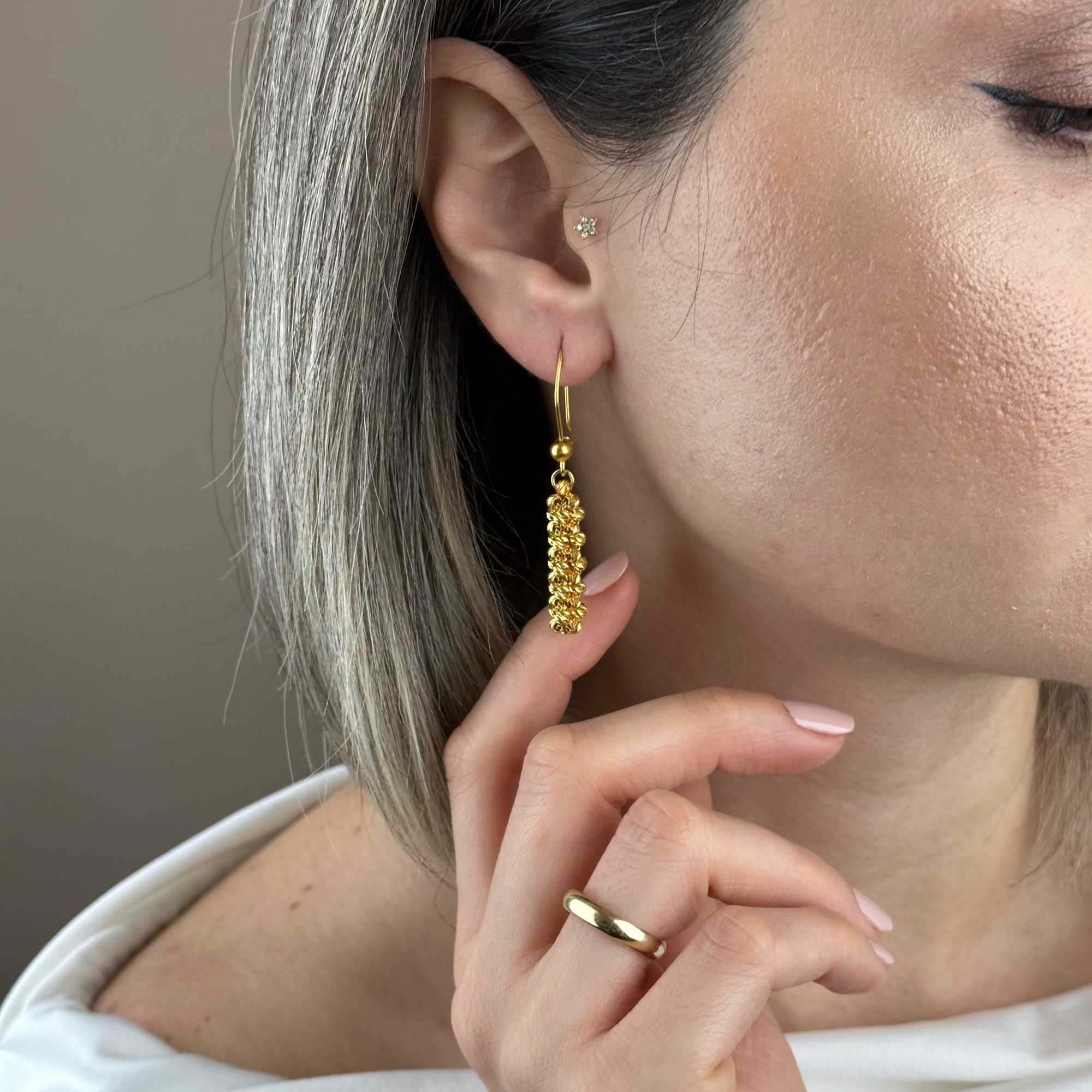 22 ayar altın dorika küpe, klasik altın işçiliğini modern sallantılı form ile birleştiren zamansız bir tasarımdır. Dorika detaylarının ışığı yansıtan yapısı, küpeye hem gösterişli hem de zarif bir duruş kazandırır.