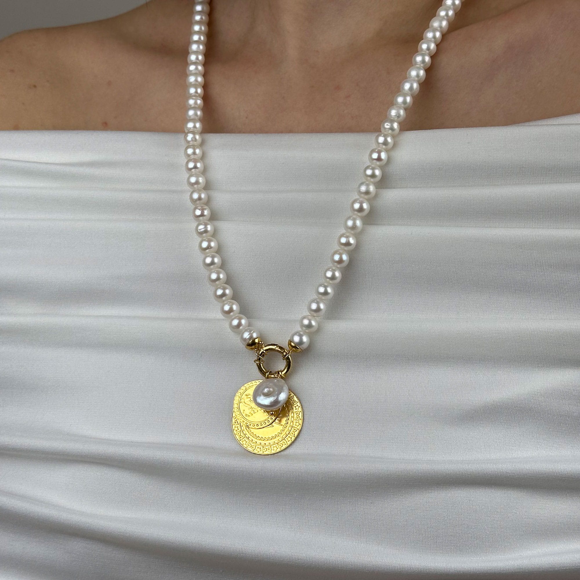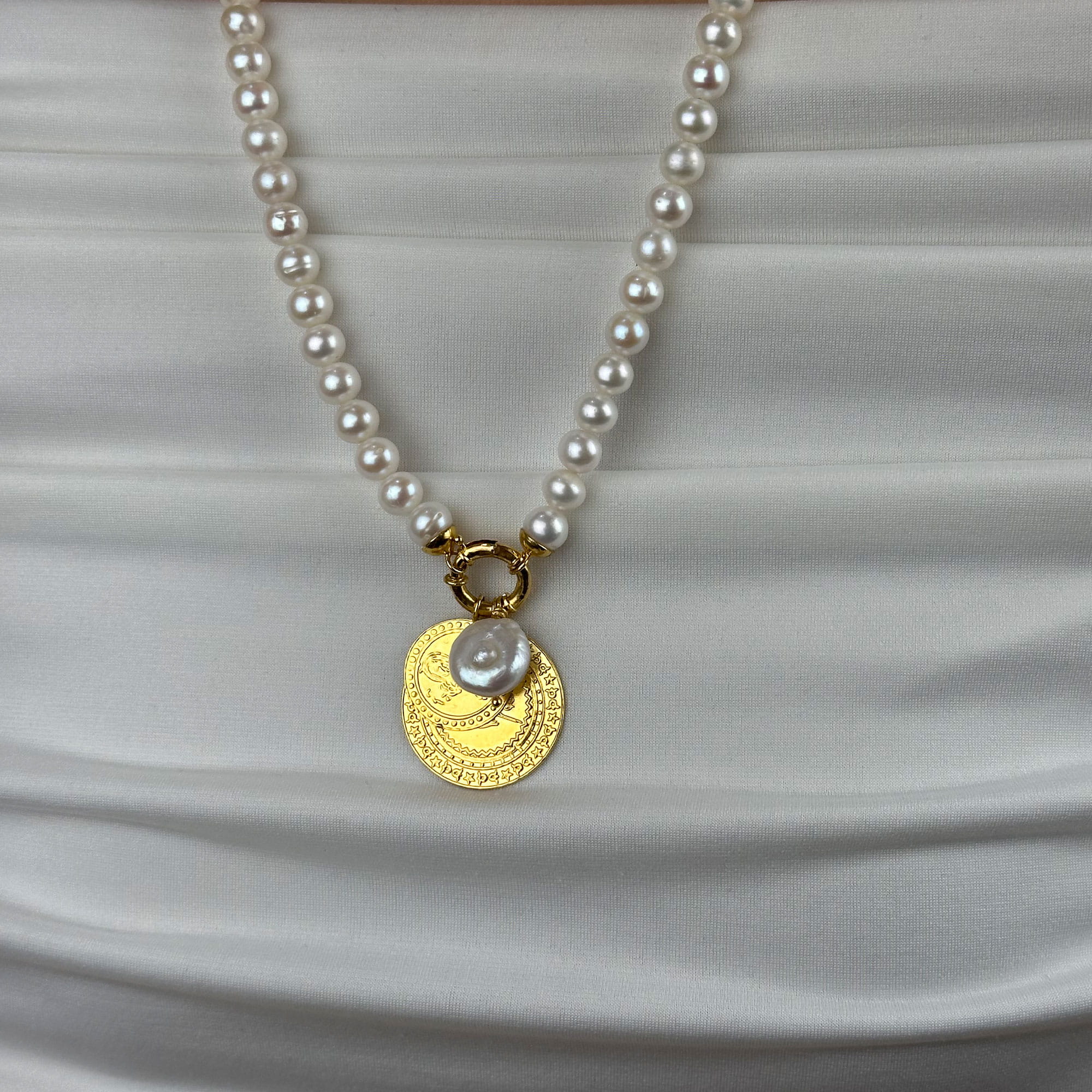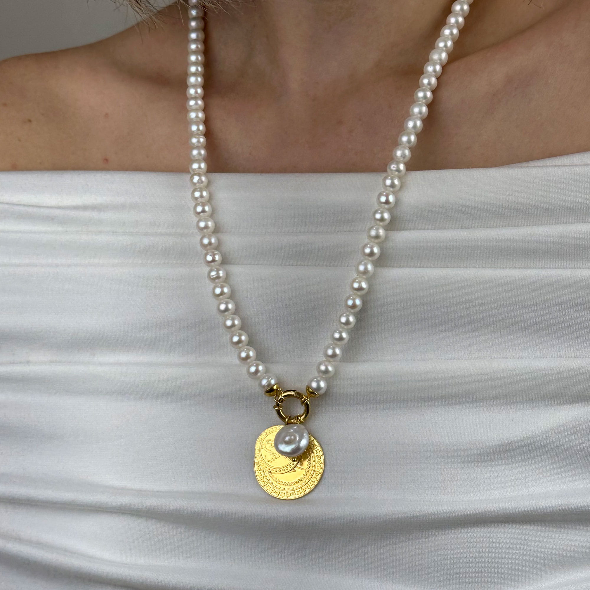 Zamansız şıklığın simgesi olan bu inci kolye, 22 ayar altının sıcak tonu ile doğal incinin zarafetini bir araya getirir. Minimal ve dengeli tasarımı sayesinde hem günlük kullanımda hem de özel davetlerde rahatlıkla tercih edilebilir.
