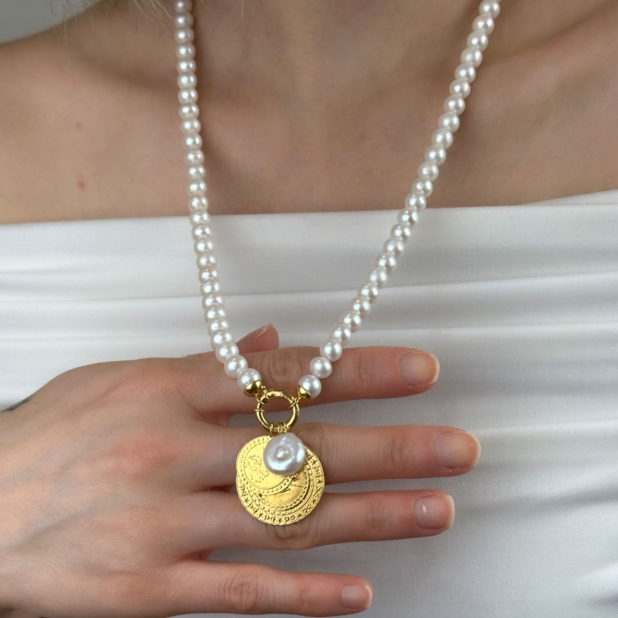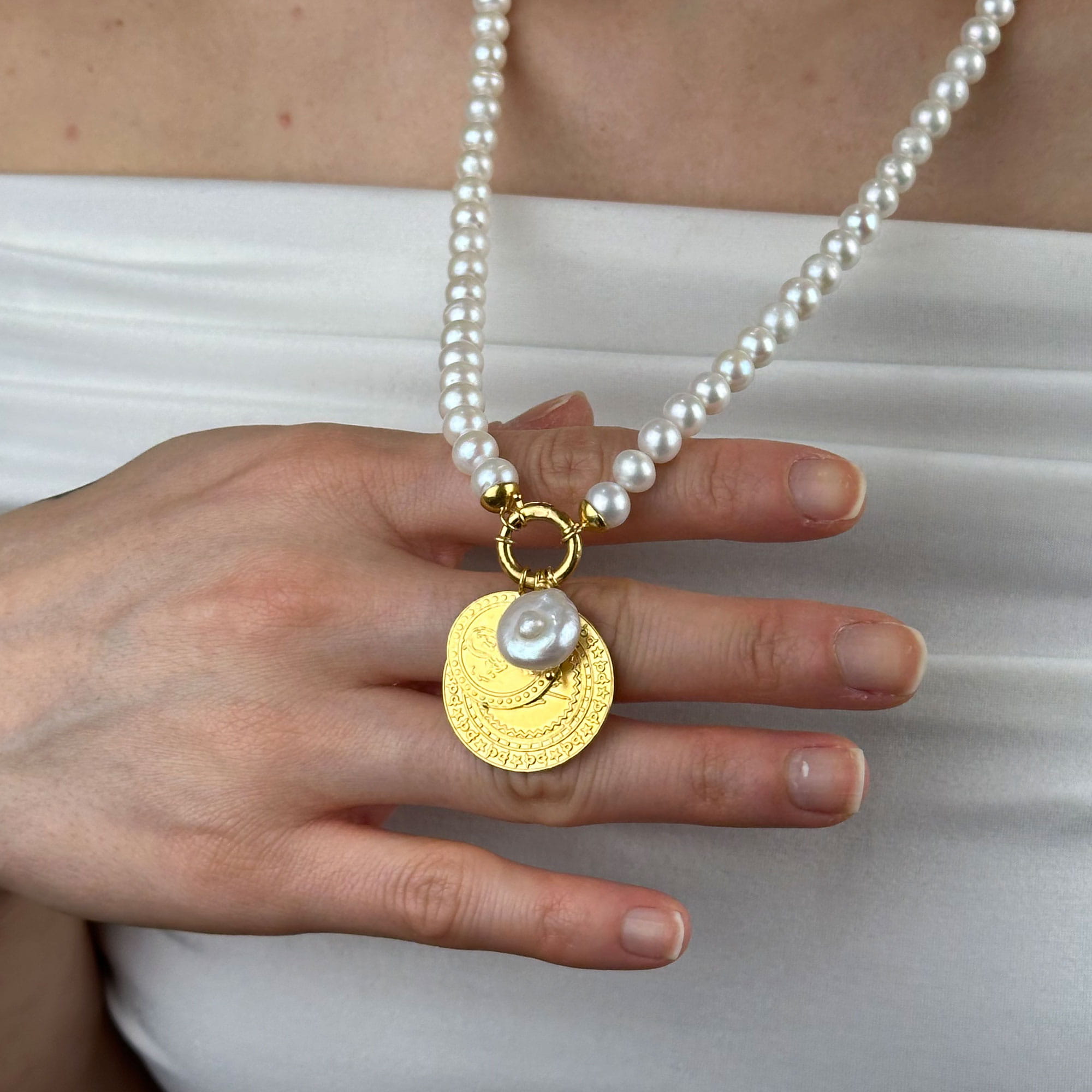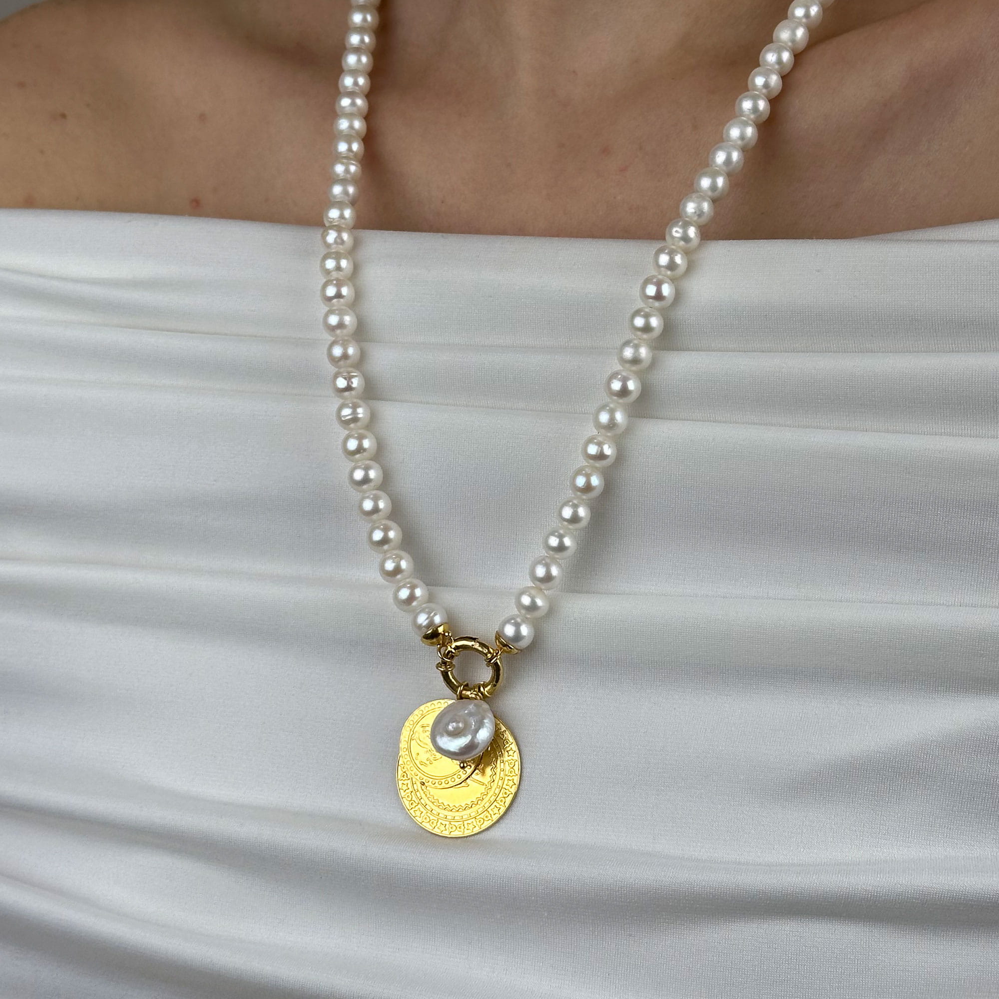 Zamansız şıklığın simgesi olan bu inci kolye, 22 ayar altının sıcak tonu ile doğal incinin zarafetini bir araya getirir. Minimal ve dengeli tasarımı sayesinde hem günlük kullanımda hem de özel davetlerde rahatlıkla tercih edilebilir.