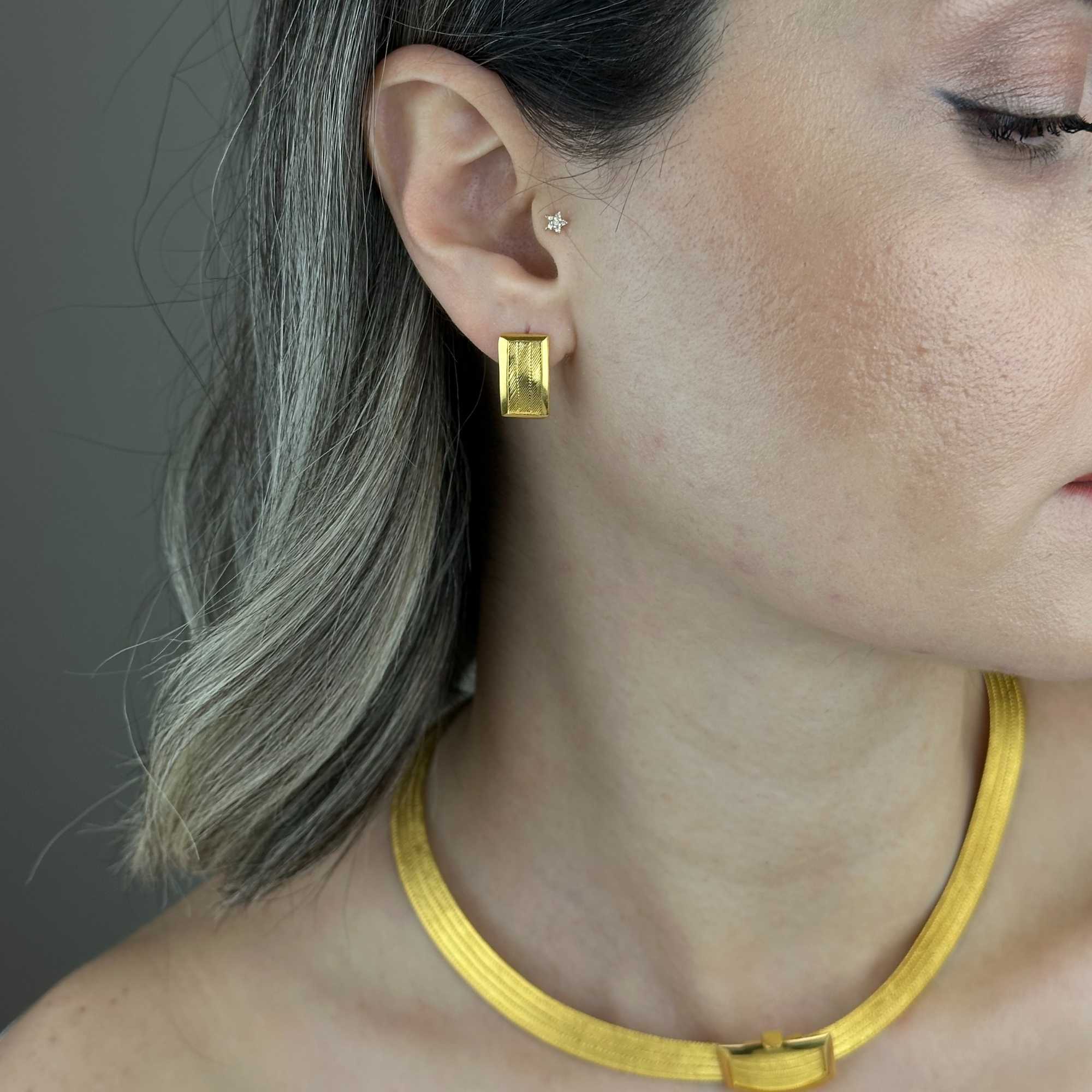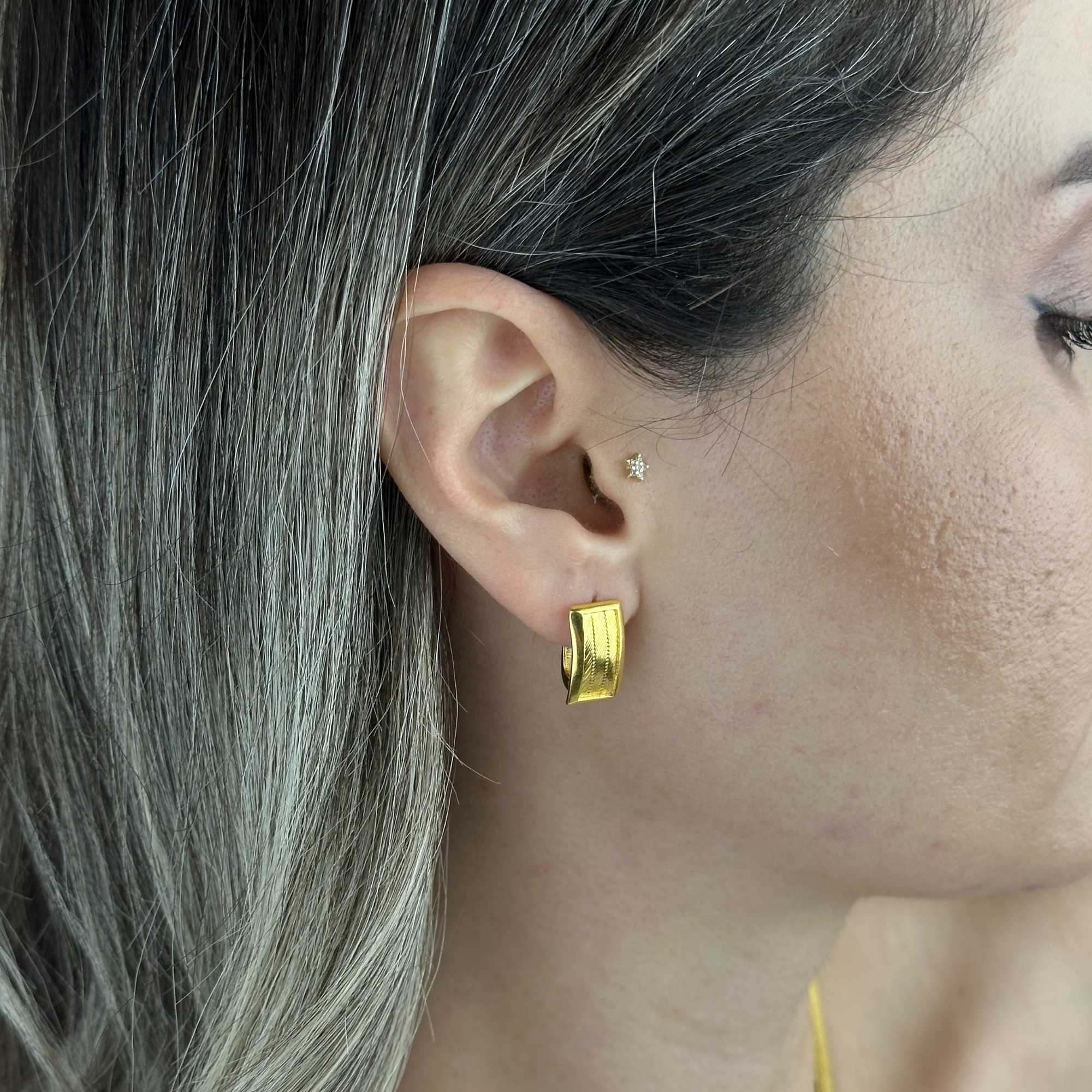 Hasır dokulu yapısı, altının sıcak sarı tonuyla birleşerek küpeye karakteristik ve prestijli bir görünüm kazandırır.