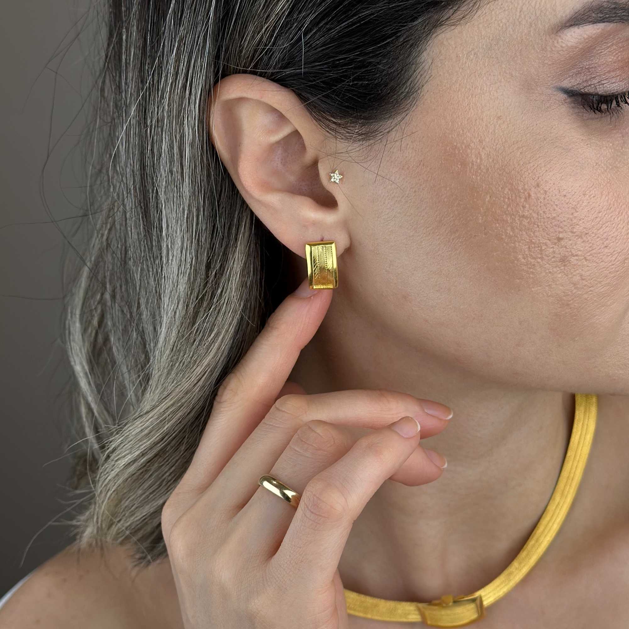 J küpe formu, kulağa rahat oturan yapısıyla gün boyu konforlu bir kullanım sunarken, hareketli duruşu sayesinde yüz hatlarını zarif şekilde vurgular.