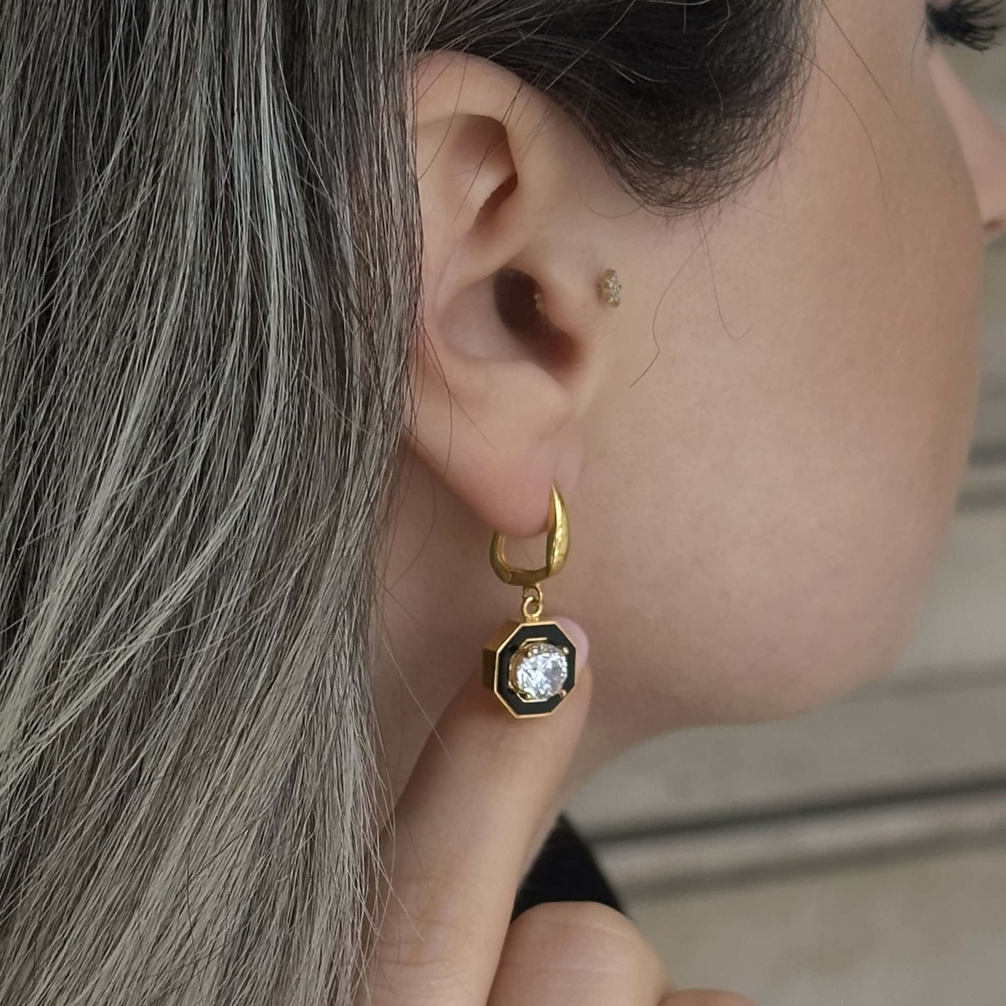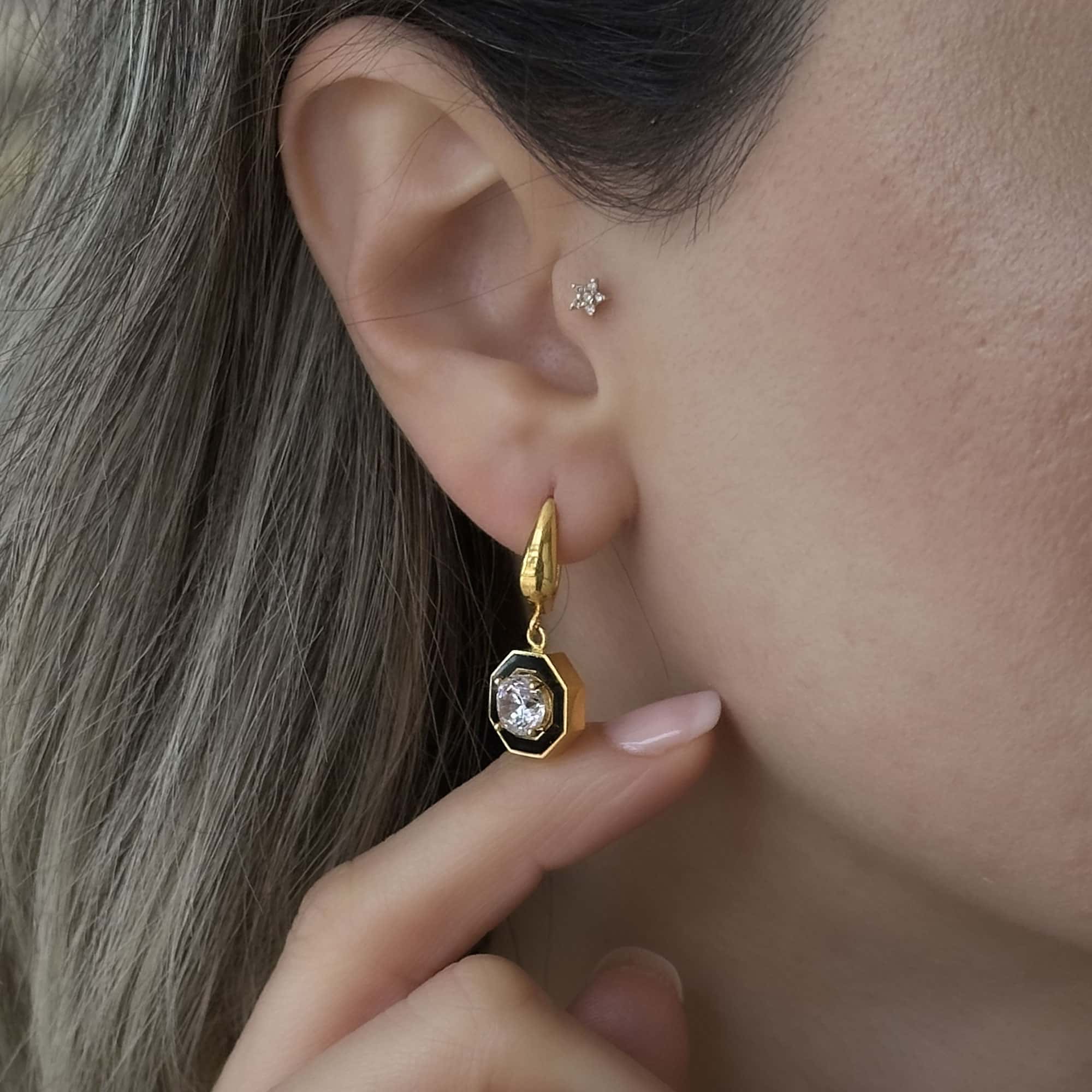 Sallantılı siyah mineli tektaş küpe, 22 ayar altının sıcak parıltısını modern detaylarla birleştirir. Minimalist ama dikkat çekici tasarımı sayesinde hem günlük stilinize hem özel gün kombinlerinize zarif bir dokunuş ekler. Siyah minenin sofistike görünümü, tektaşın parıltısıyla kusursuz bir uyum yakalar. Hafif yapısı sayesinde gün boyu rahatlık sunan bu özel tasarım, stil sahibi kadınlar için ideal bir seçimdir.