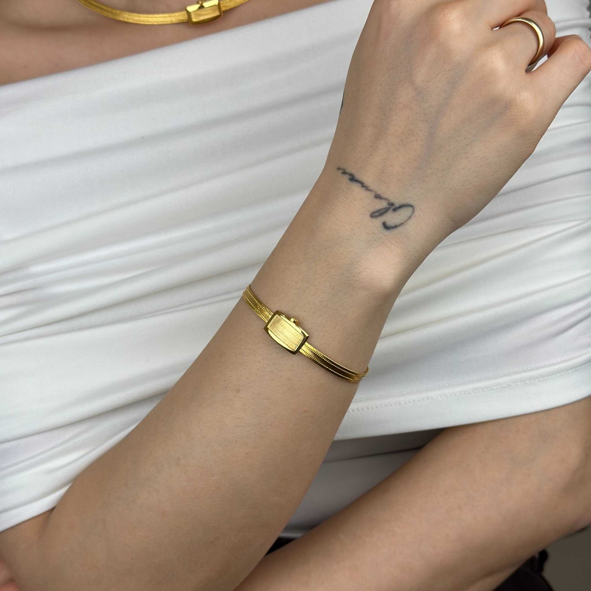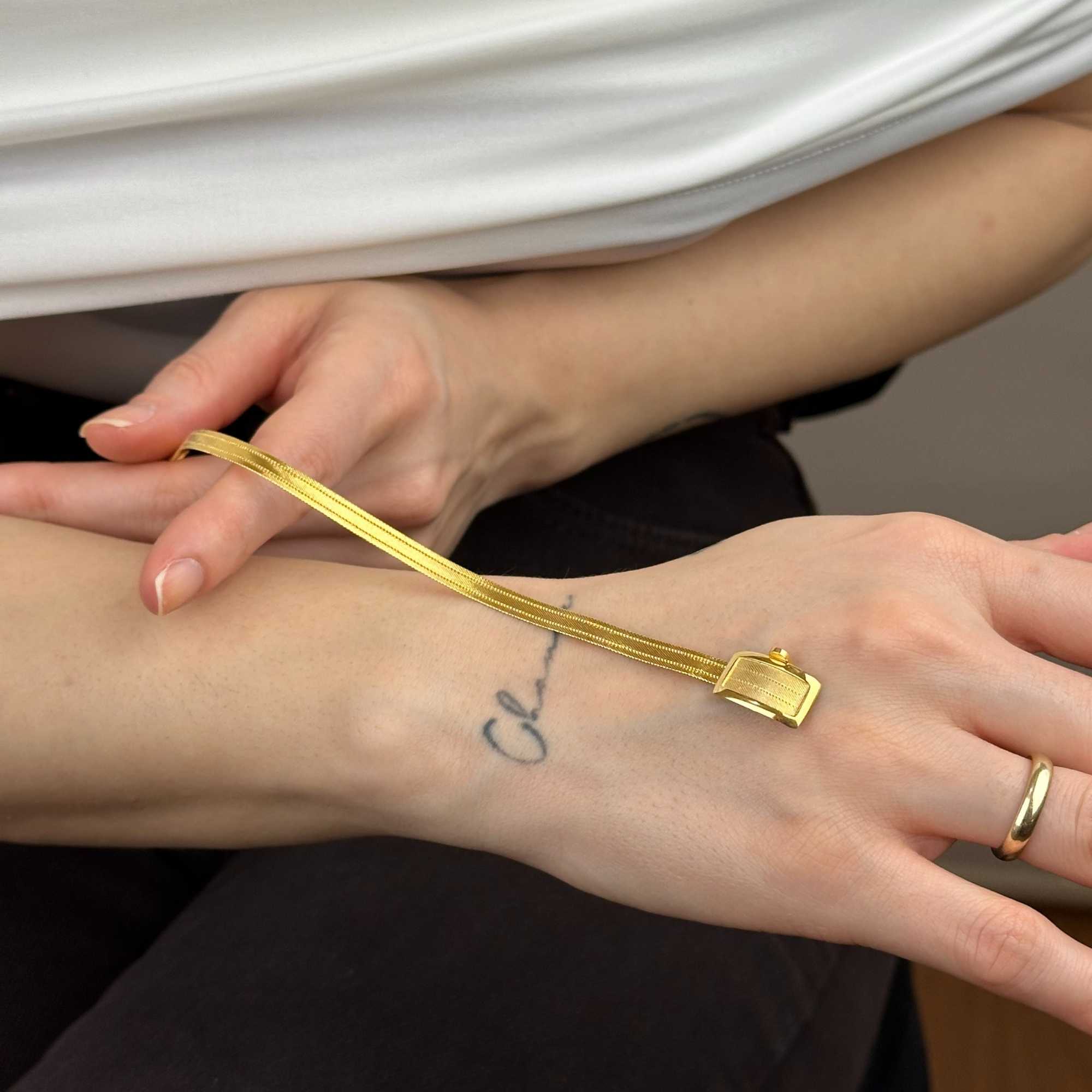 Yaklaşık 10,68 gram ağırlığa sahip olan bileklik, bilekte dengeli bir duruş sağlar ve gün boyu konforlu kullanım sunar. Sarı altının sıcak tonu, hasır örgü dokusuyla birleşerek bilekliğe prestijli ve zamansız bir görünüm kazandırır.