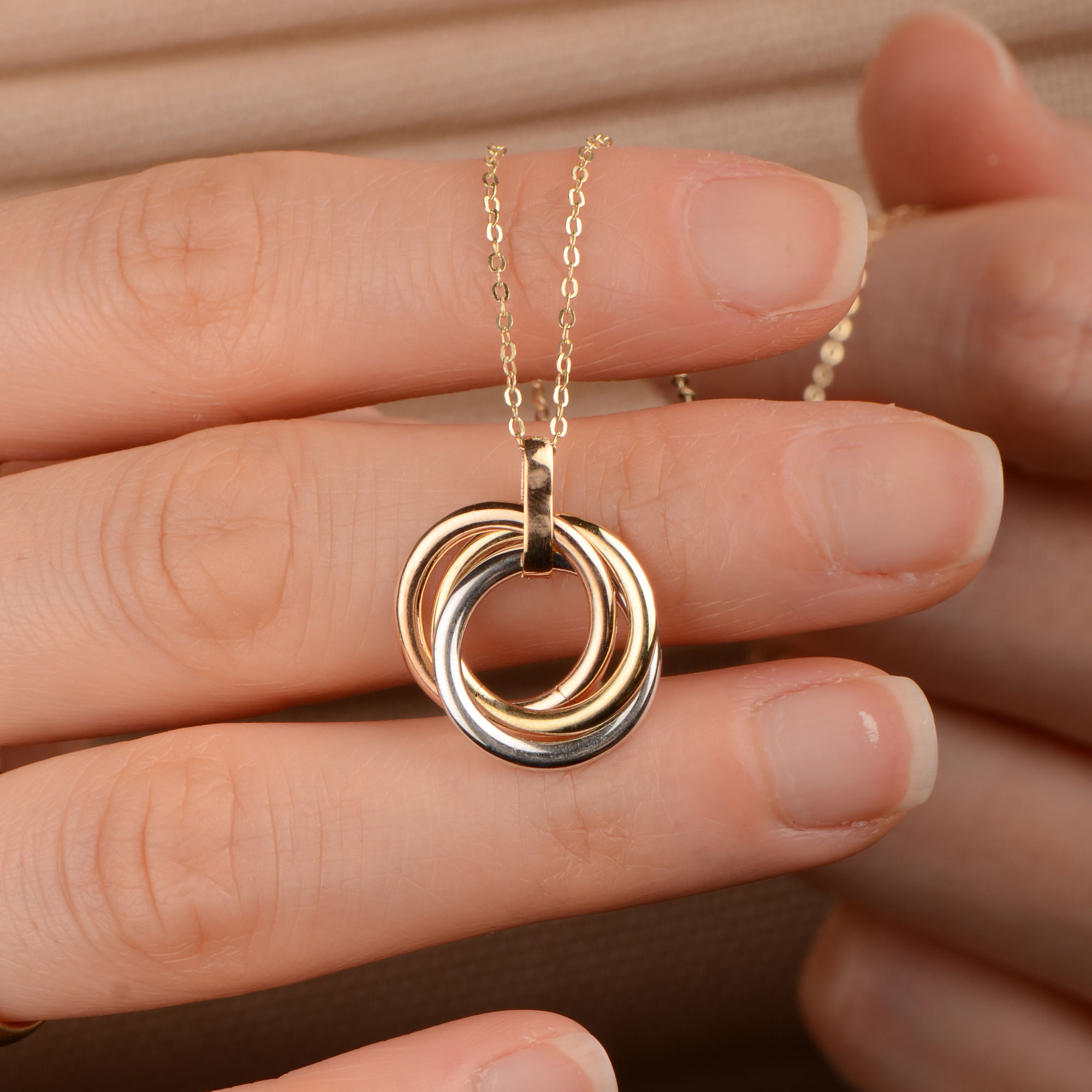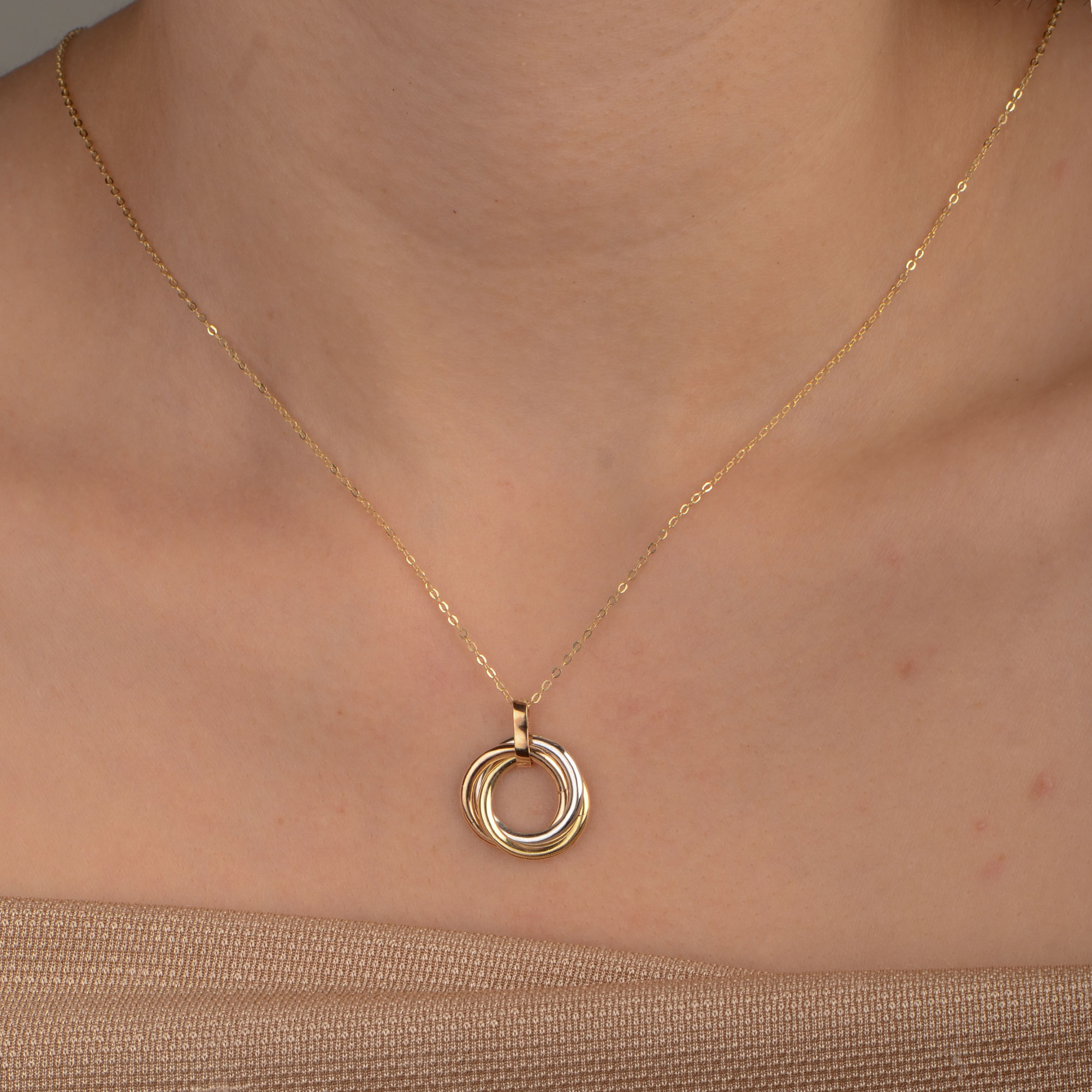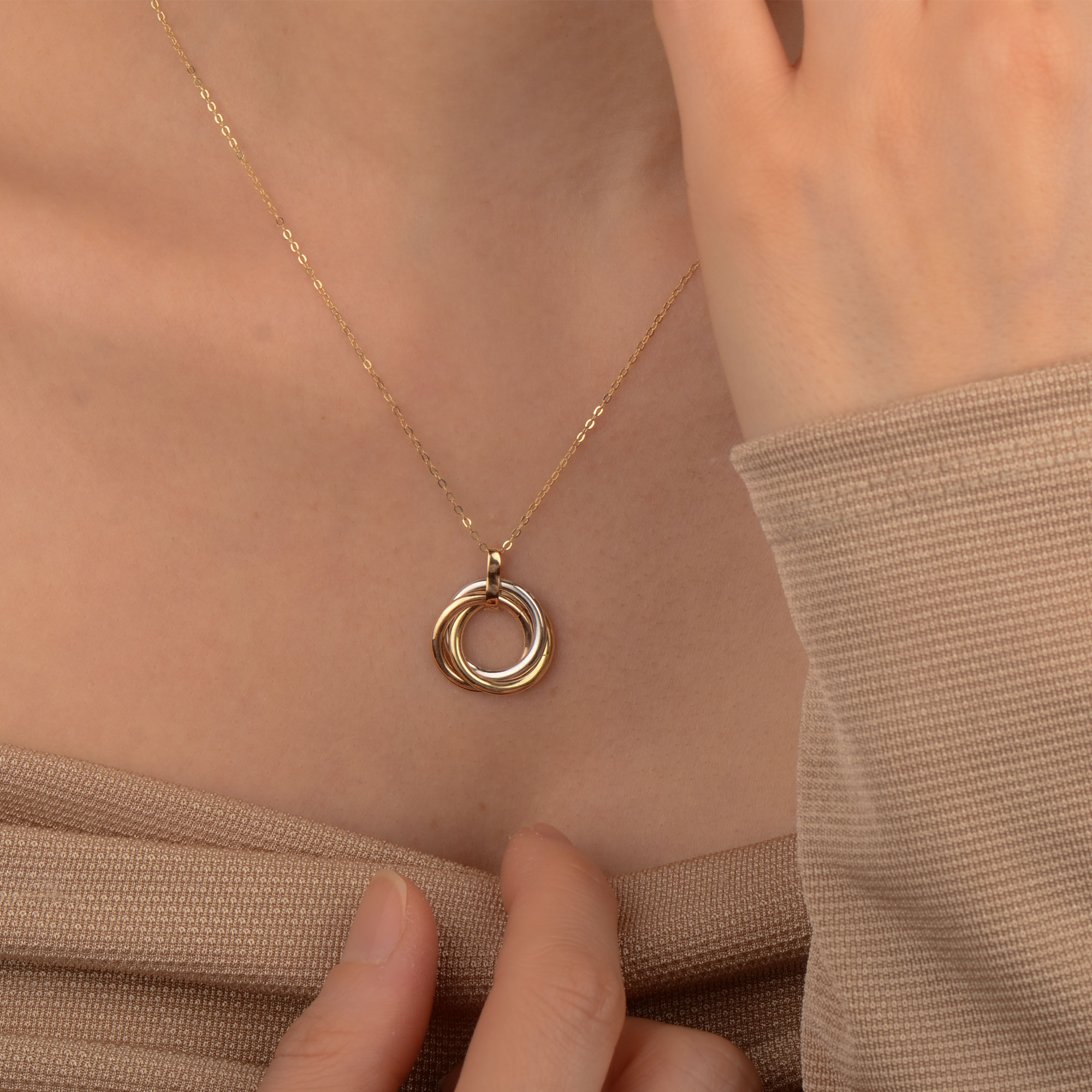3 renkli halka kolye tasarımı, altın takı dünyasında modern ve estetik bir görünüm sunar. Halka formu sade bir stil oluştururken farklı renk tonlarının kullanımı kolyeye hareket ve zarafet kazandırır. Bu tasarım özellikle minimal takı severler tarafından tercih edilen modeller arasındadır.