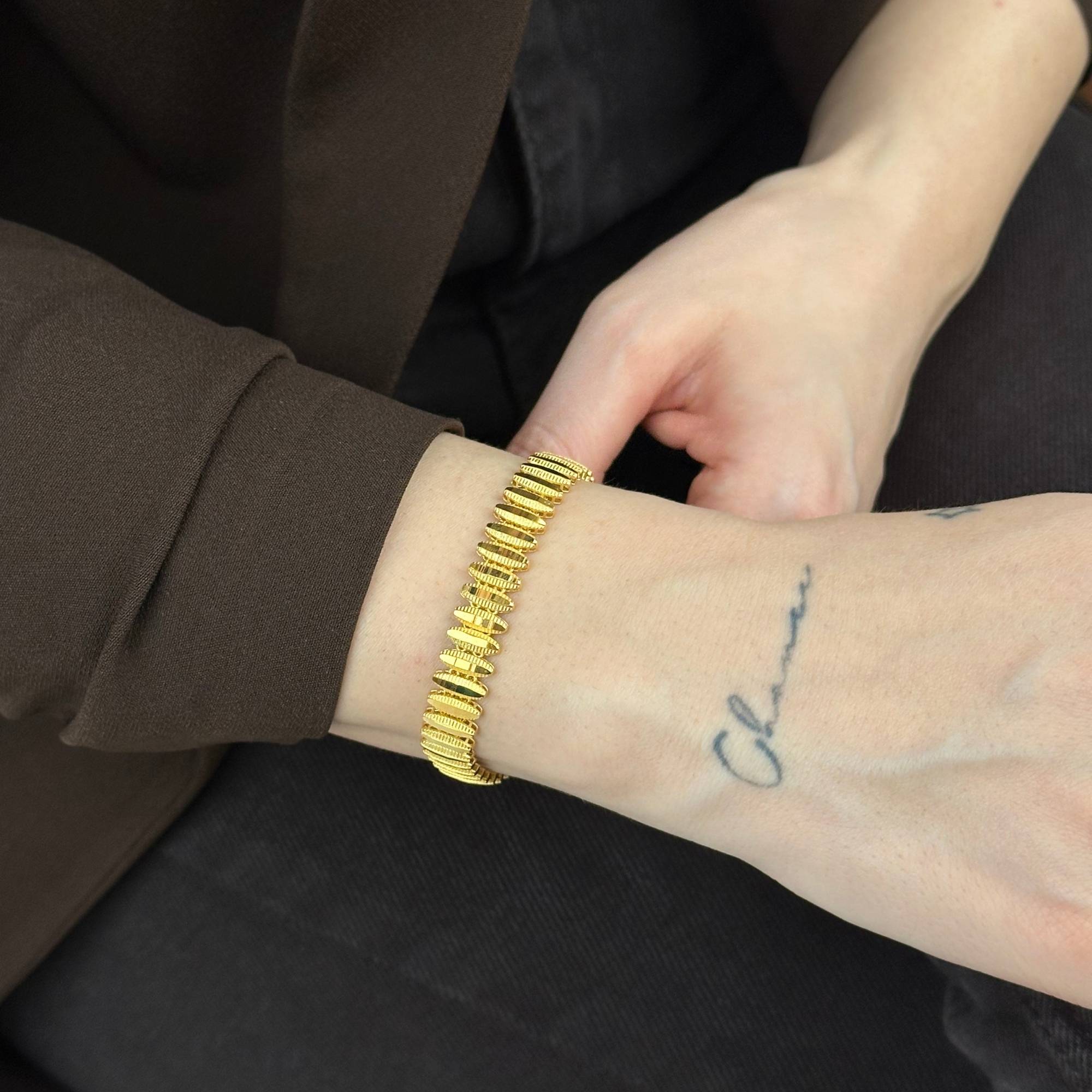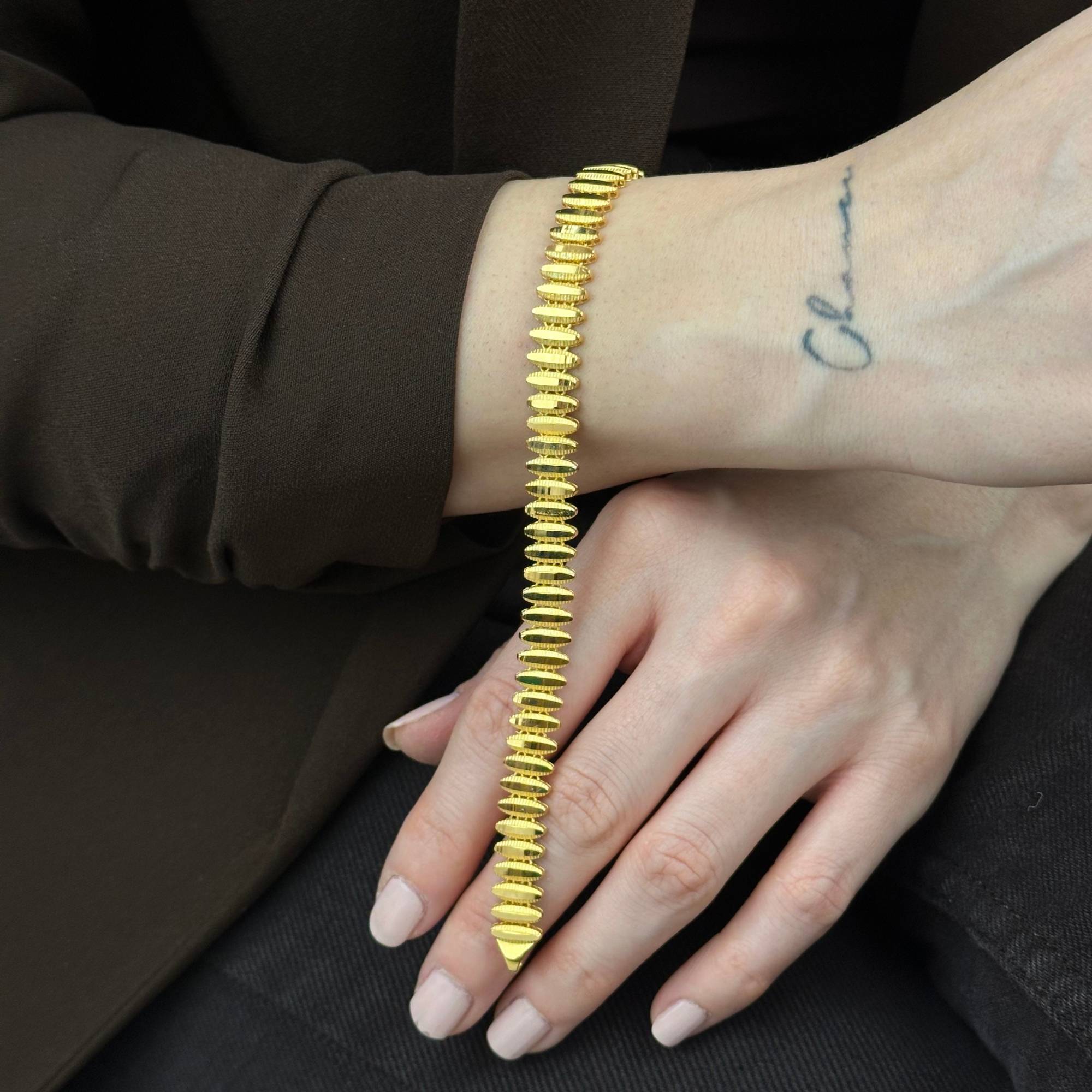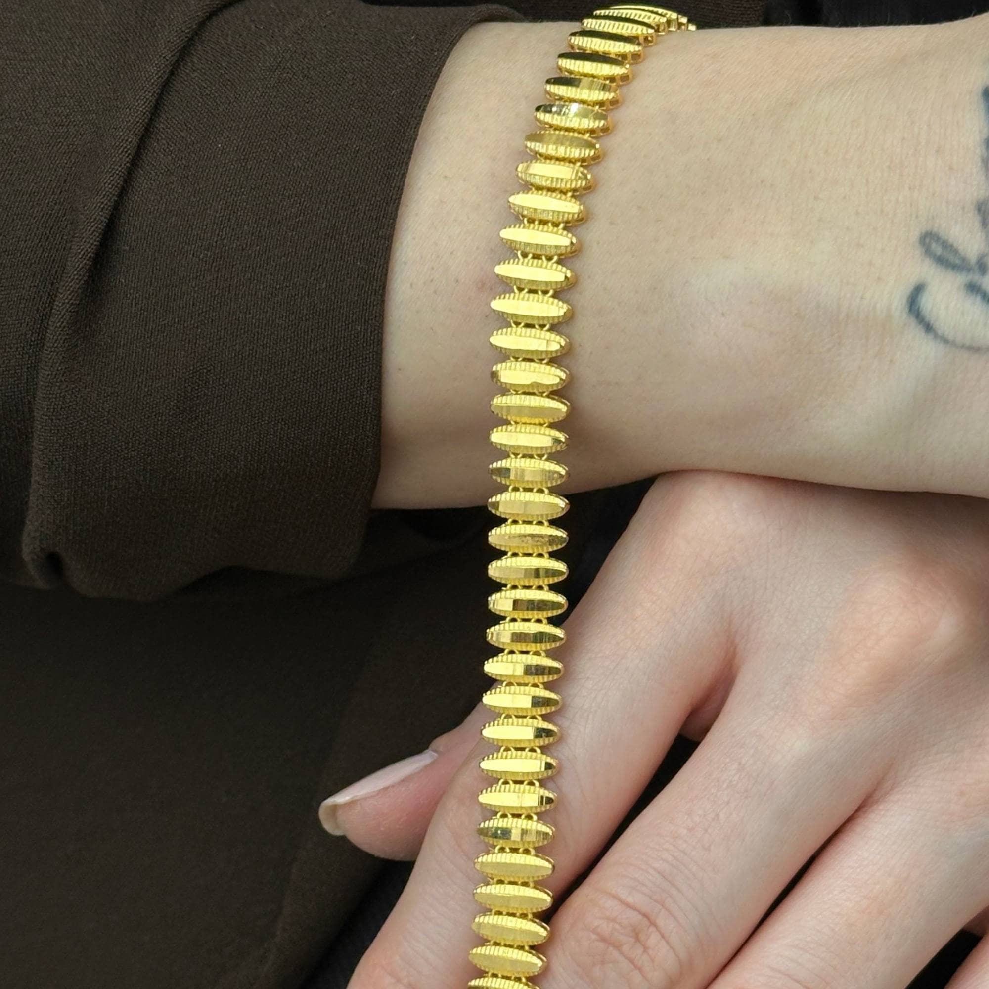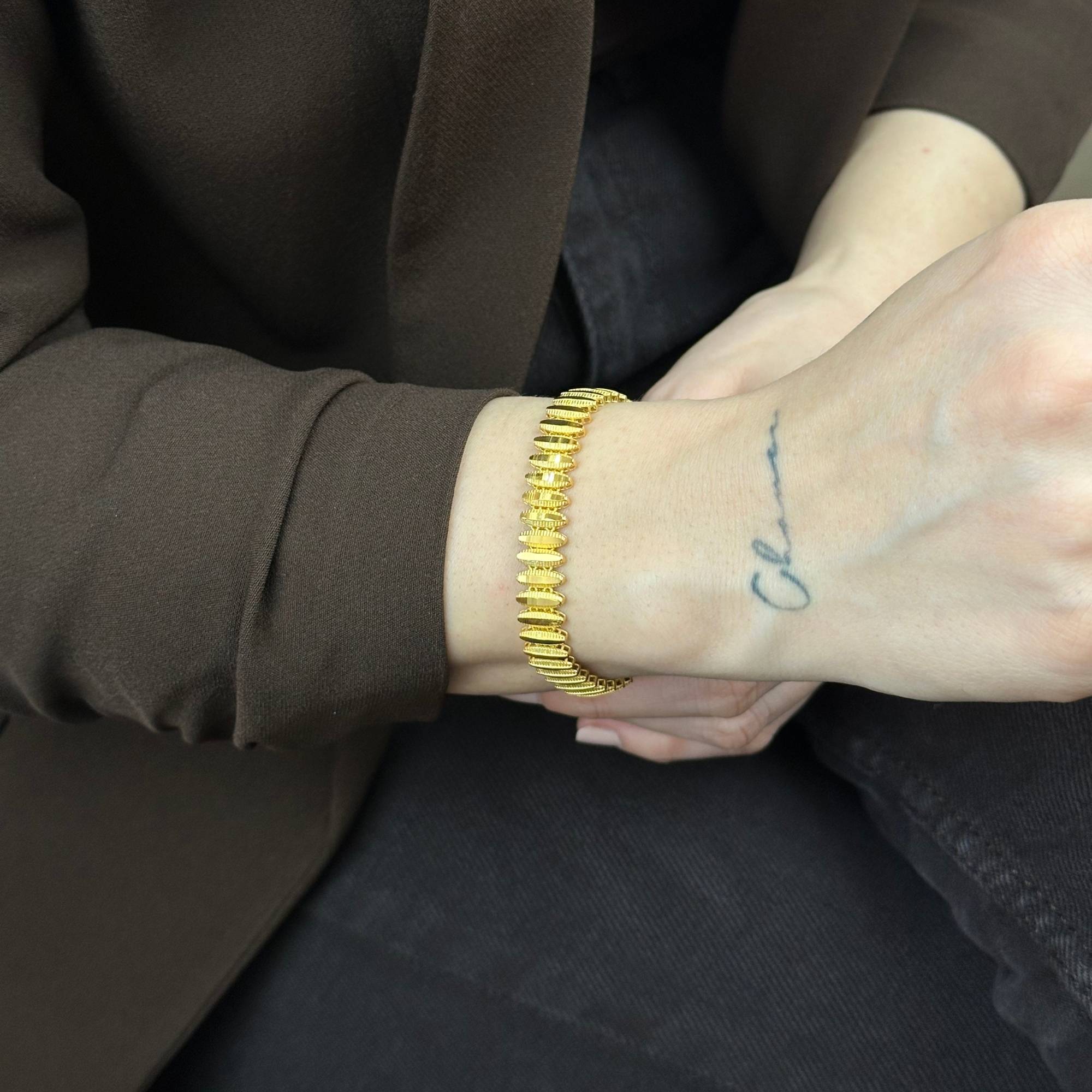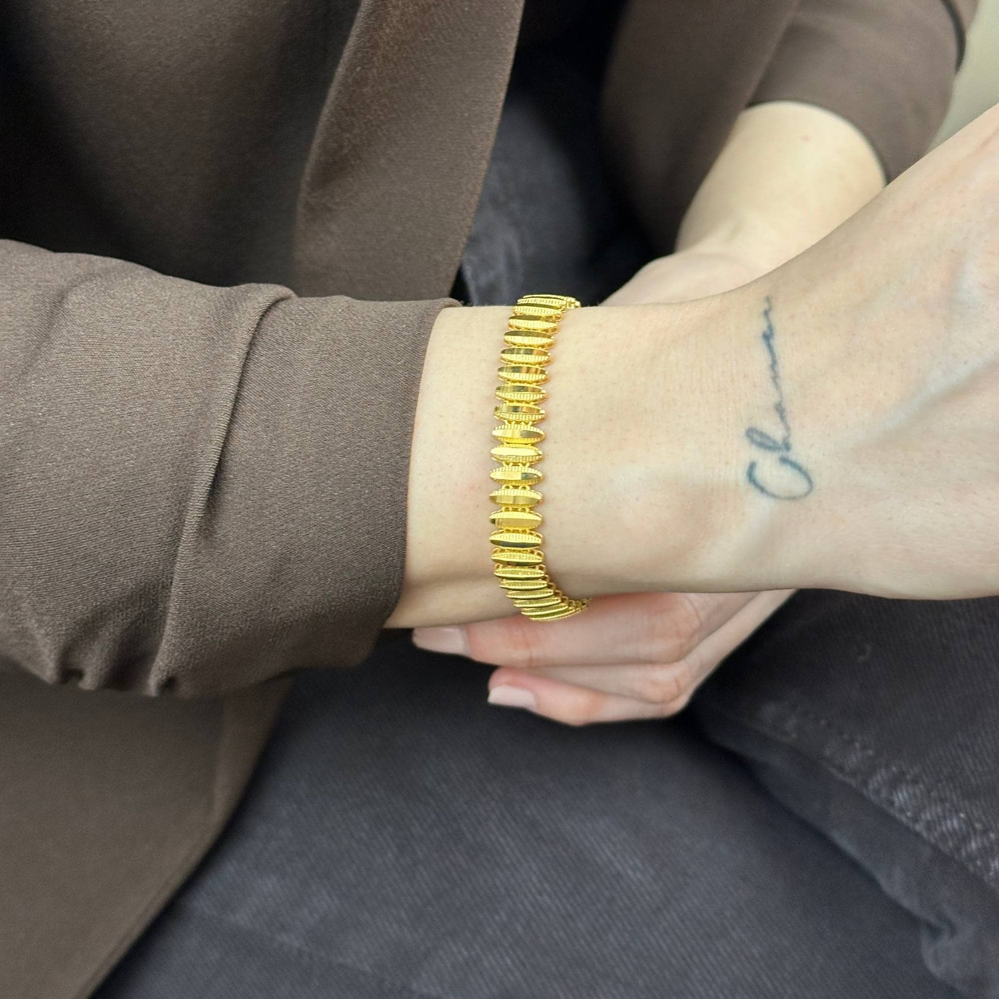 22 ayar altından üretilmiş kalemli ve sıralı ajda bileklik modeli, modern, şık ve zarif tasarımıyla günlük kullanım için idealdir. Sarı altın rengiyle güçlü ve sofistike bir görünüm sunar; Sevgililer Günü ve yıldönümü için değerli bir hediye alternatifidir. Sertifikalı altın yapısı, güvenli ödeme altyapısı, ücretsiz kargo, sigortalı kargo ve kredi kartına 3 taksit imkanı ile sunulmaktadır. Güncel fiyat bilgisi ürün sayfasında yer almaktadır.