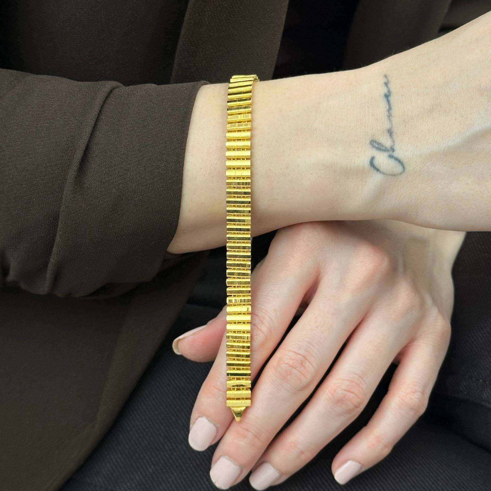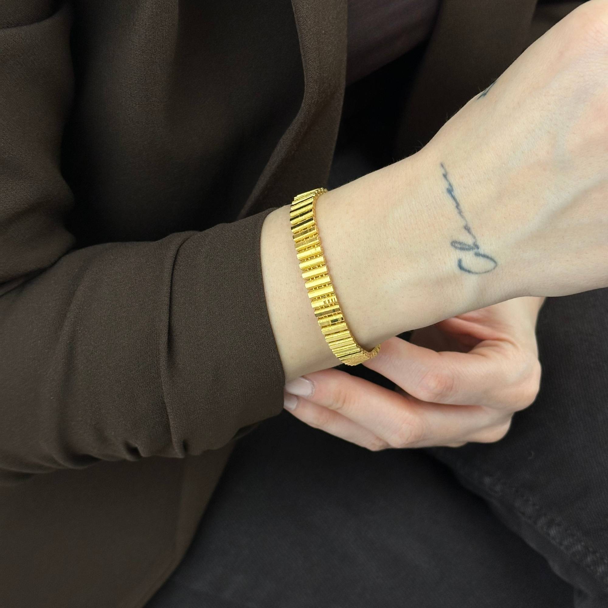 22 ayar altından üretilmiş kalemli ve sıralı ajda bileklik, modern ve zarif tasarımıyla öne çıkar. 17,55 gram ağırlığa sahip bu özel model, sarı altın rengiyle güçlü bir duruş sunar. Günlük kullanımın yanı sıra Sevgililer Günü ve yıldönümü için değerli bir hediye alternatifidir. Sertifikalı altın yapısı, ücretsiz kargo, sigortalı gönderim ve kredi kartına 3 taksit imkanı ile sunulmaktadır.