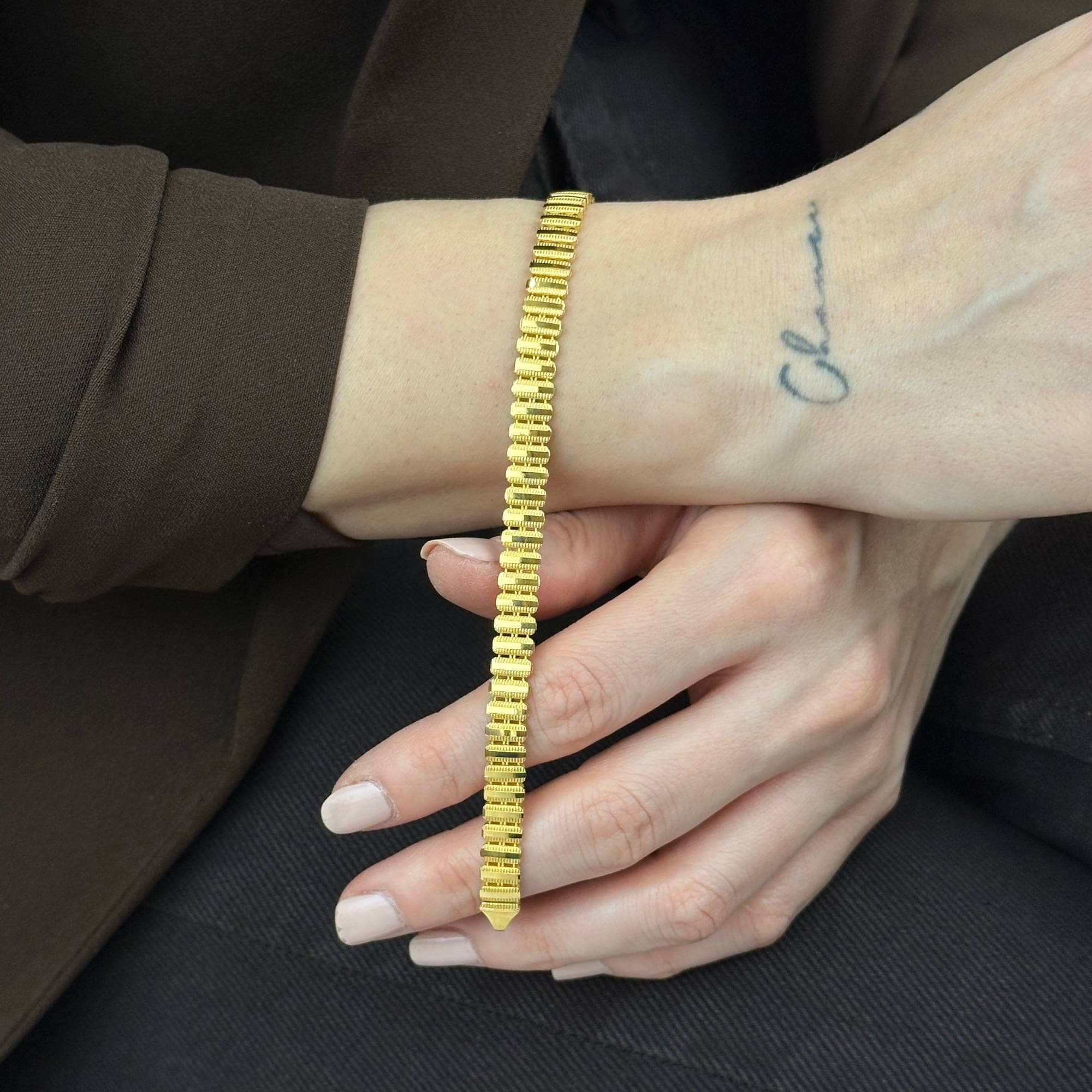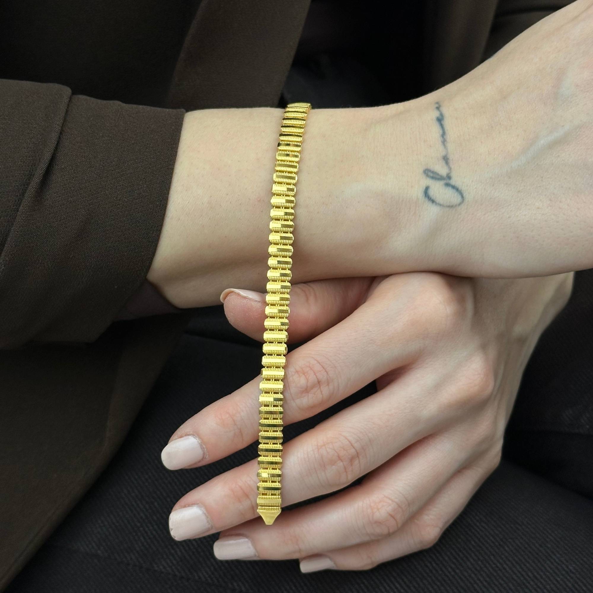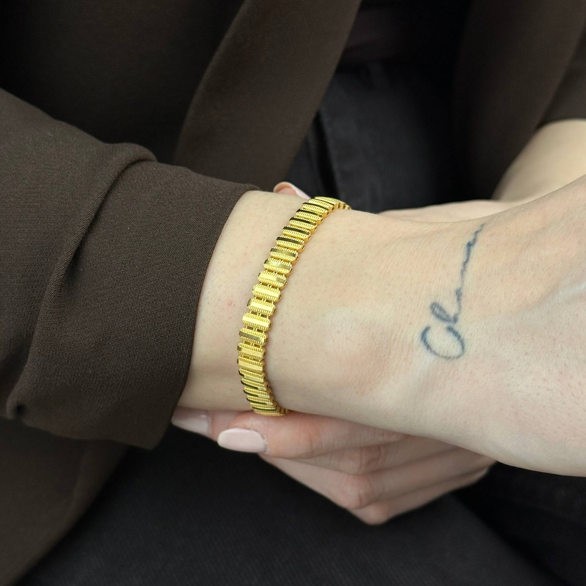 22 ayar altından üretilmiş kalemli ve sıralı ajda bileklik, modern ve şık tasarımıyla dikkat çeker. 20,03 gram ağırlığa sahip bu model, sarı altın rengiyle güçlü ve dengeli bir duruş sunar. Günlük kullanım için ideal olduğu gibi Sevgililer Günü ve yıldönümü hediyesi olarak da tercih edilebilir. Sertifikalı altın yapısı, ücretsiz kargo, sigortalı gönderim ve kredi kartına 3 taksit imkanı ile sunulmaktadır.