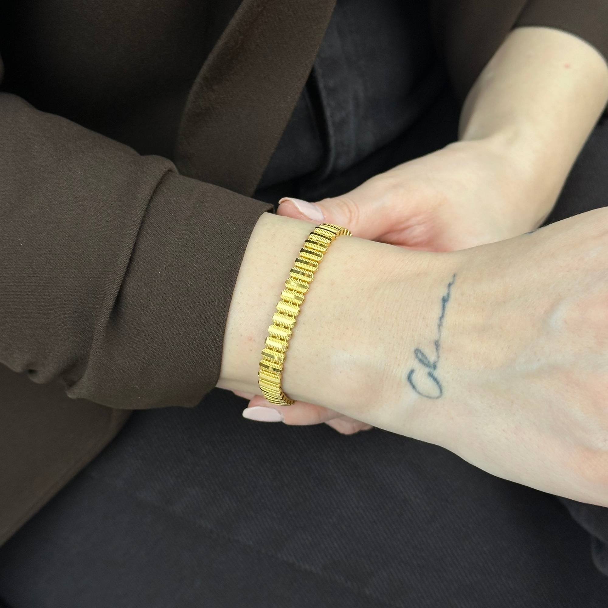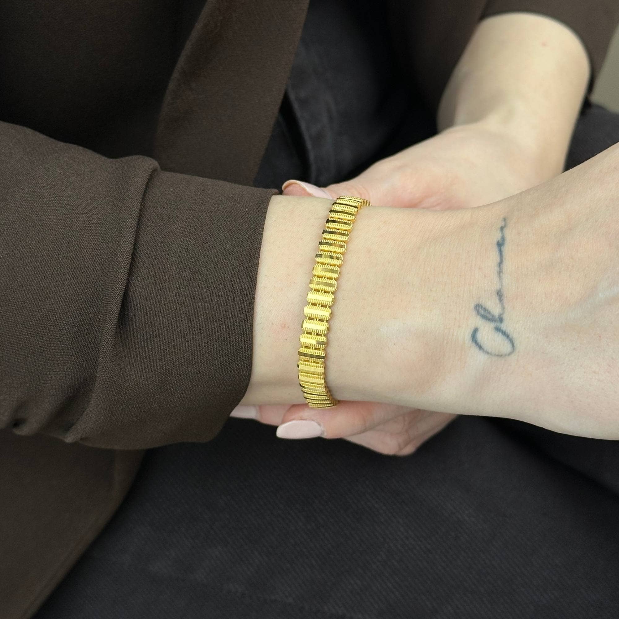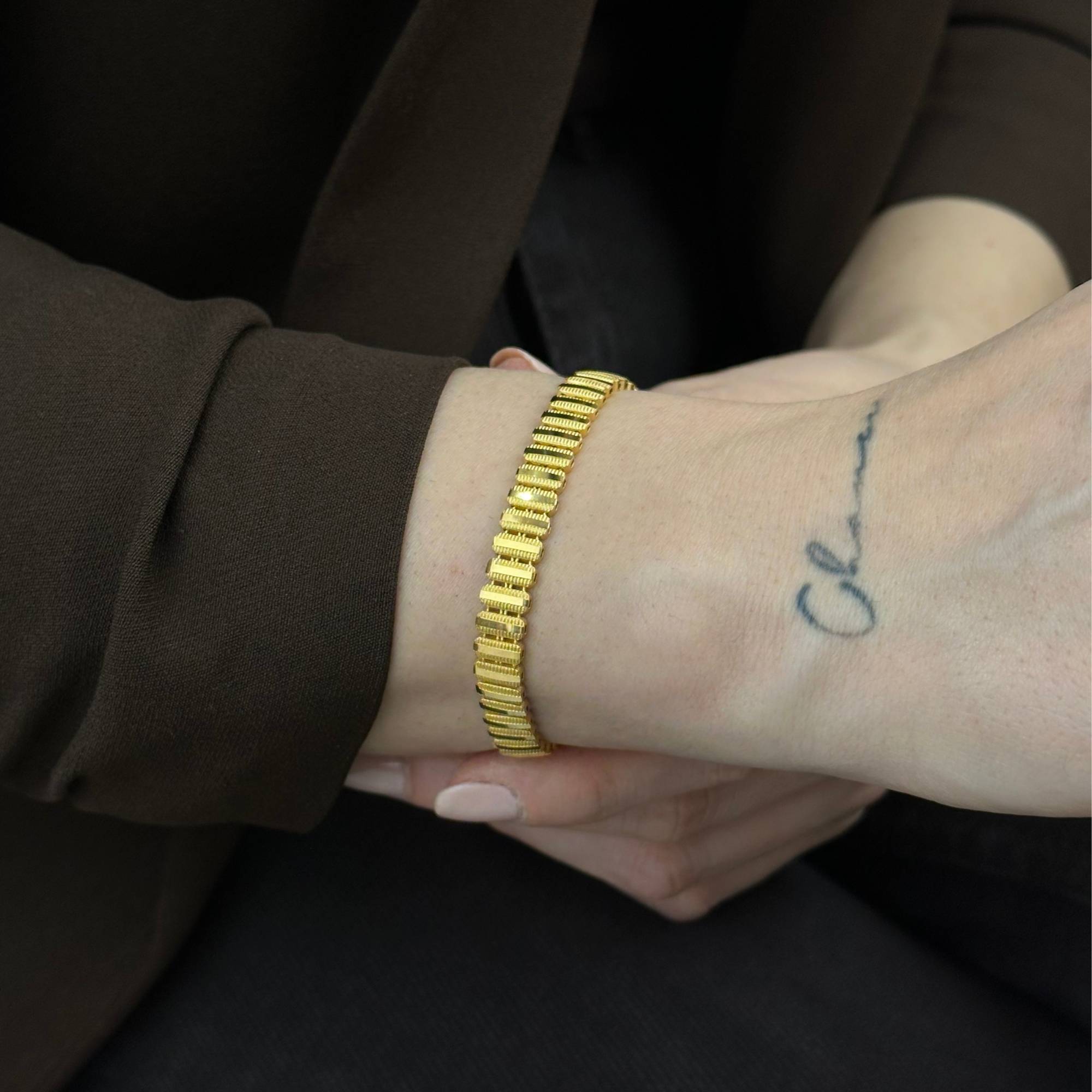 22 ayar altından üretilmiş kalemli ve sıralı ajda bileklik, modern ve şık tasarımıyla dikkat çeker. 20,03 gram ağırlığa sahip bu model, sarı altın rengiyle güçlü ve dengeli bir duruş sunar. Günlük kullanım için ideal olduğu gibi Sevgililer Günü ve yıldönümü hediyesi olarak da tercih edilebilir. Sertifikalı altın yapısı, ücretsiz kargo, sigortalı gönderim ve kredi kartına 3 taksit imkanı ile sunulmaktadır.