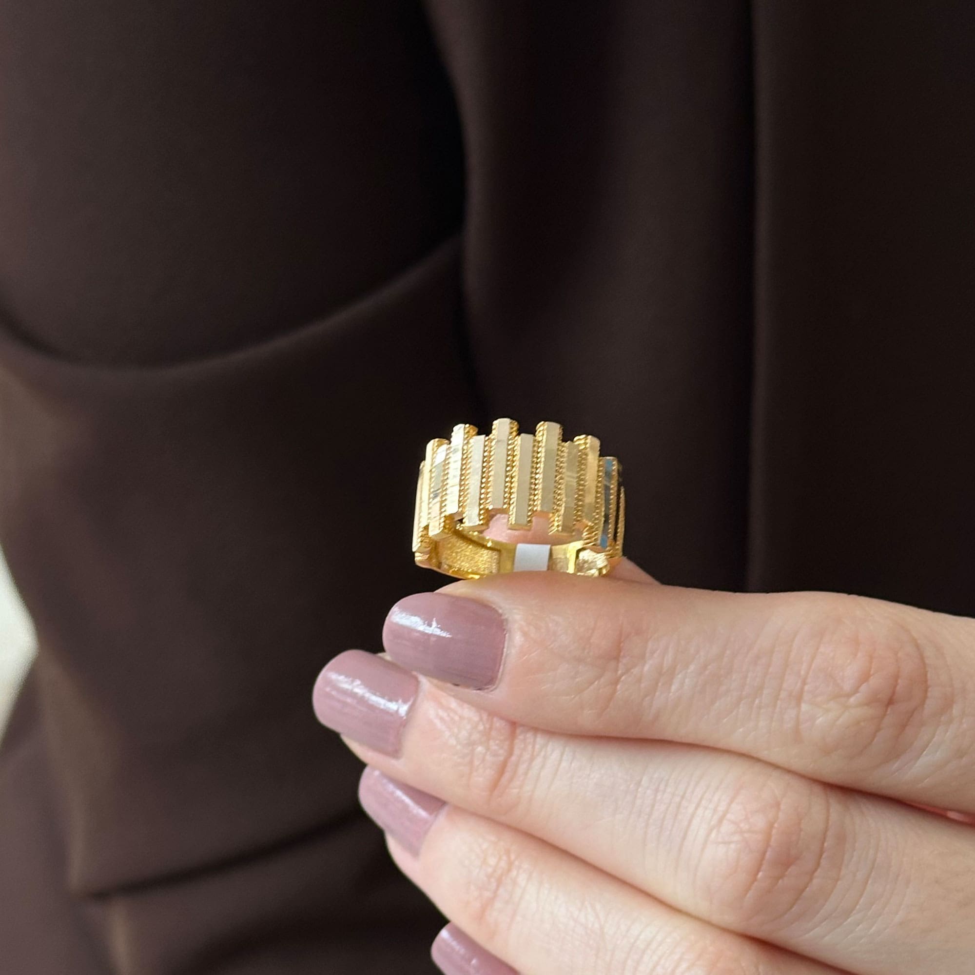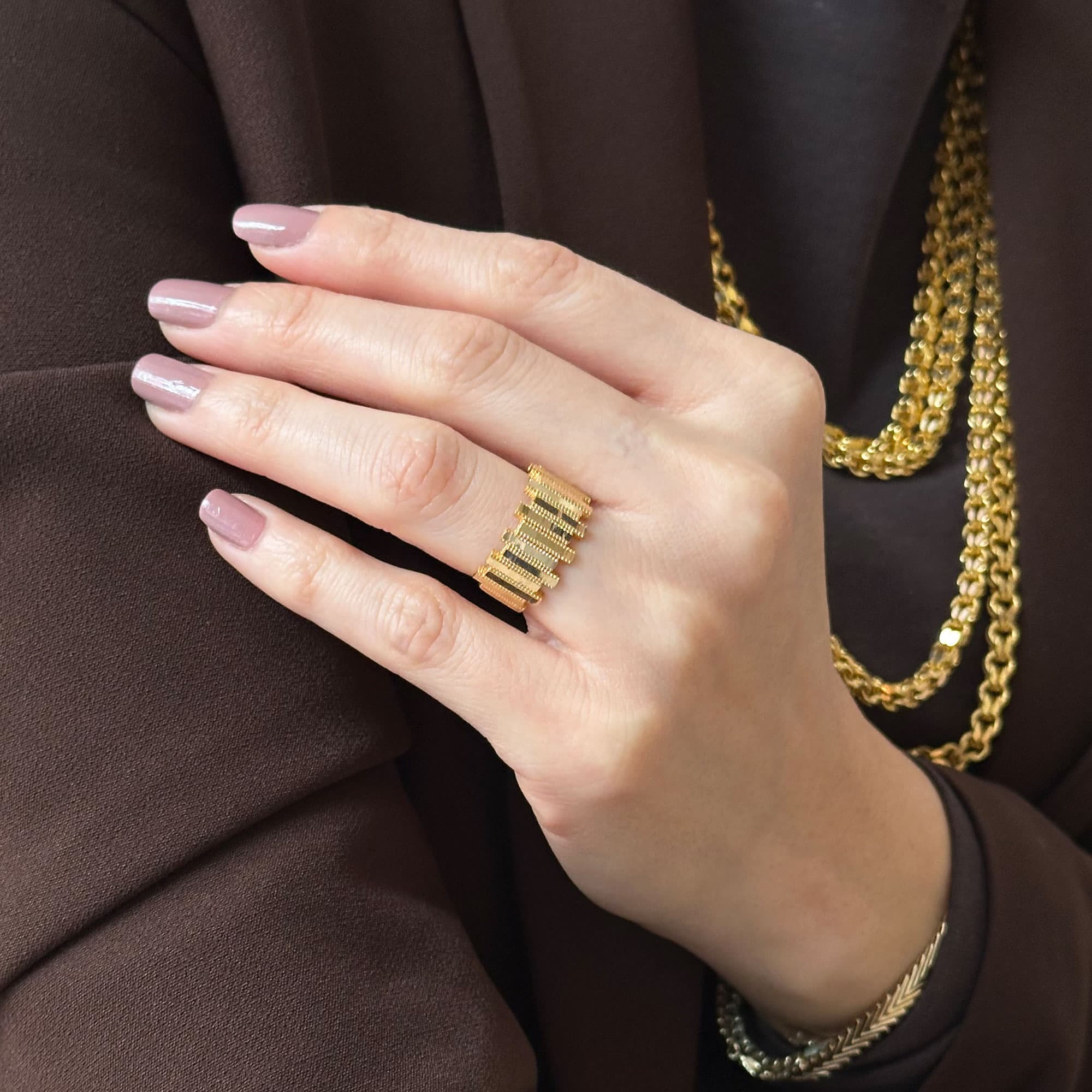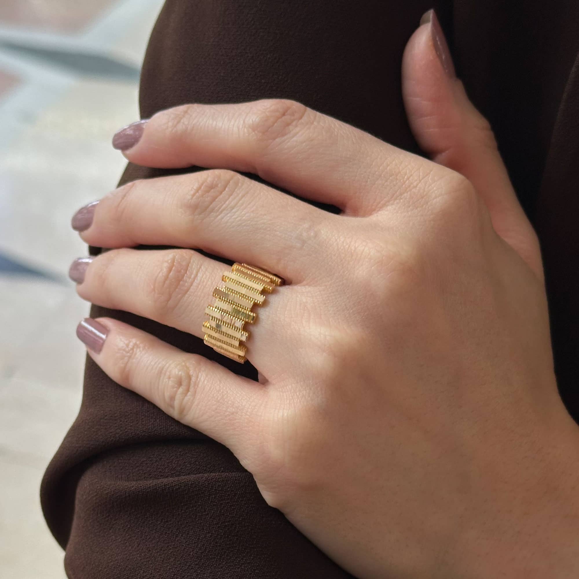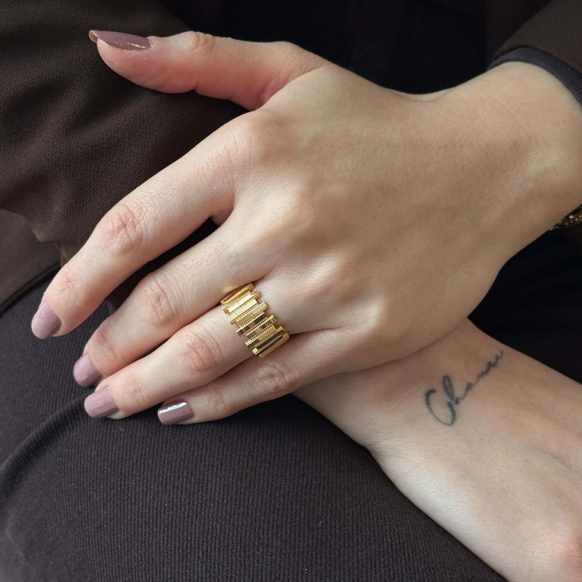 Ajda Yüzük – 14 Ayar Altın Ritim Işıltısı Tasarım, modern çizgileri zarif bir ritim dokusuyla birleştiren özel bir takı modelidir. 14 ayar altının sıcak tonları, yüzüğün yüzeyindeki ritmik kıvrımlar ile uyum içinde parlayarak hem günlük kullanımda hem de özel davetlerde sofistike bir görünüm yaratır. Minimal ama etkileyici tasarımı sayesinde farklı takılarla rahatça kombinlenebilir. Şık, anlamlı ve zamansız bir hediye alternatifi arayanlar için de ideal bir seçimdir. Engin Kuyumculuk güvencesiyle sunulan bu ajda yüzük, uzun yıllar severek kullanılacak kaliteli ve estetik bir altın takıdır.