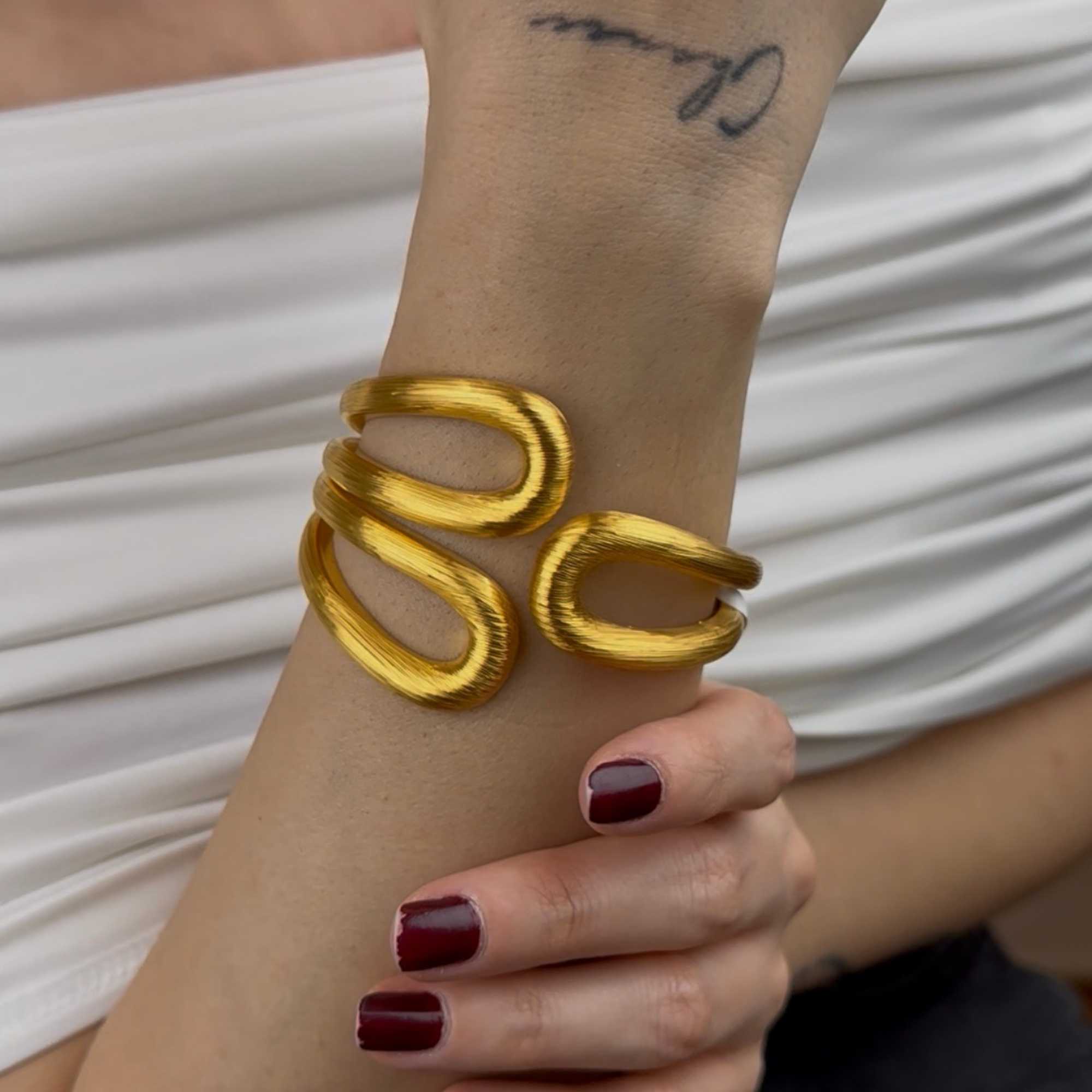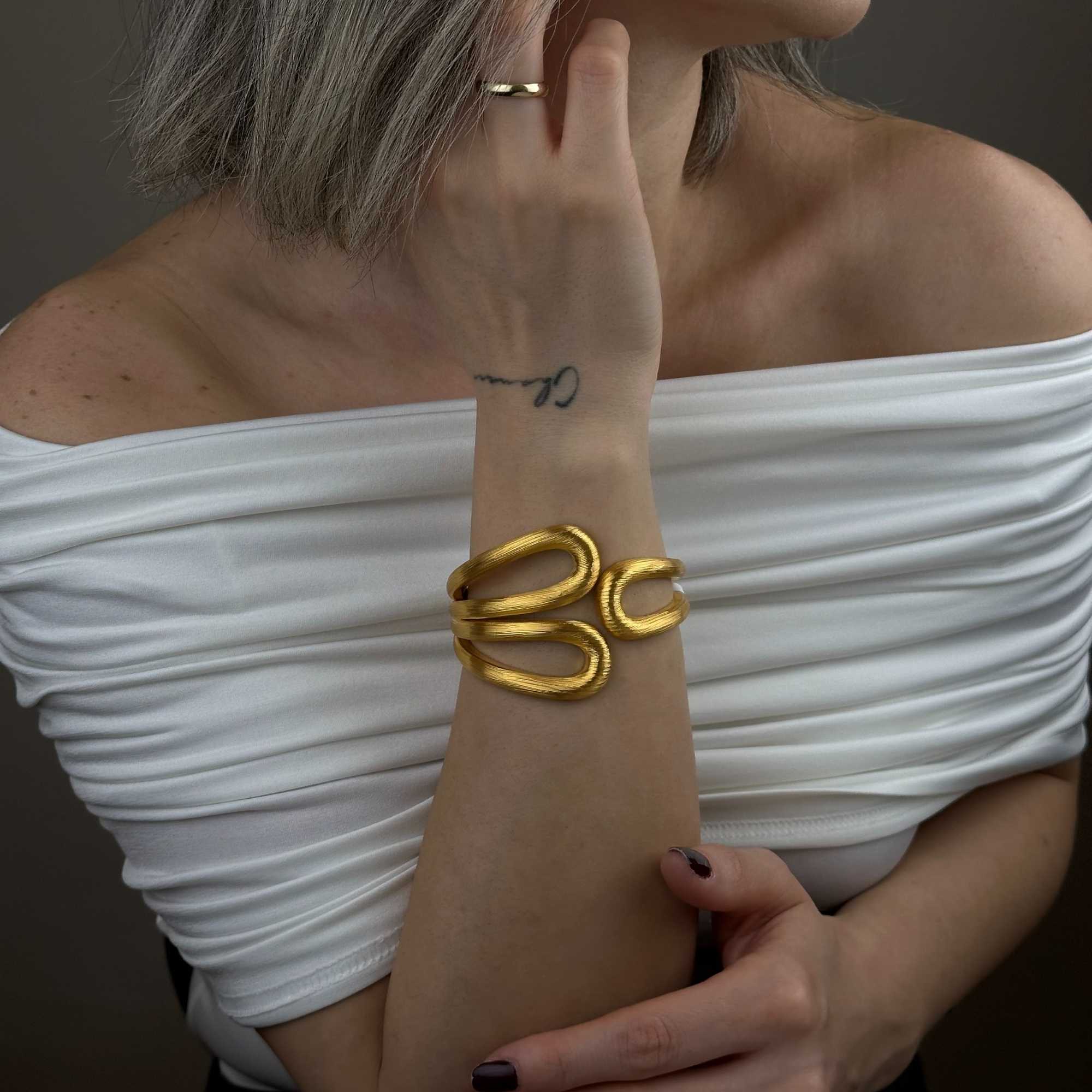 İtalyan tasarımın modern çizgileri, mat yüzeyle birleşerek güçlü ve sofistike bir duruş yaratır. Kelepçe formu, bileziğe zamansız bir karakter kazandırır.