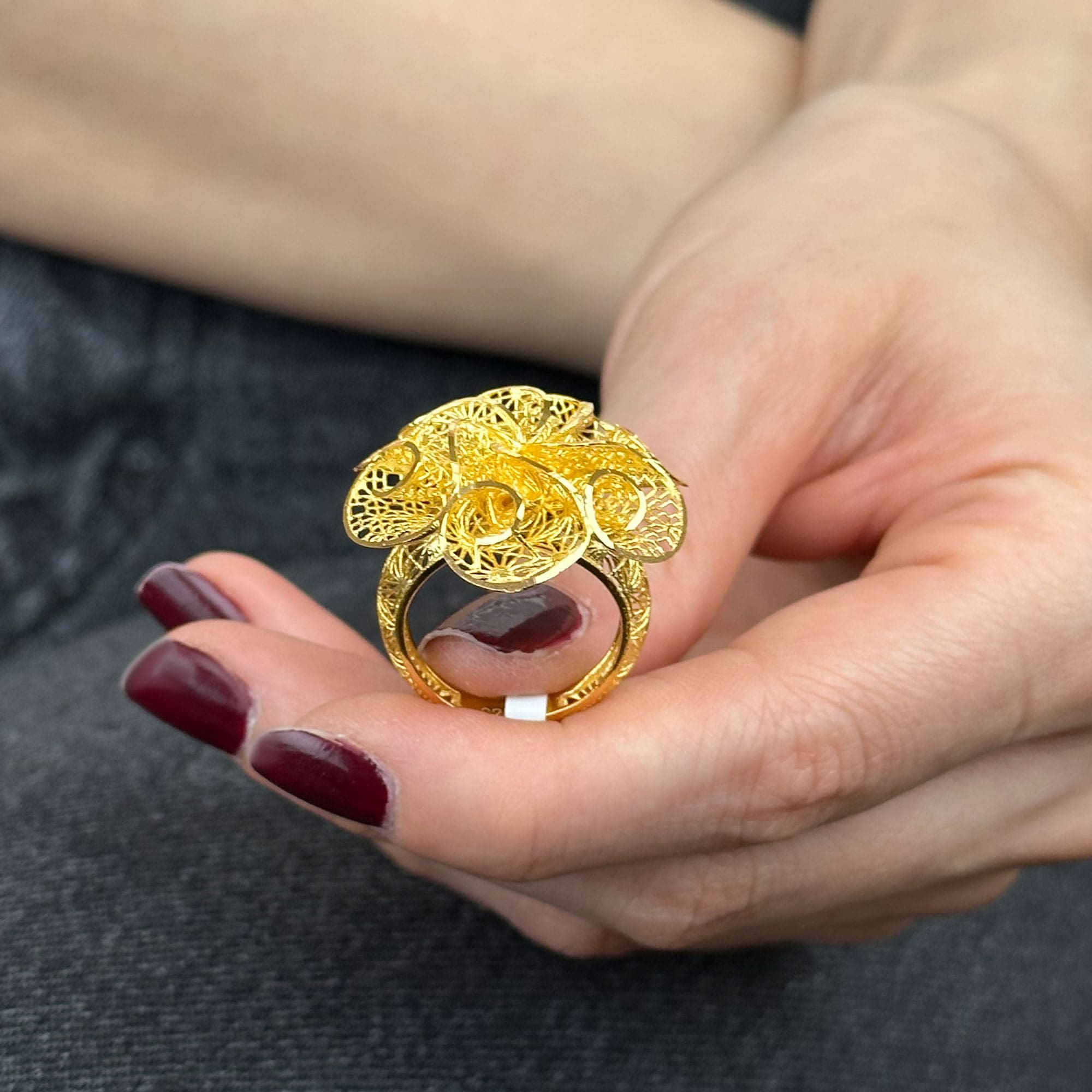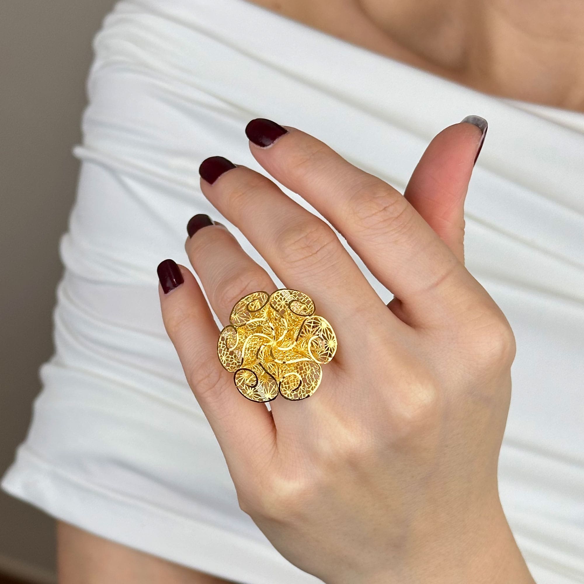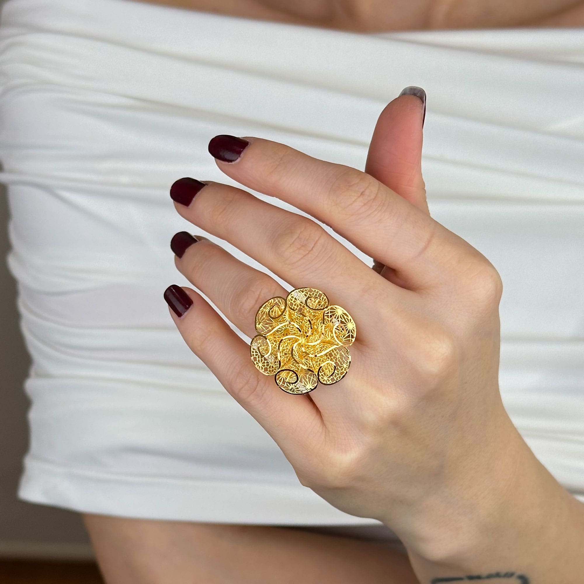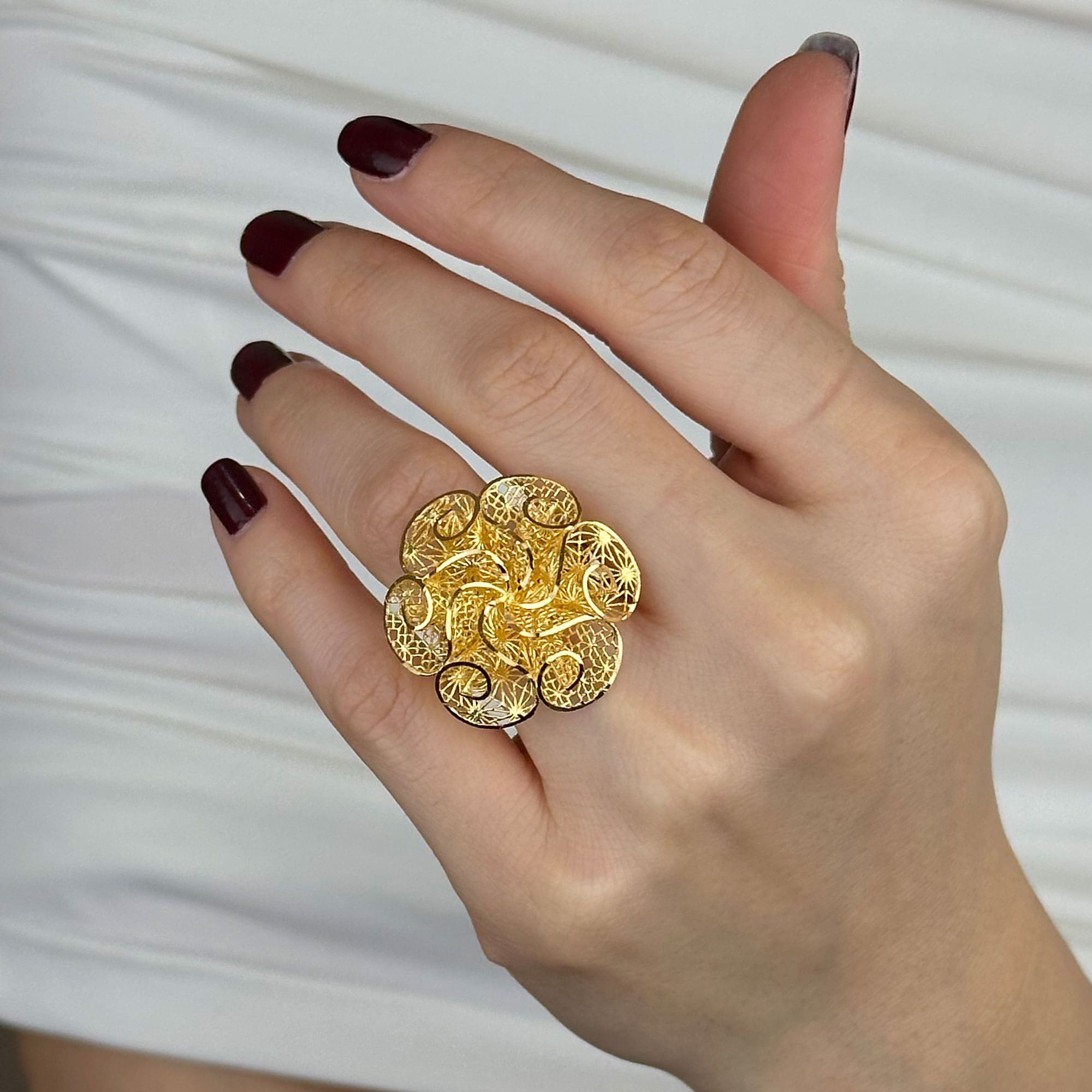 22 ayar altın çiçek yüzük, tül çiçekten ilham alan formu ve dengeli yapısıyla gösterişli ama zarif bir duruş sunar. Günlük kullanımda şık bir tamamlayıcı, özel günlerde ise prestijli ve anlamlı bir hediye alternatifi olarak öne çıkar.